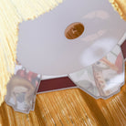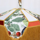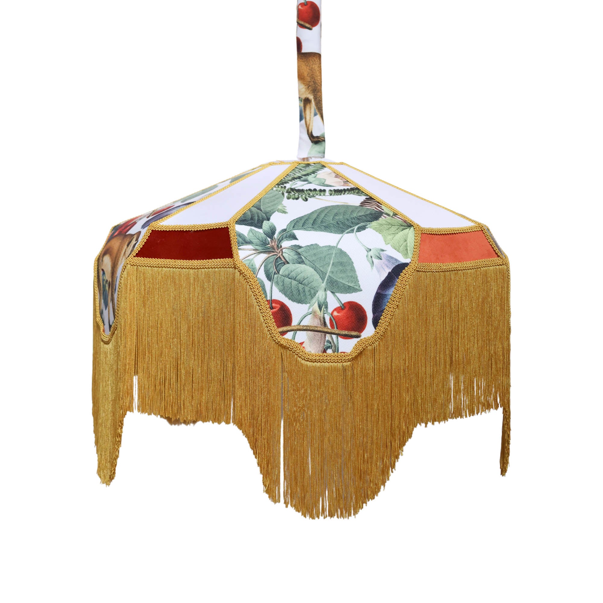 Featuring a blend of playful animal motifs, lush botanical prints, and rich velvet accents, this chandelier is a true conversation starter. Its geometric panels are highlighted by gold trim and adorned with long, flowing golden fringe, adding a sense of opulence and vintage charm.