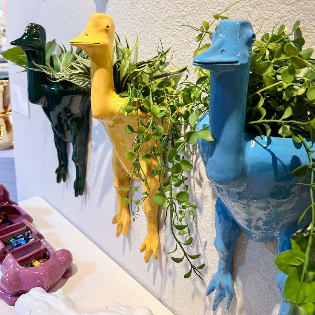 This glossy ceramic ostrich is a wall-mounted bowl built to hold flowers, keys, incense, candy, or whatever you're into. Hang it high and let the legs dangle with pride.