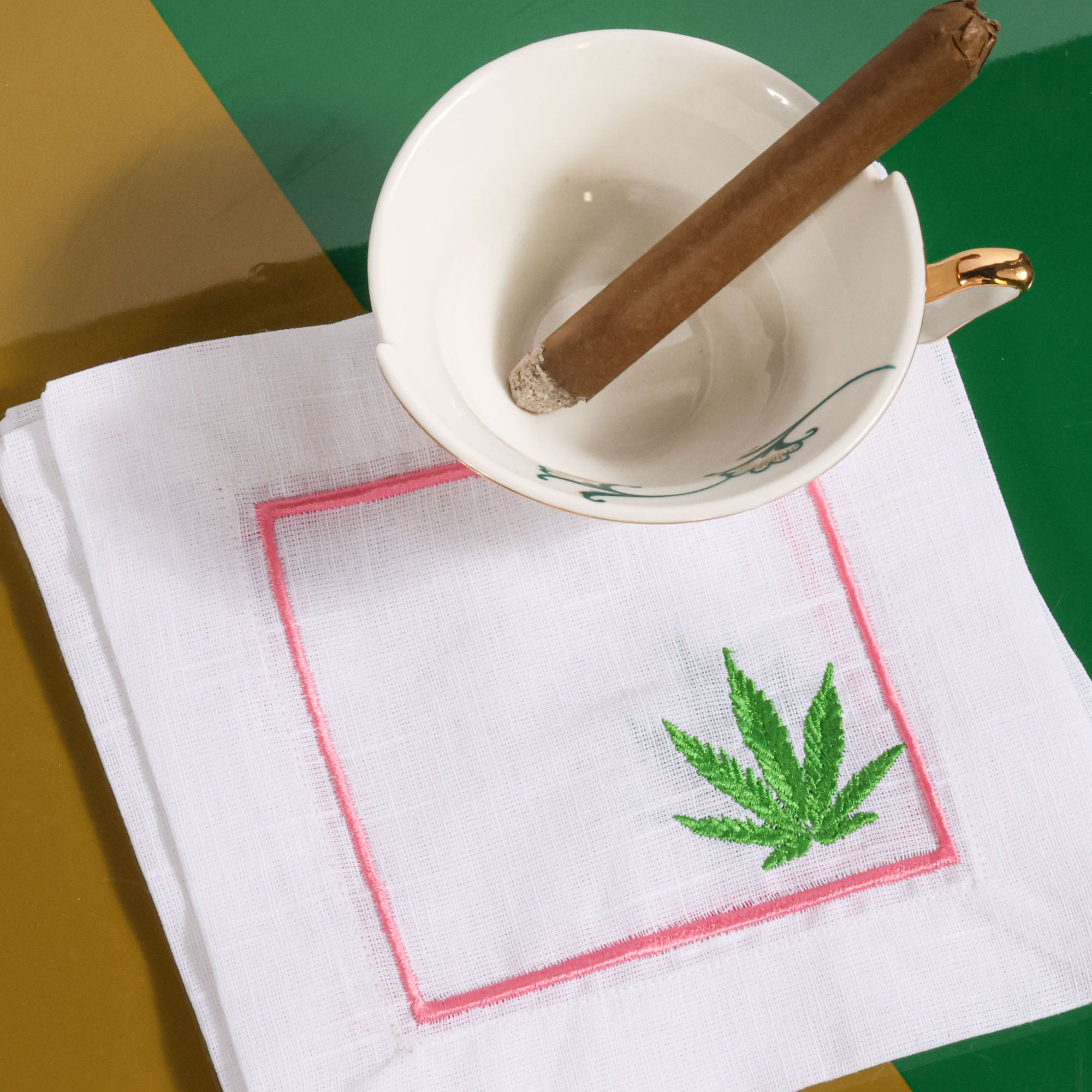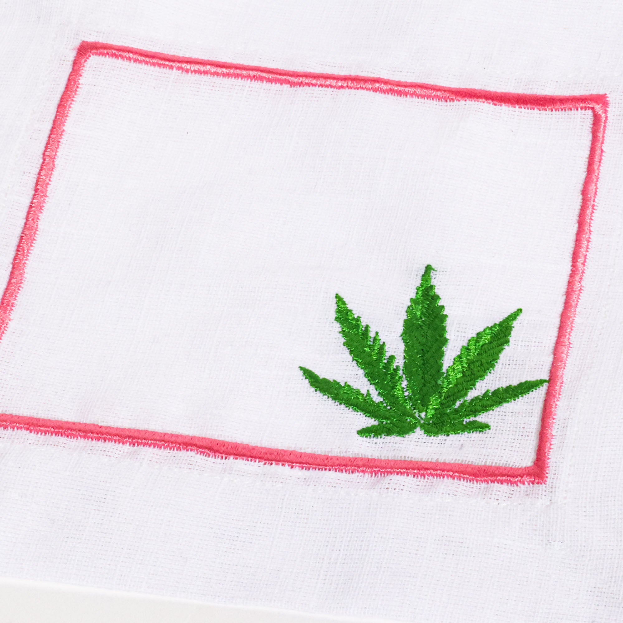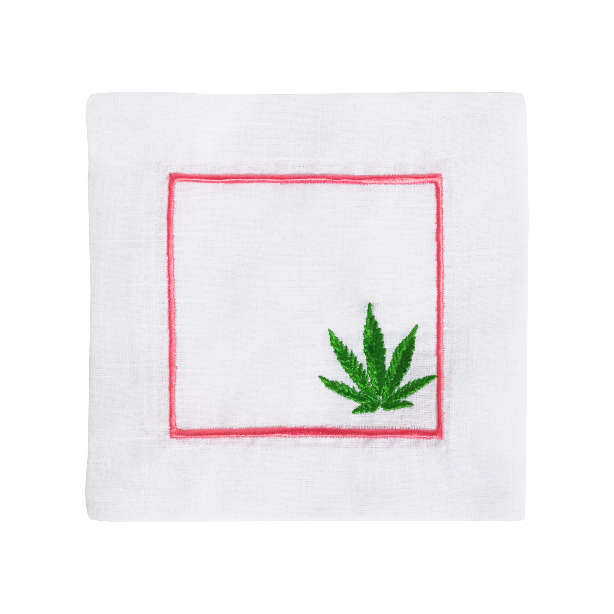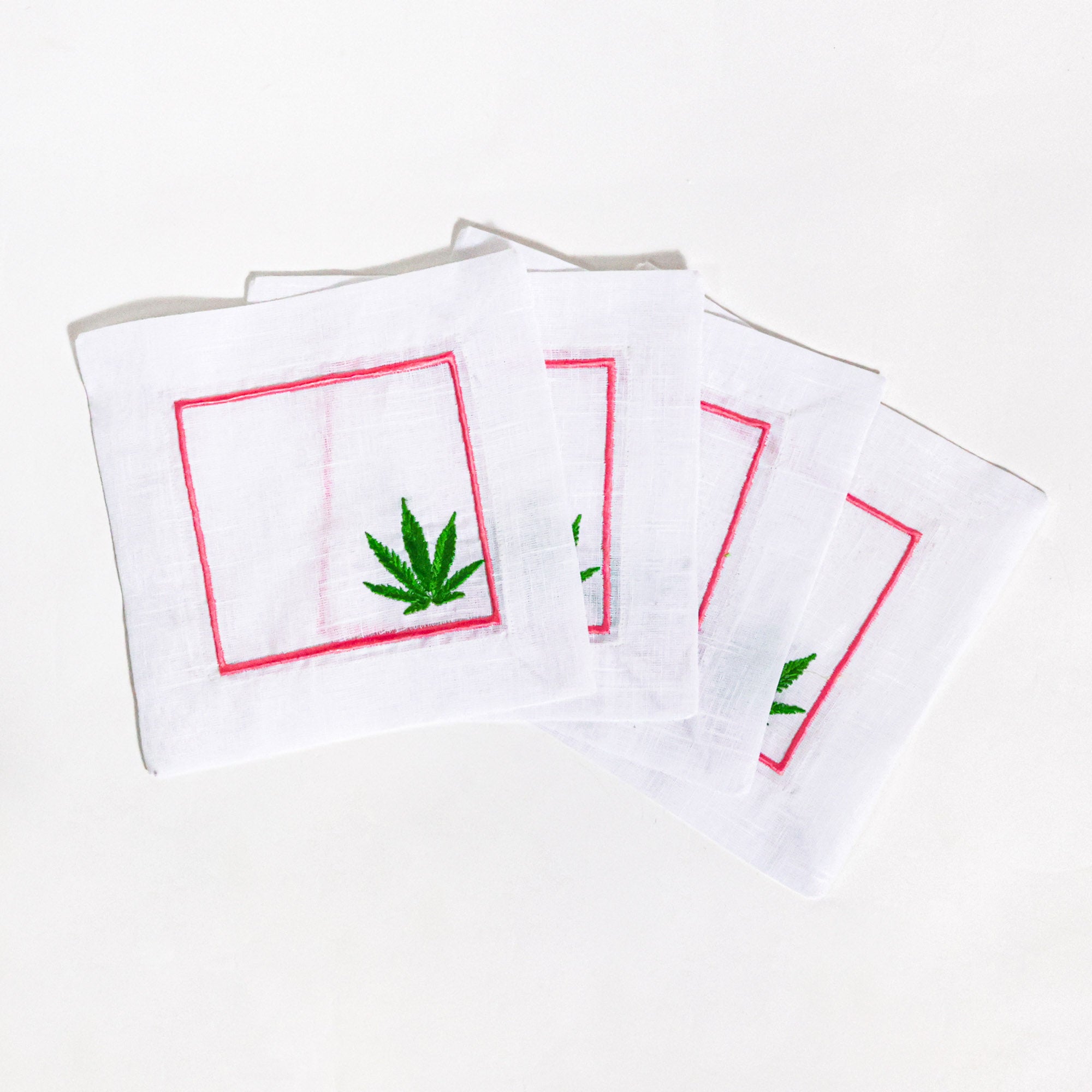 Set of 4 hand-embroidered, Scout-exclusive cocktail napkins featuring a pink border and green leaf. These linen moment-makers are the perfect way to spice up your next cocktail hour!
