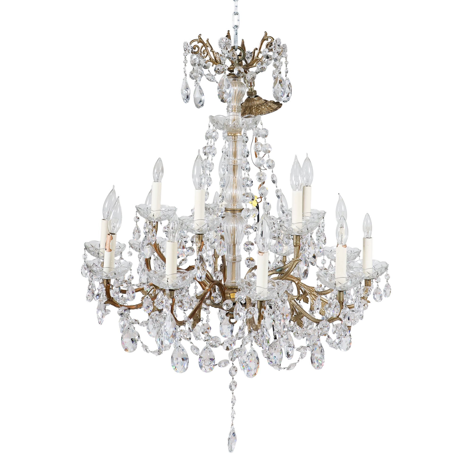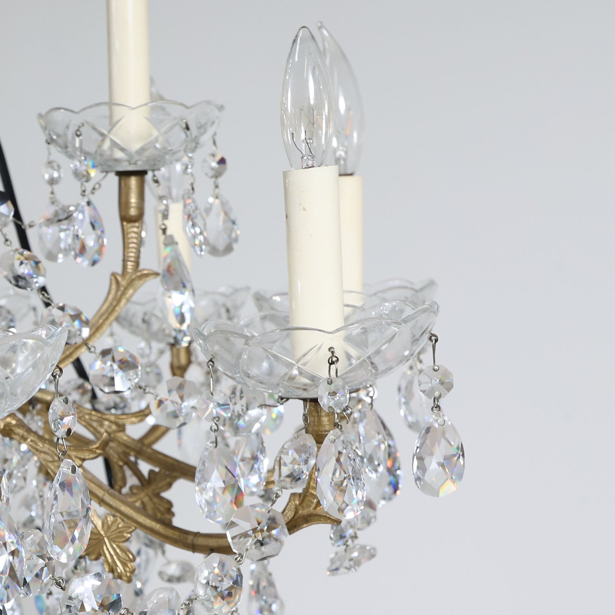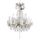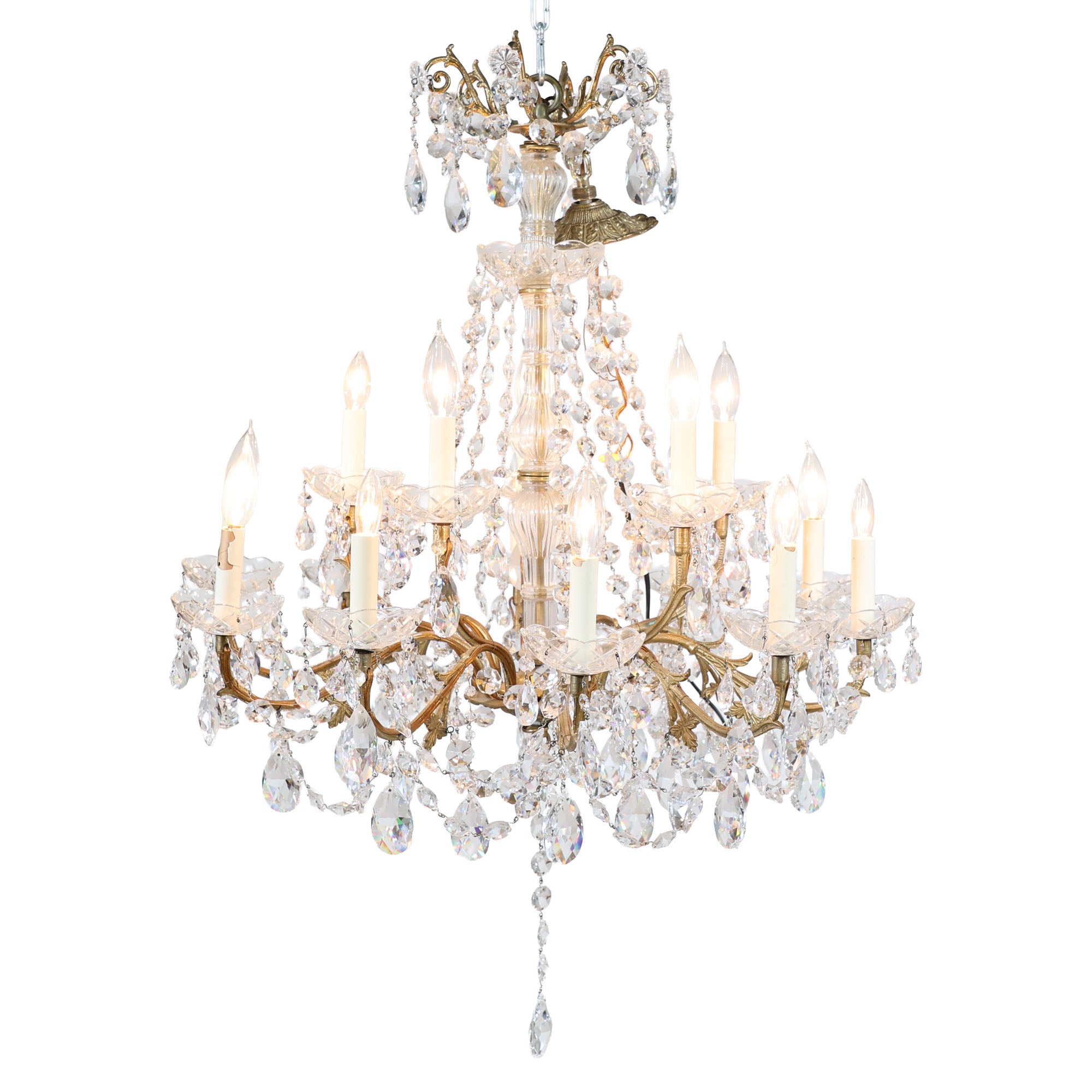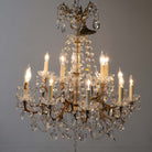 This vintage crystal chandelier is pure old-world glamour. A classic tiered silhouette with gracefully scrolling brass arms is completely draped in faceted crystal drops, prisms, and beaded swags that catch the light from every angle.