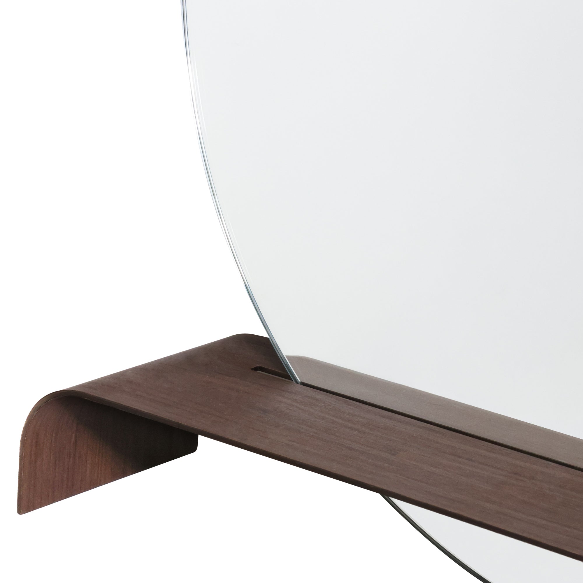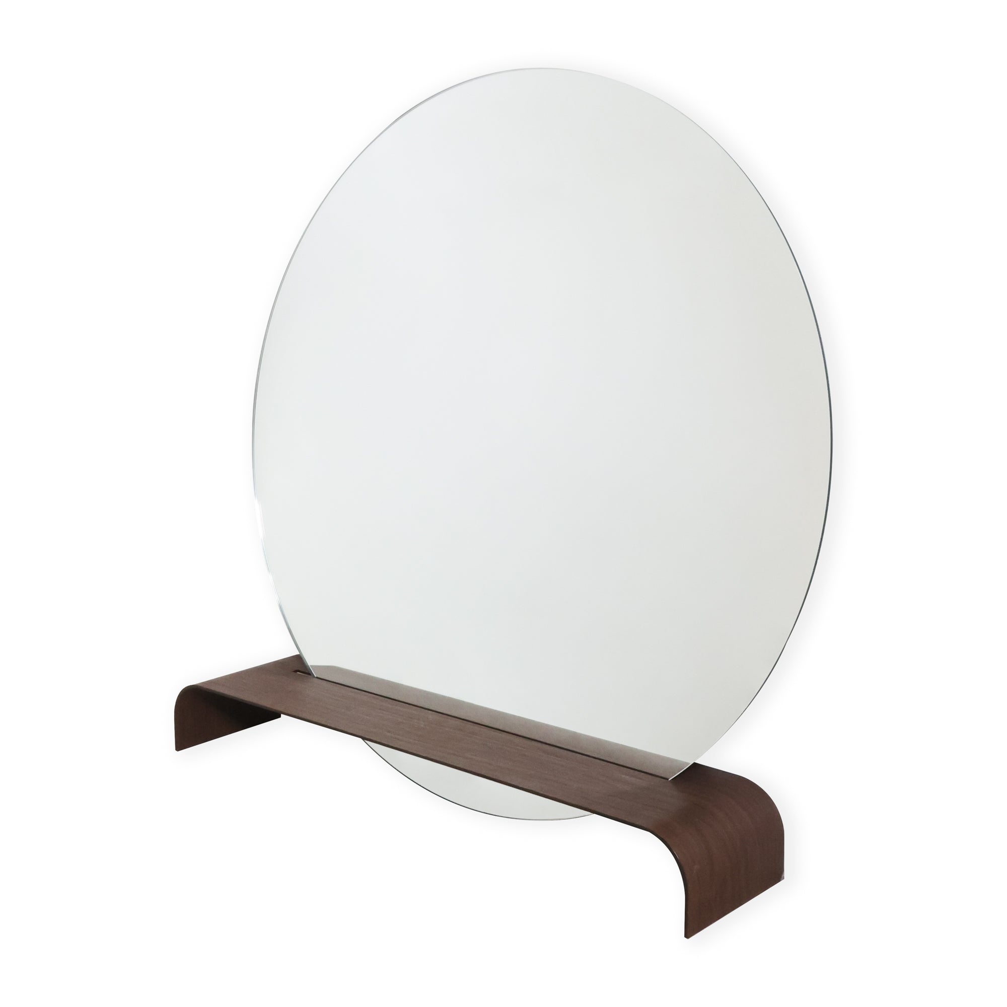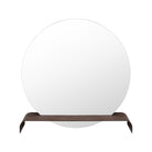The Overnight Mirror features a classic round mirror rising out of a chic waterfall shelf. The walnut veneer adds moody contrast to the openness created by the cutout on the shelf. Made to hang on the wall, this one's the perfect piece to show off your favorite decor or add some vibes to the vanity!