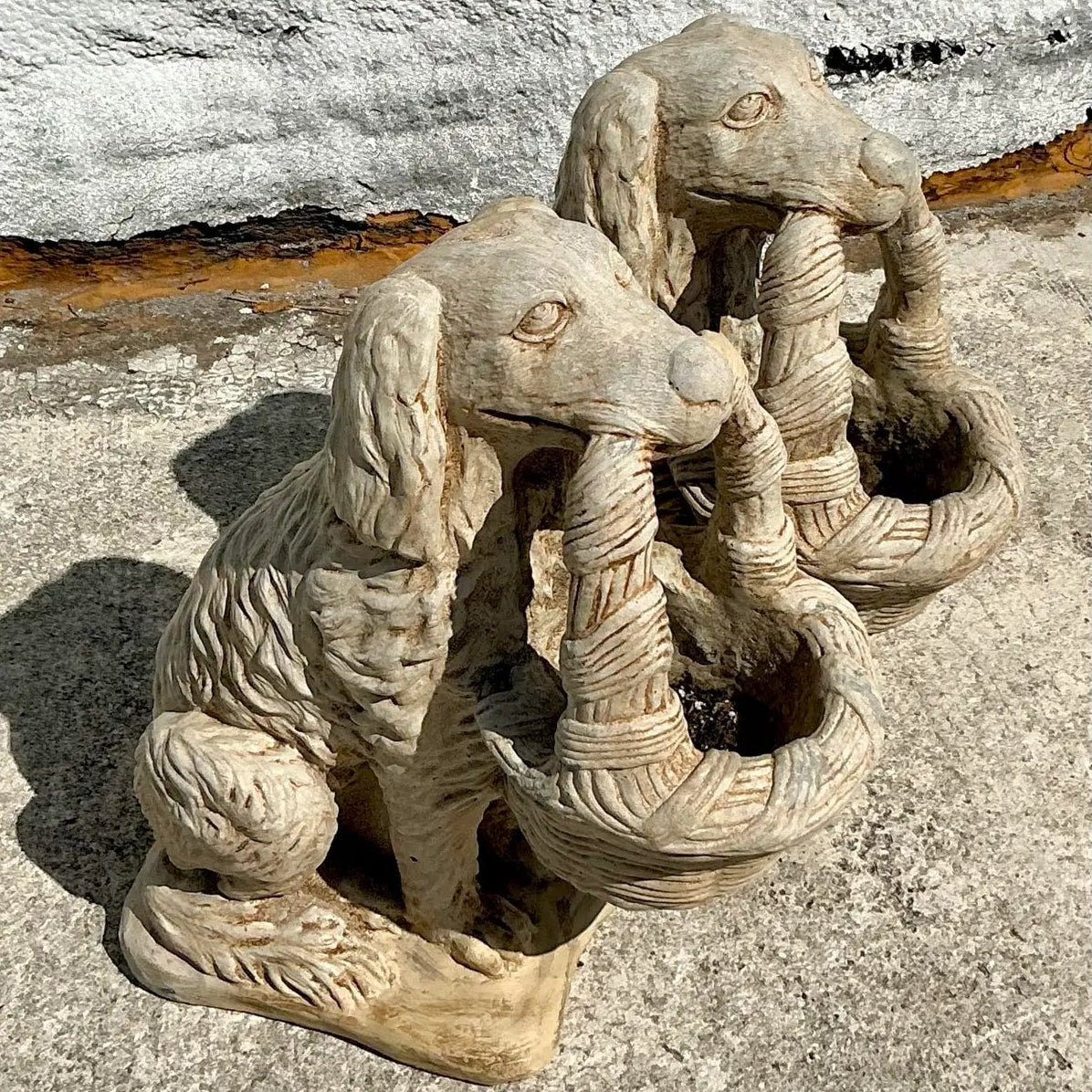 Enhance your outdoor or indoor space with this charming pair of vintage cast stone dog statues.