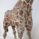 A striking statement from the imagination of artist Sergio Bustamante, this life-size giraffe sculpture embodies whimsy and craftsmanship. Hand-formed in paper mâché over a wire frame, its expressive posture and time-worn finish reveal decades of character. The original hand-painted spots, layered with natural distressing and hints of vintage newsprint beneath, create a beautifully textured surface that feels alive with story.