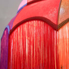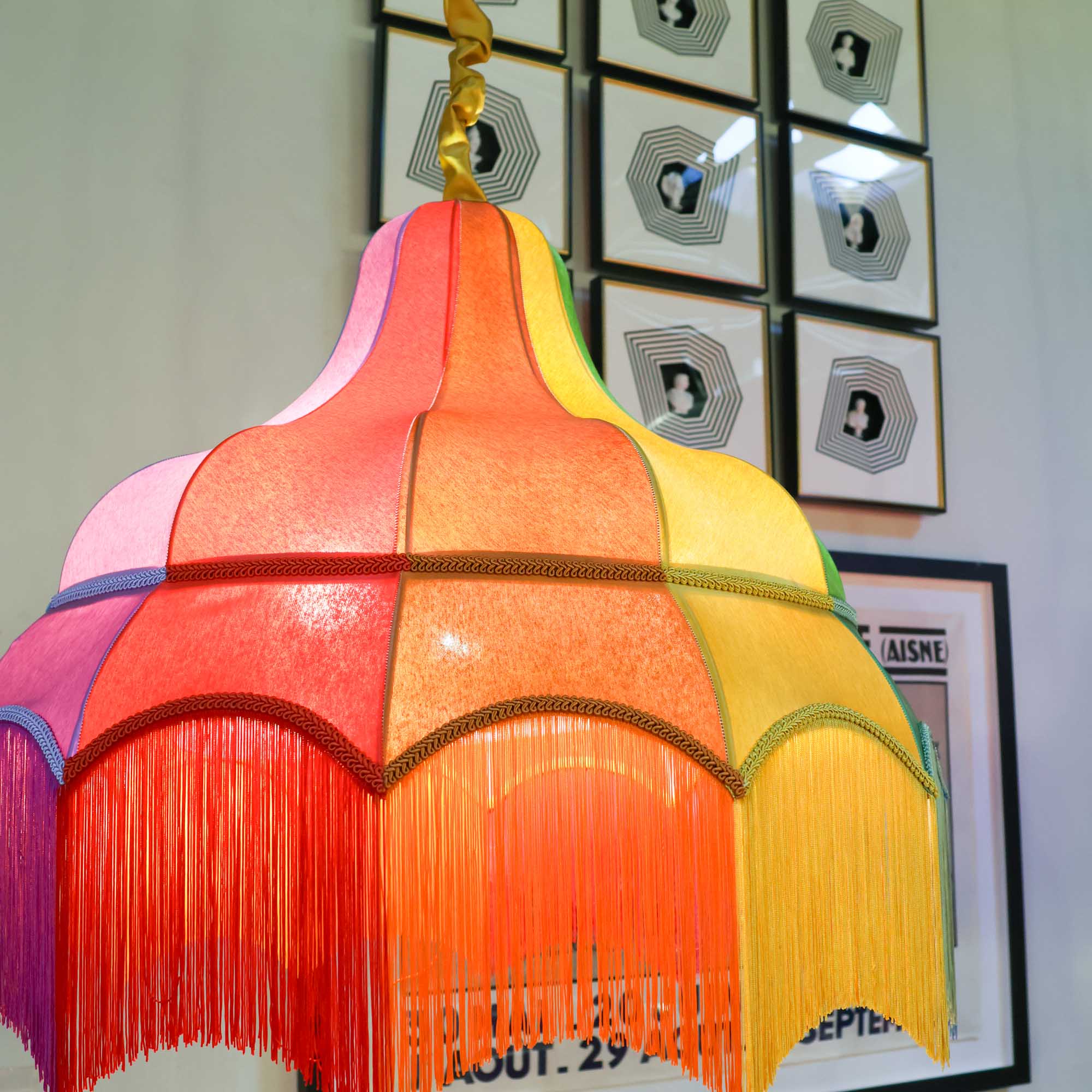 Make a bold statement with this vibrant and whimsical rainbow chandelier. Its multicolored design features a stunning arrangement of arched panels in vivid hues. Layers of cascading fringe match each color segment, creating a dynamic and playful visual effect.