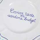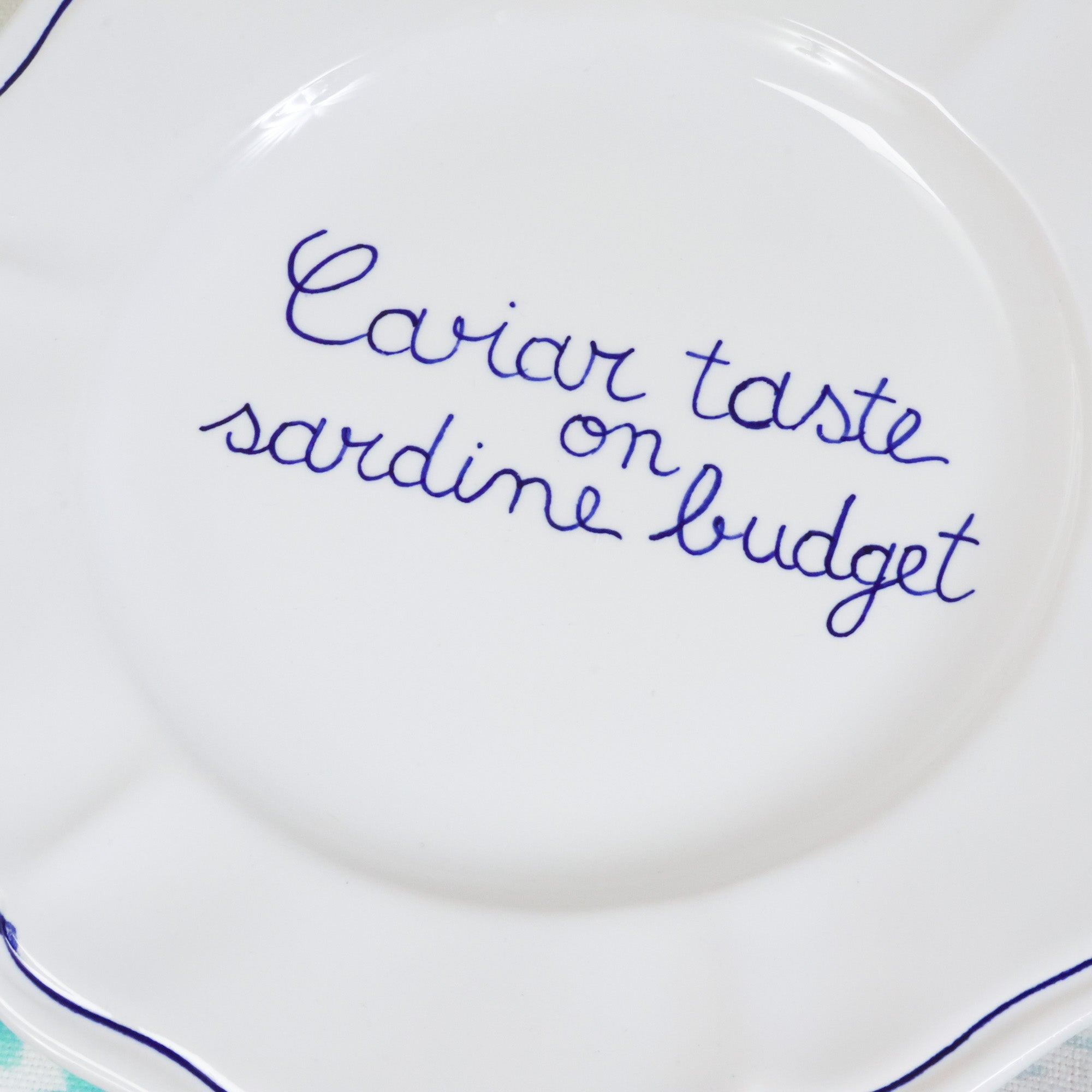 Hand painted by local artisans in Italy and exclusively designed by Scout Design Studio. We love this sassy scalloped plate featuring purple lettering spelling out 'Caviar taste on a champagne budget'.