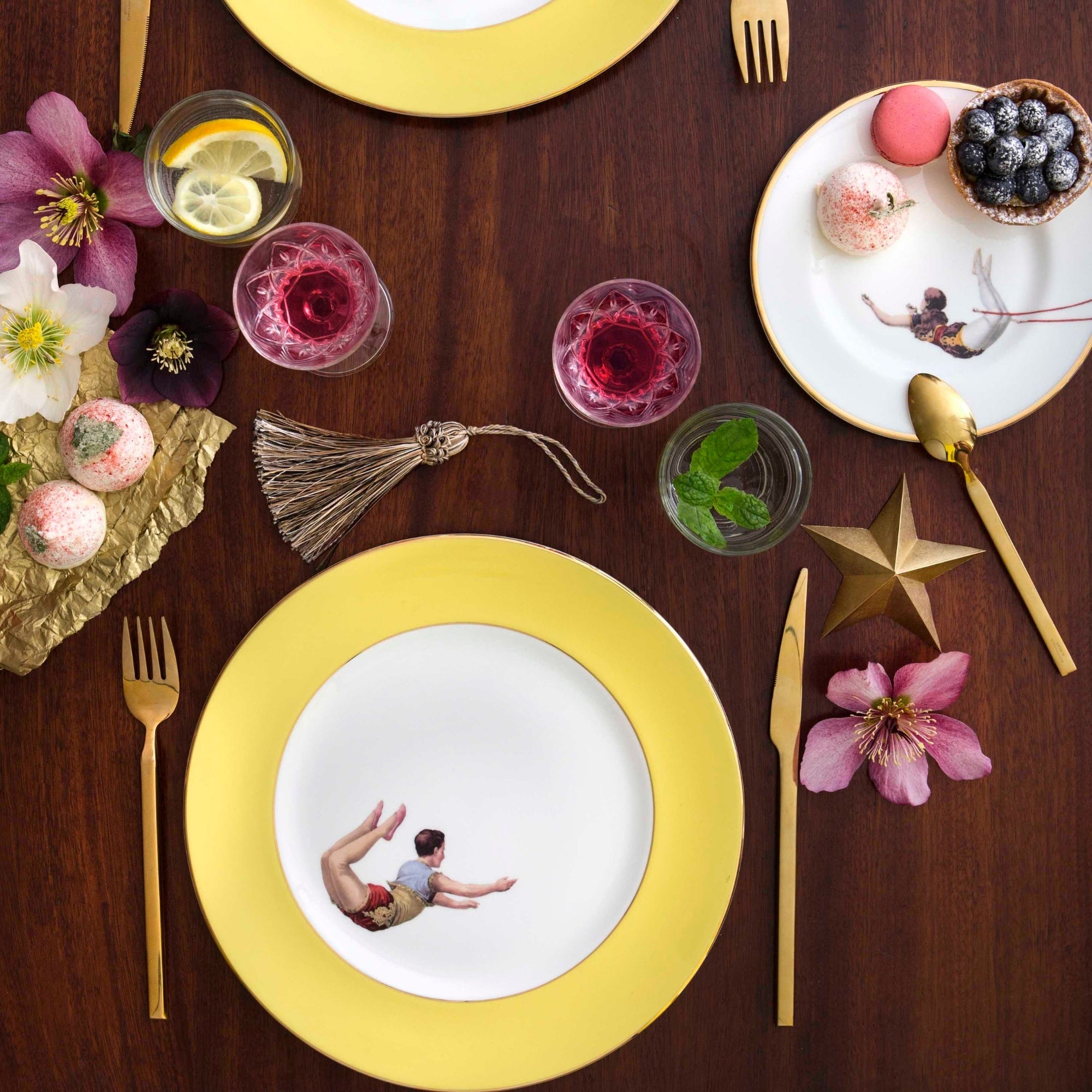 An exquisitely handcrafted fine bone china dinner plate with the circus-inspired Trapeze Boy design and bright yellow border. Features a luxurious and dishwasher friendly hand painted 22kt burnished gold gilded trim.