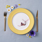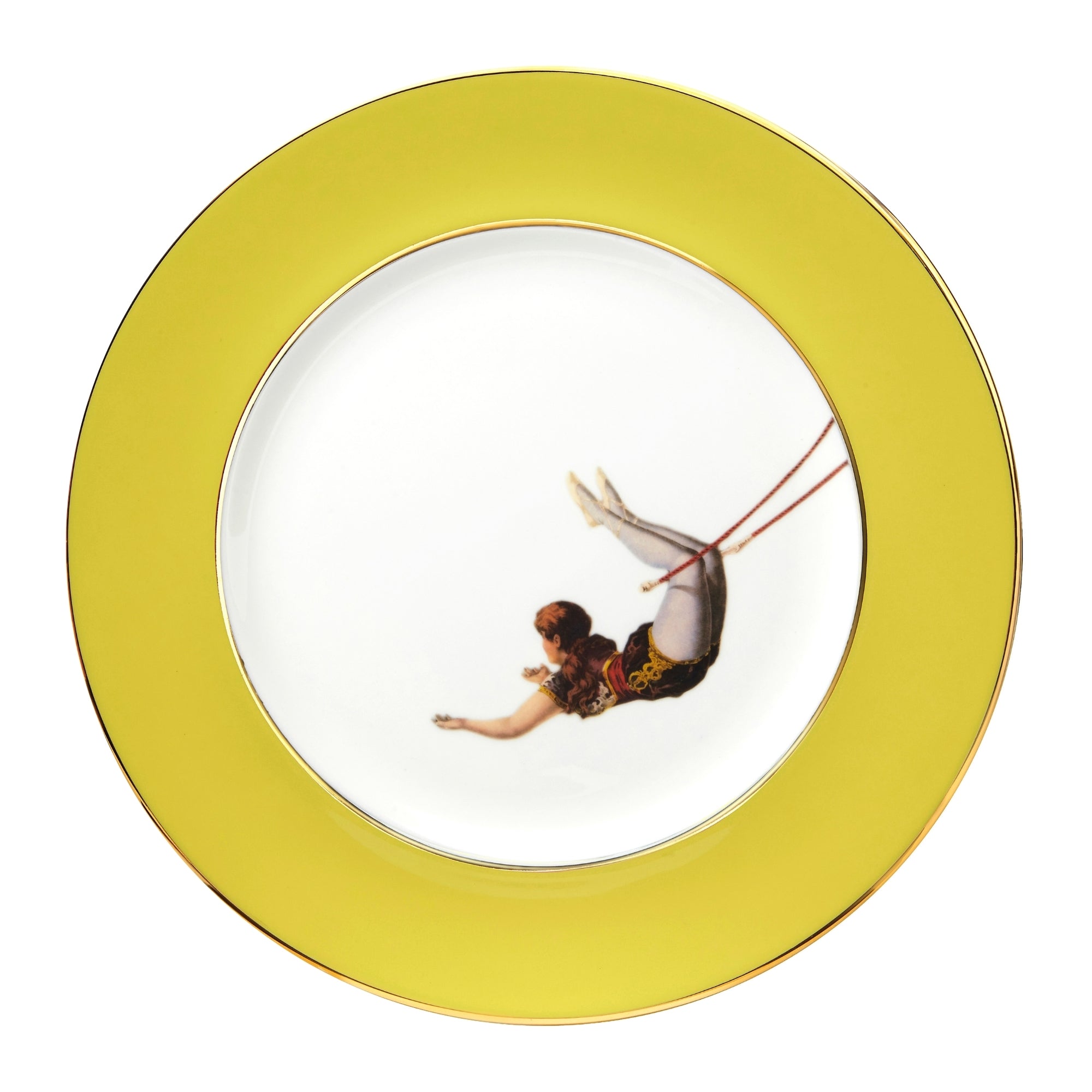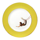 An exquisitely handcrafted fine bone china dinner plate with the circus-inspired Trapeze Girl design and bright yellow border. Features a luxurious and dishwasher friendly hand painted 22kt burnished gold gilded trim.