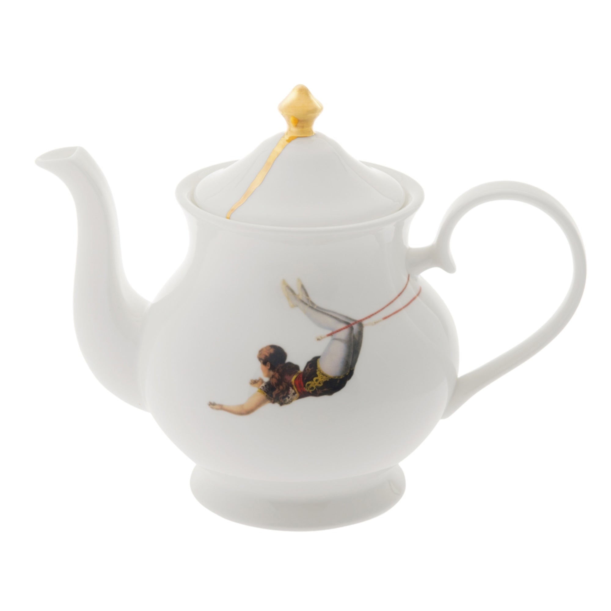 Feature the flying Trapeze Girl sailing across one side of the teapot and the Trapeze Boy tumbling across the other and 22kt burnished gold drip lid.