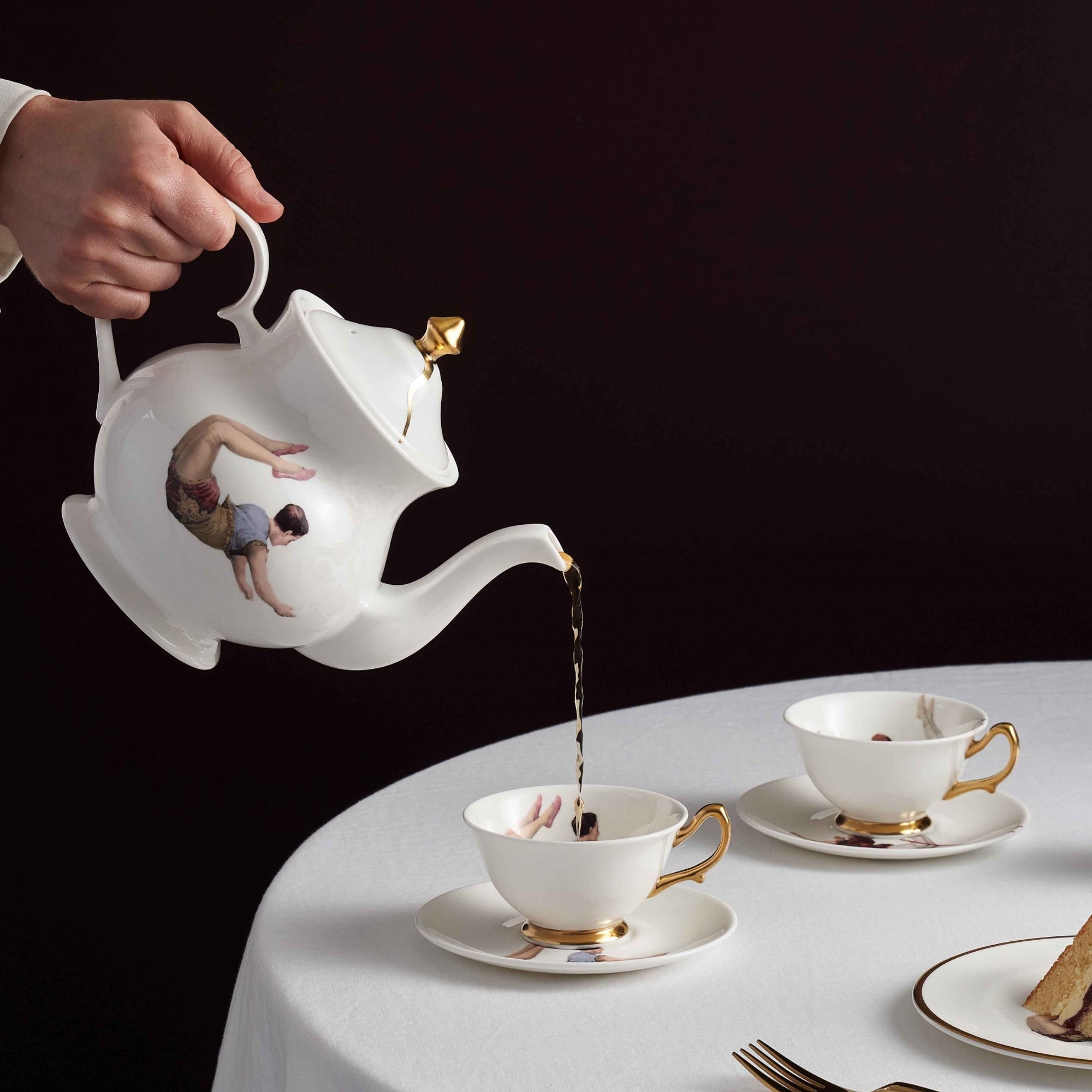 Exquisitely handcrafted fine bone china teapot with the Trapeze design from the Melody Rose Acts of Daring collection inspired by the old world glamour of life in the circus.