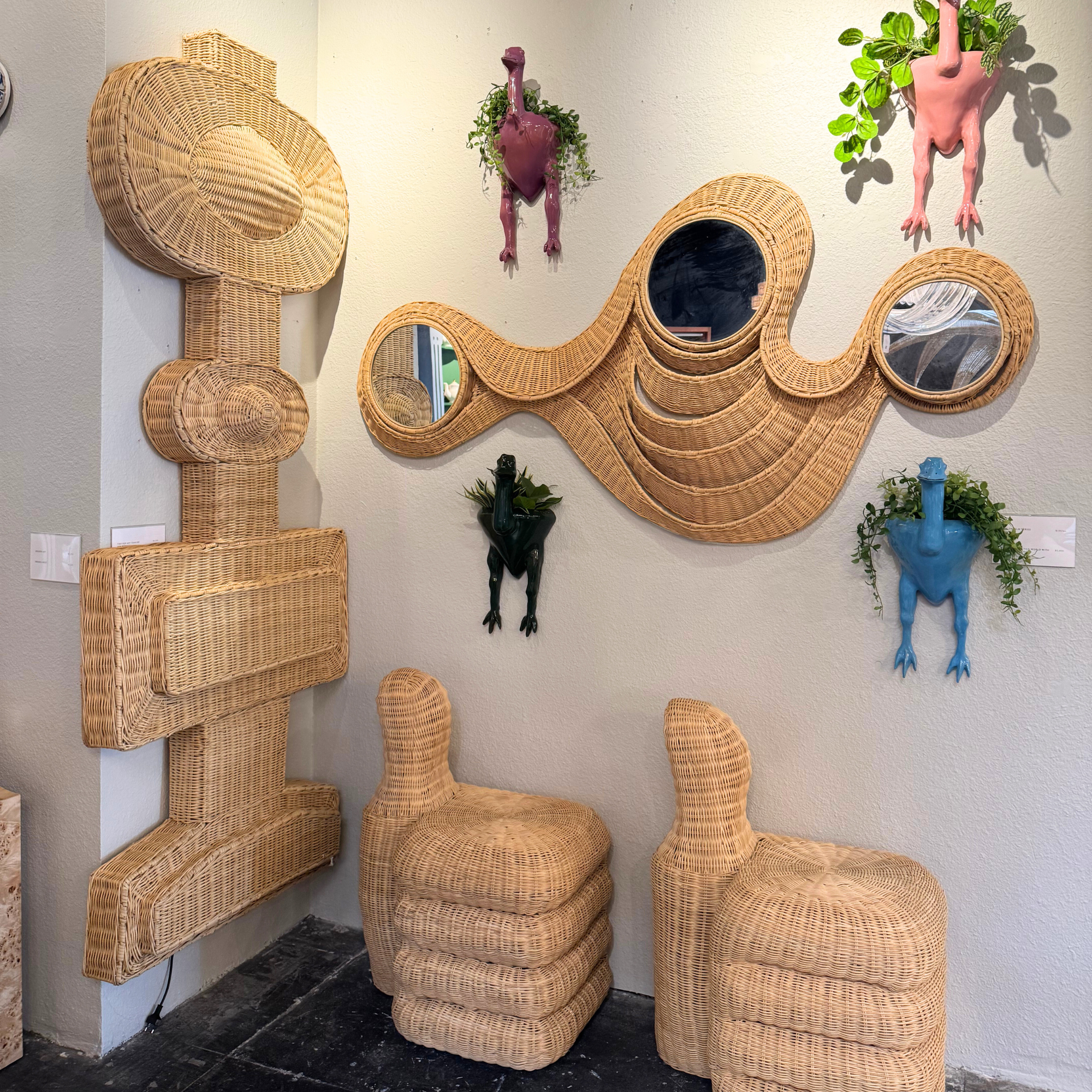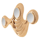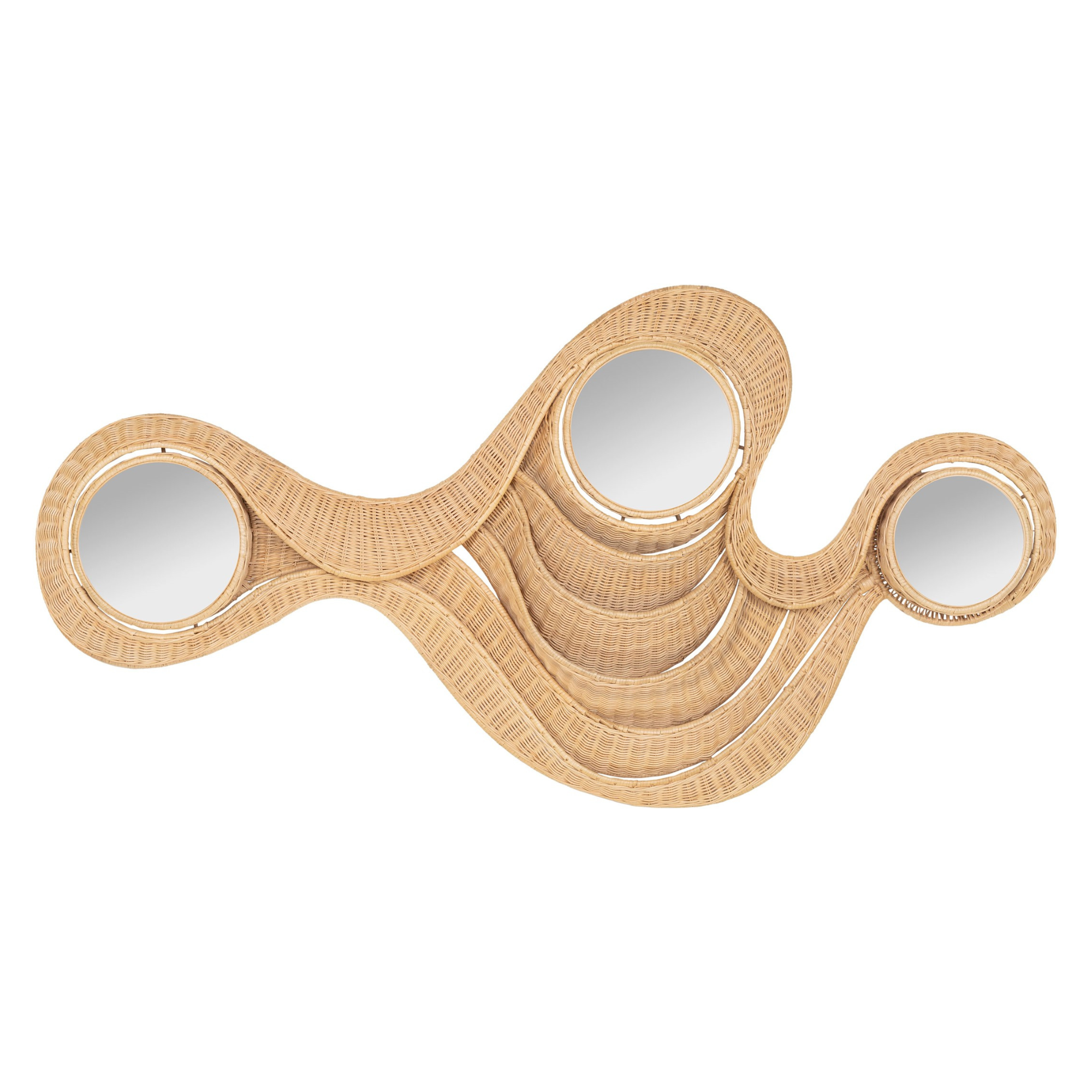 With its undulating rattan frame and trio of circular mirrors, this piece does more than reflect—it ripples.