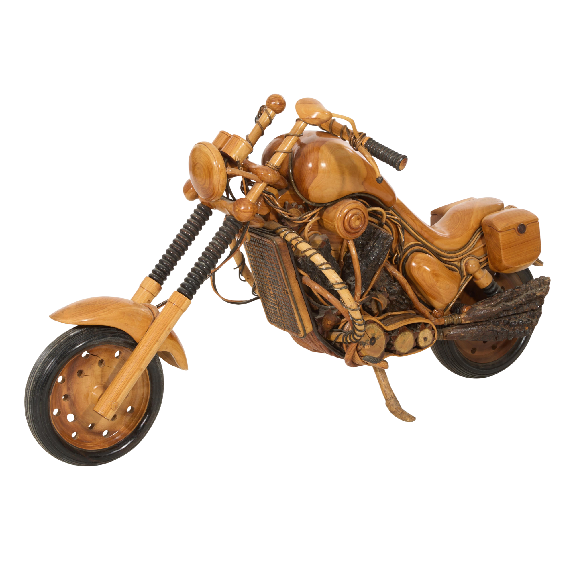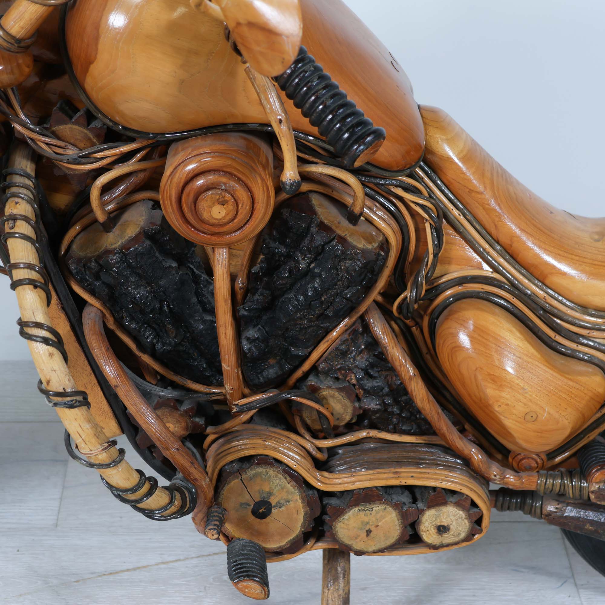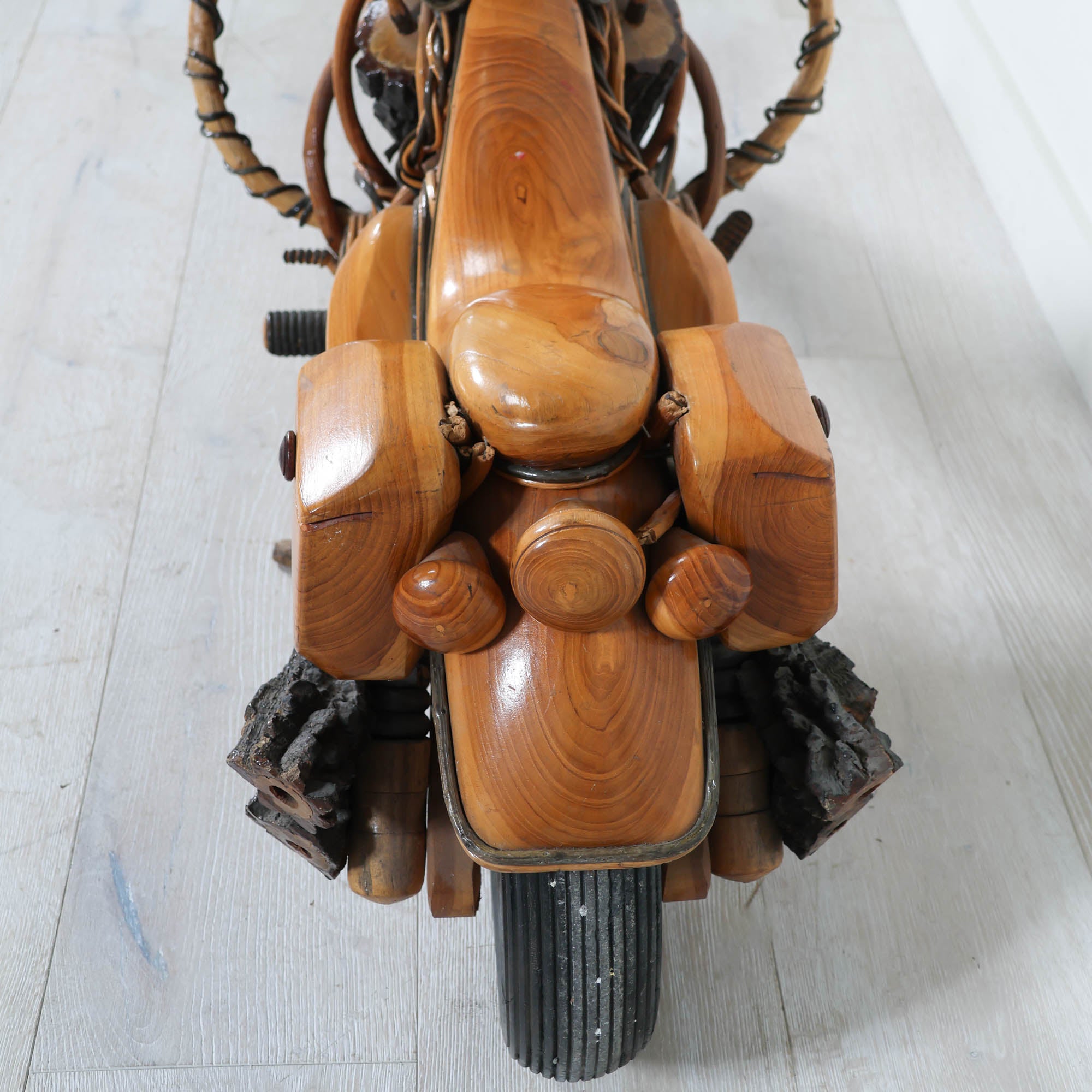 Crafted from various hard and soft woods, this piece is stained, sealed, and fully hand-carved—right down to the engine parts, mufflers, wiring, and side bags. The mechanical detailing is meticulous, with moving wheels that let you actually roll the bike. It’s sturdy enough to sit on, but equally striking as a statement centerpiece or conversation starter.