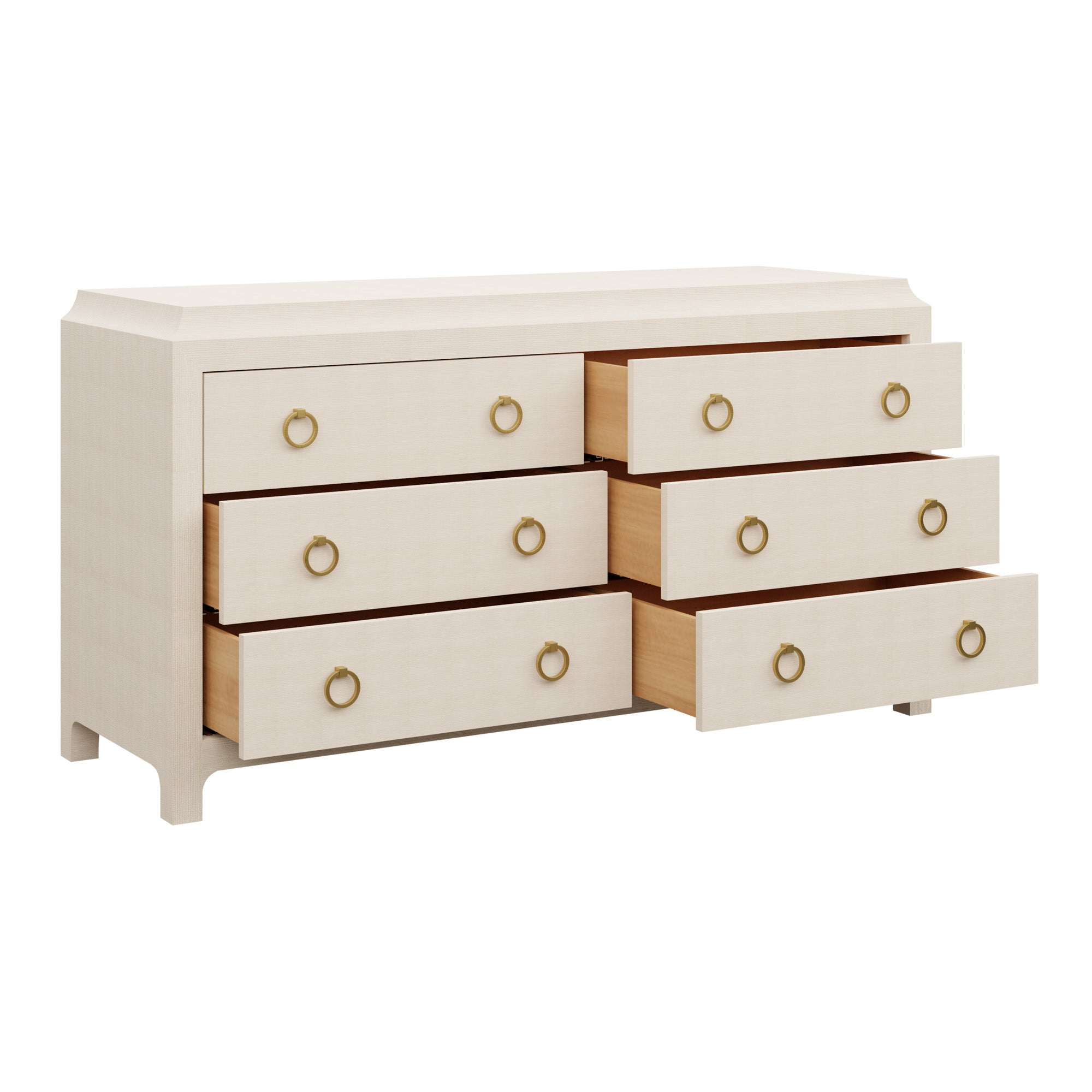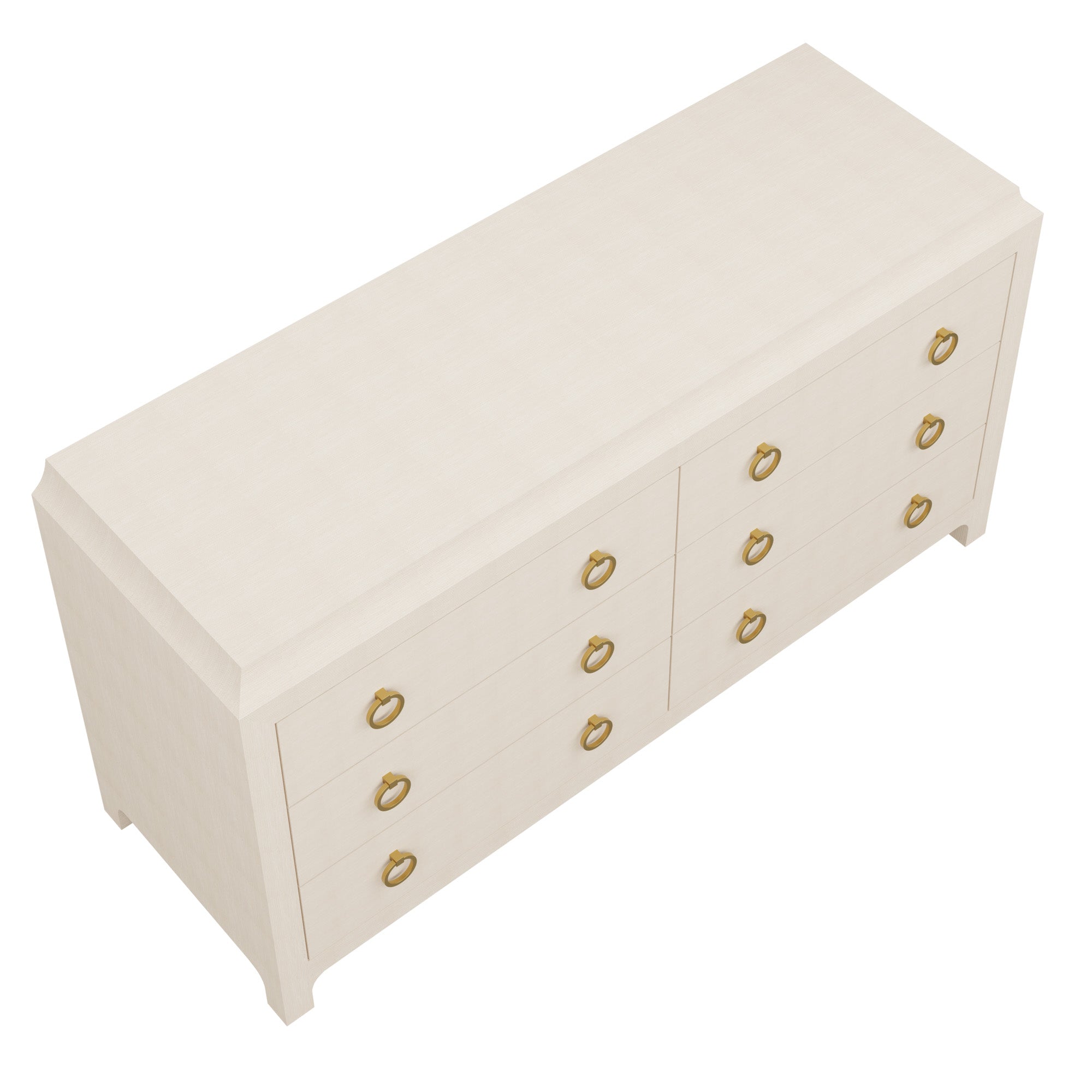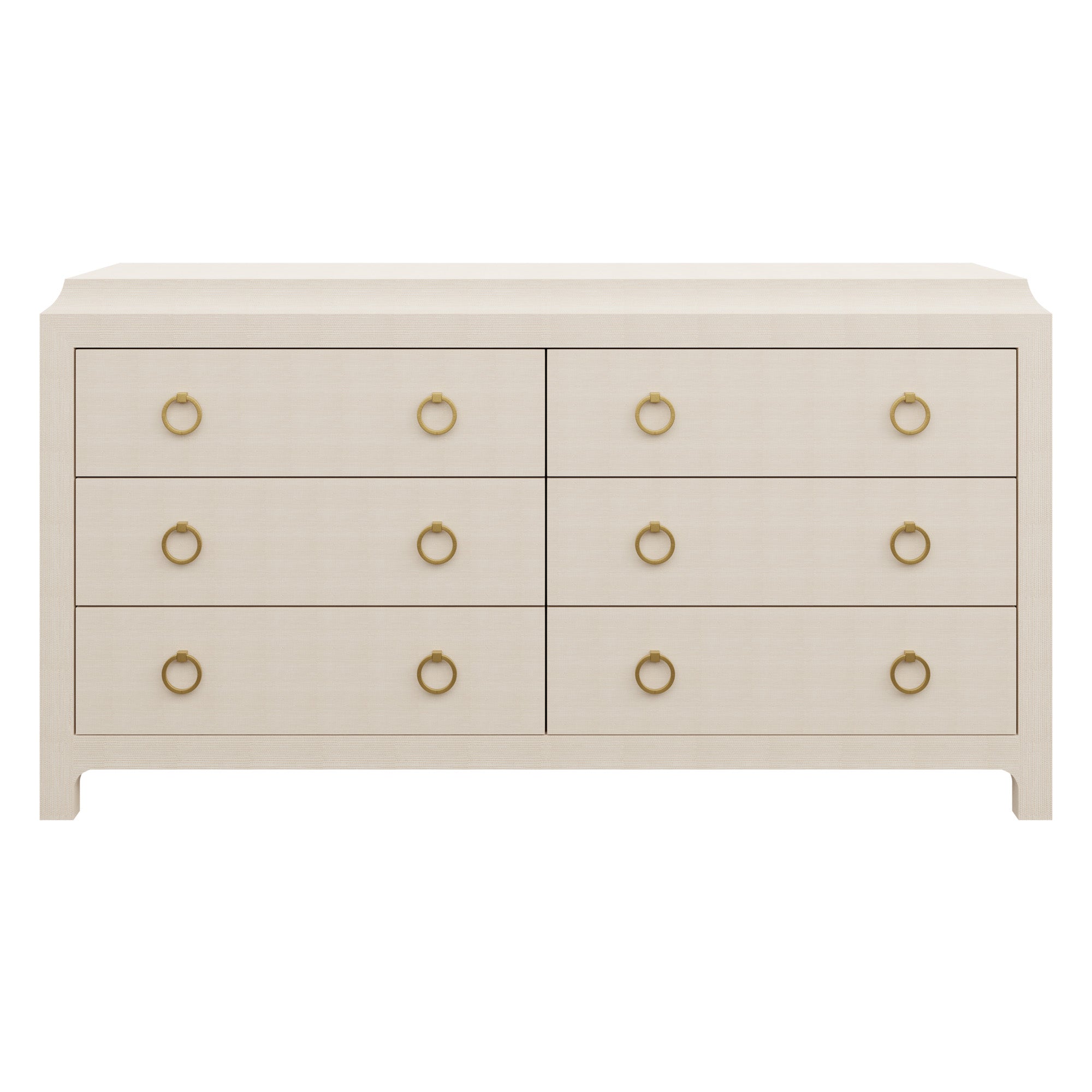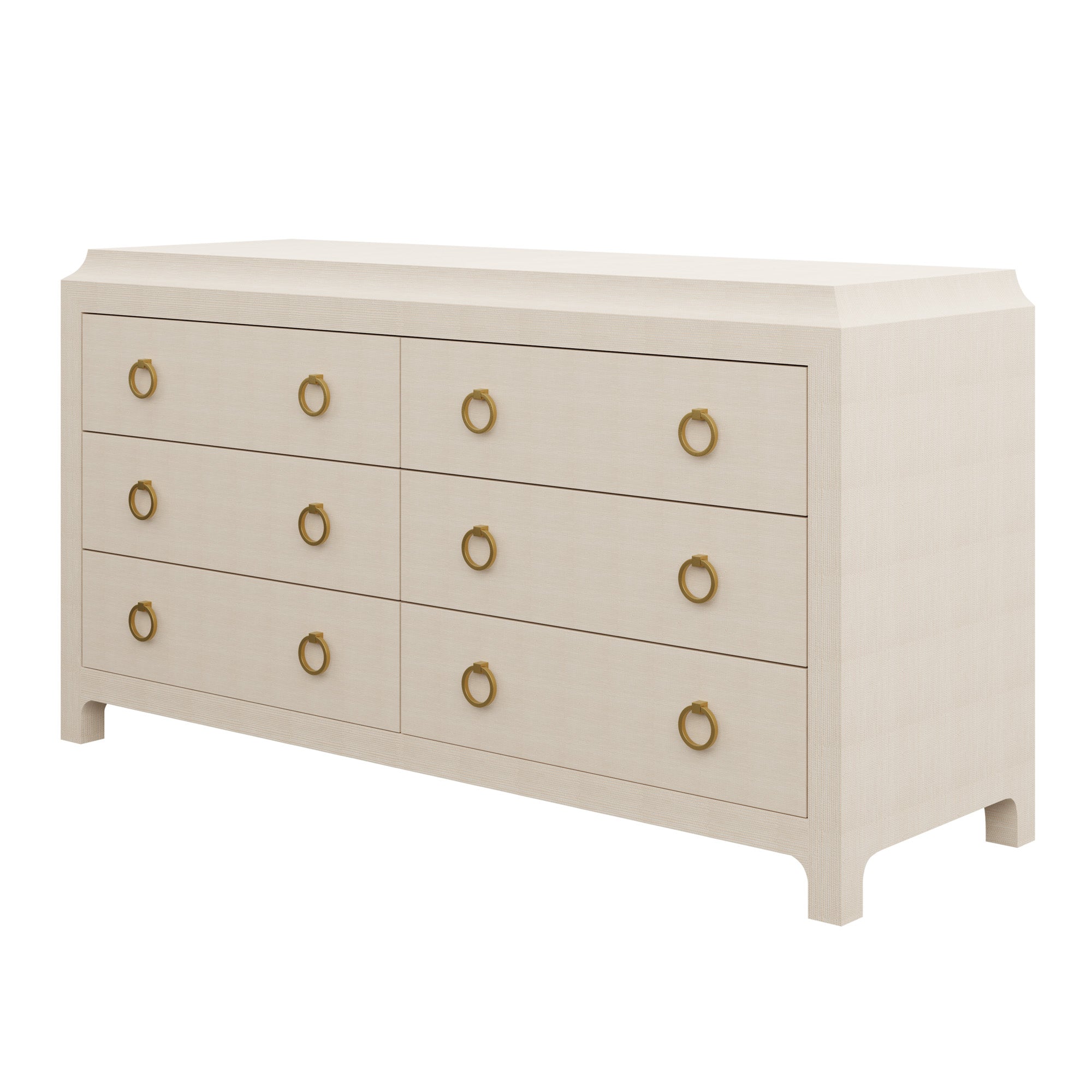 Our bespoke Jackie Dresser features six roomy soft-close drawers that make storage a breeze with brass ring pulls. Choose from our designer-curated selections in grasscloth or lacquer.