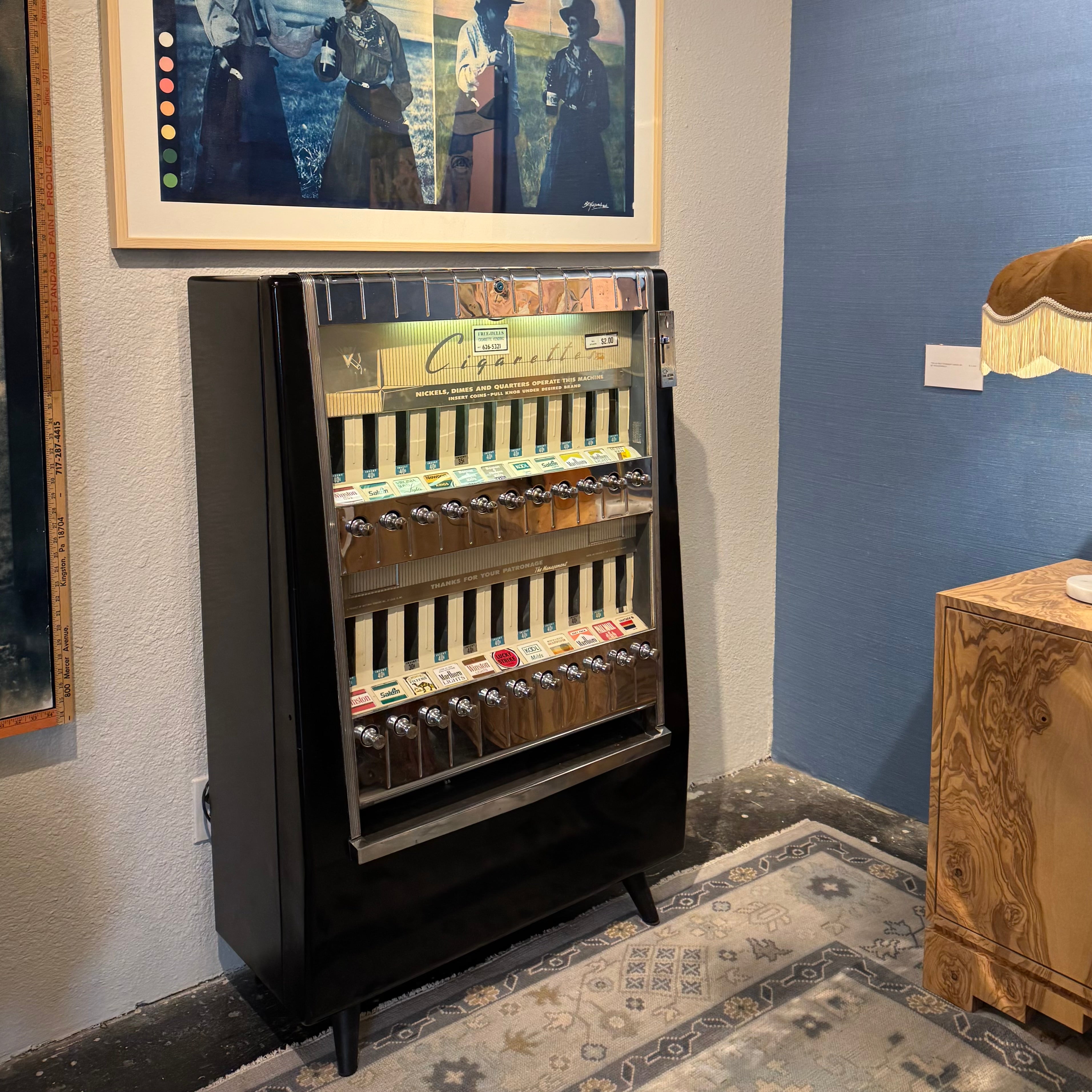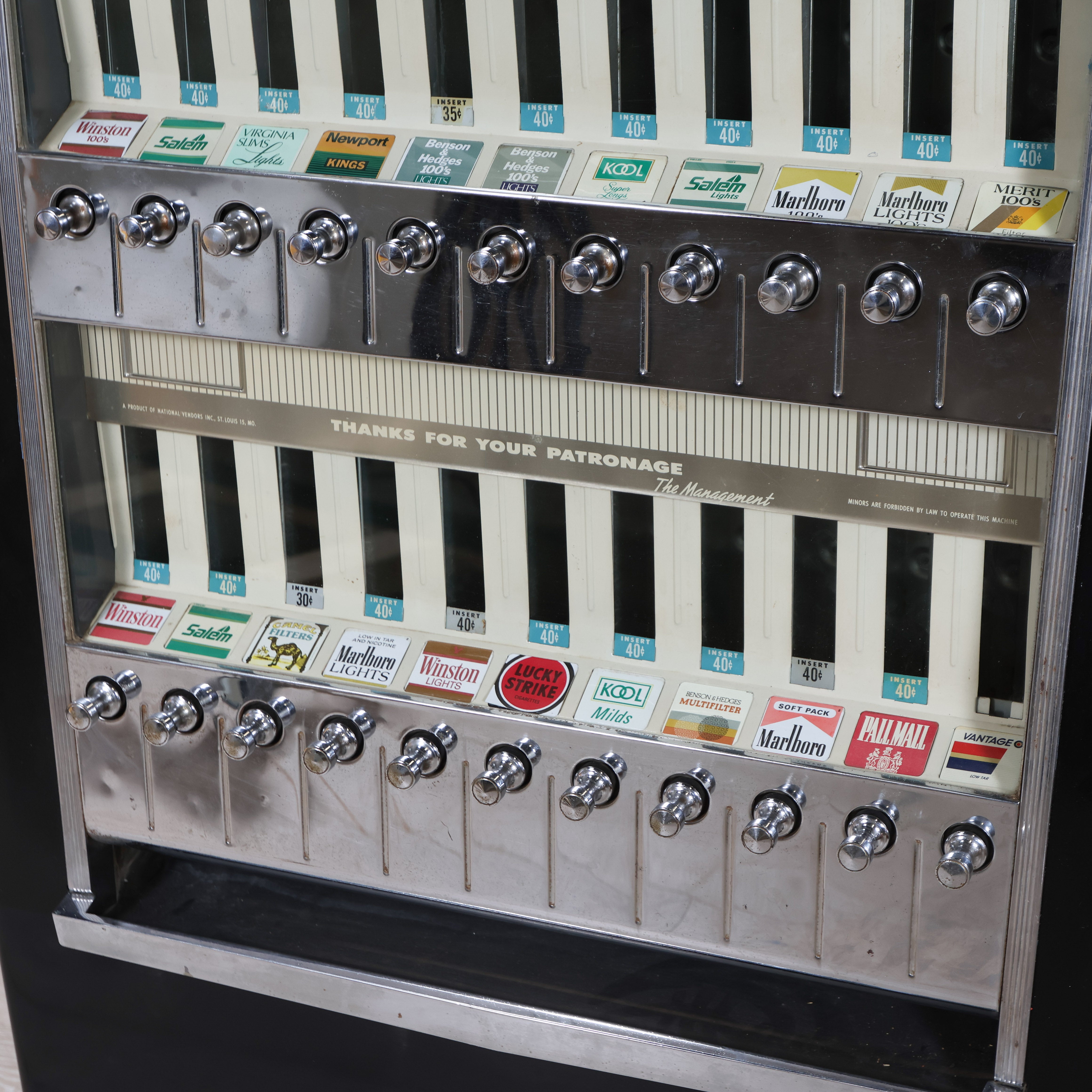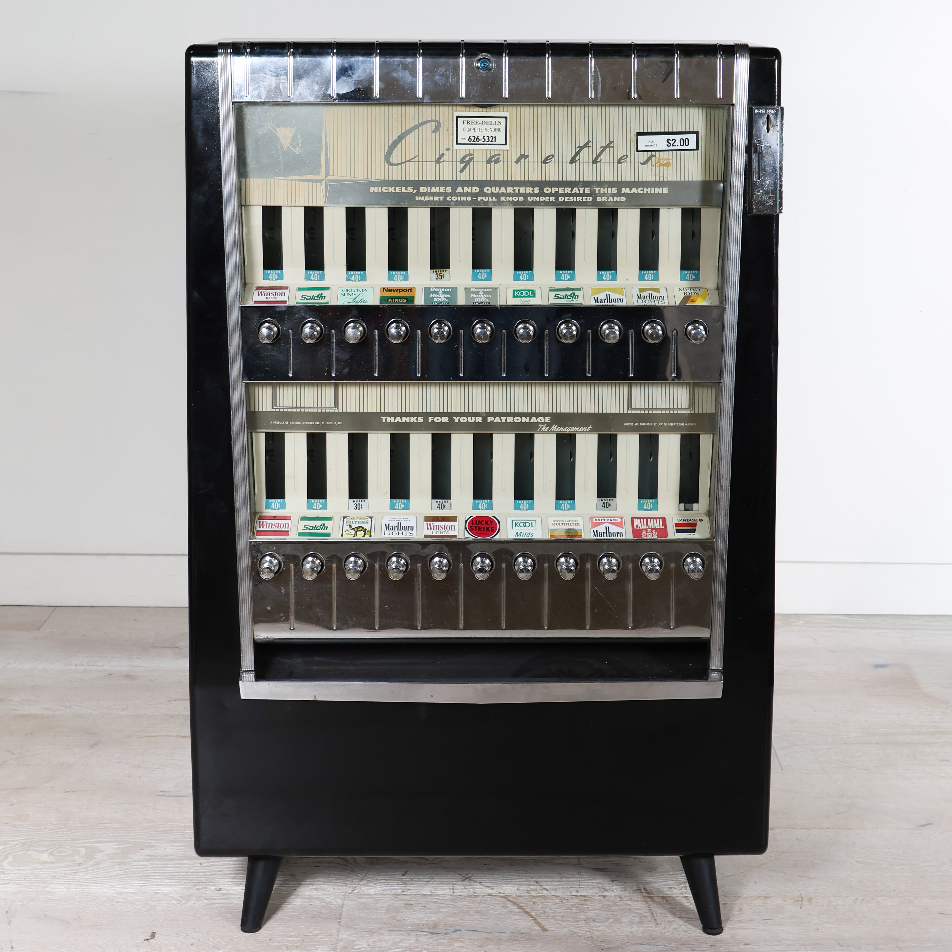 Vintage cigarette dispenser from the 50s that doubles as a unique statement piece - you definitely won't see this one next door! Features a glossy black body, chrome detailing, and rows of brass pull knobs with original brand labels intact.