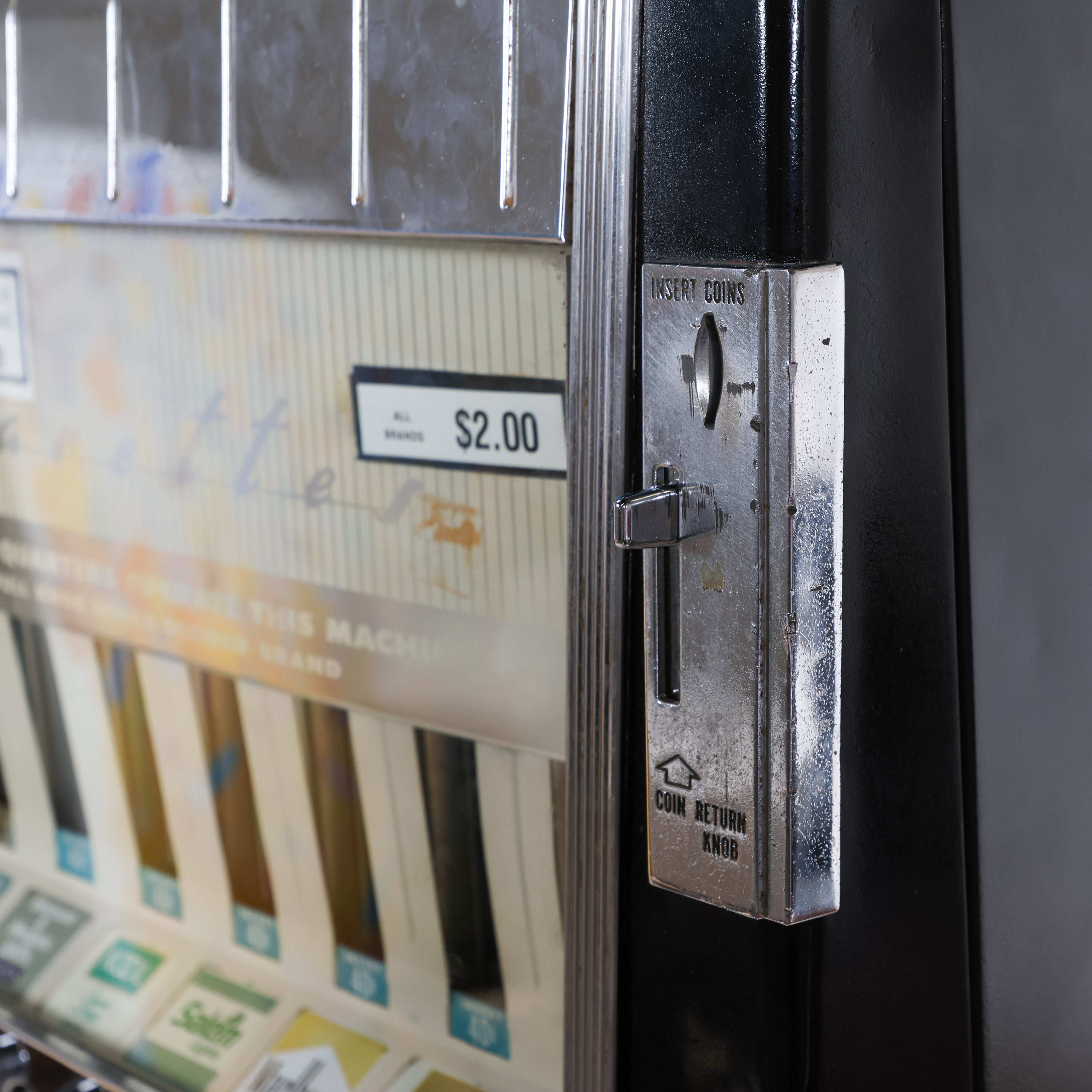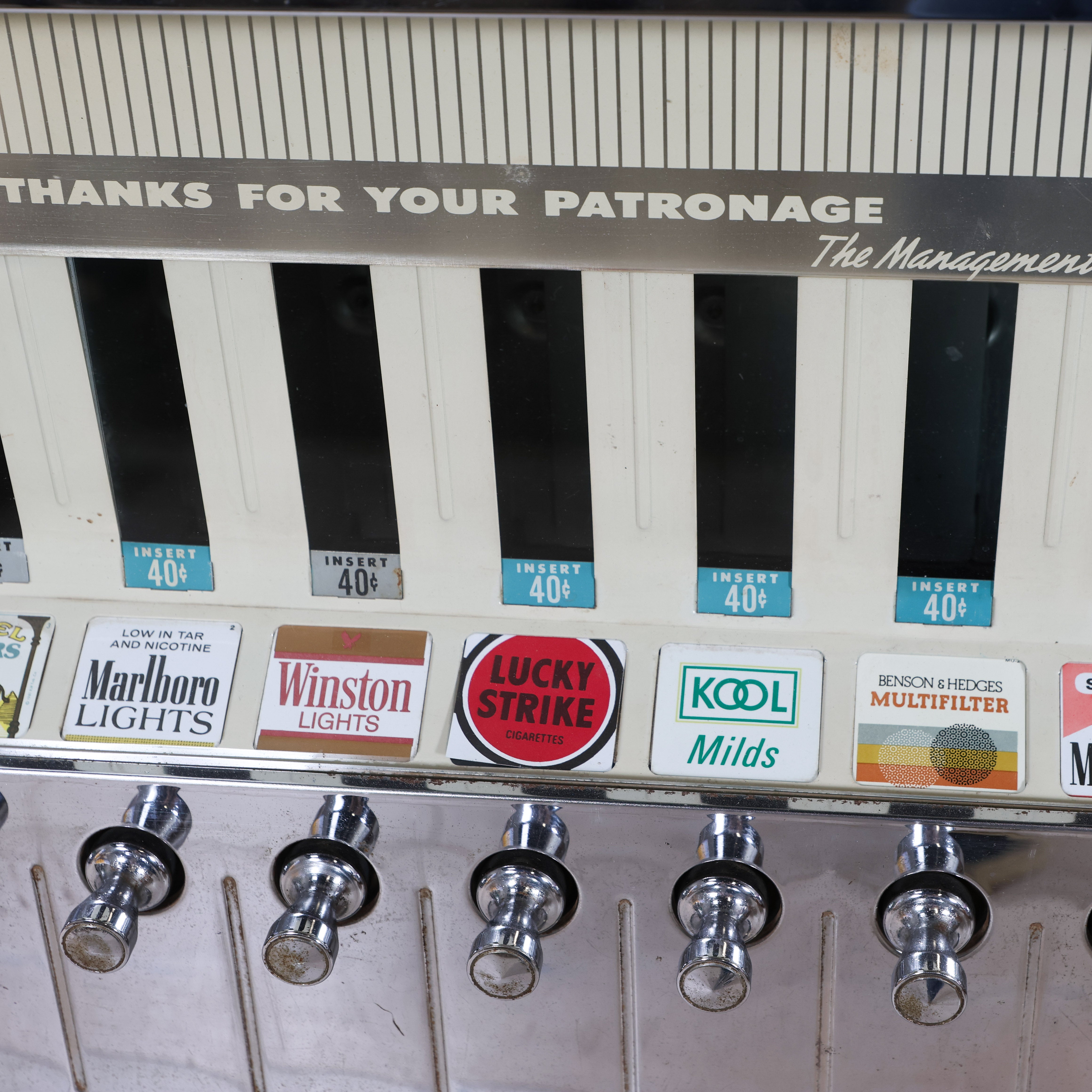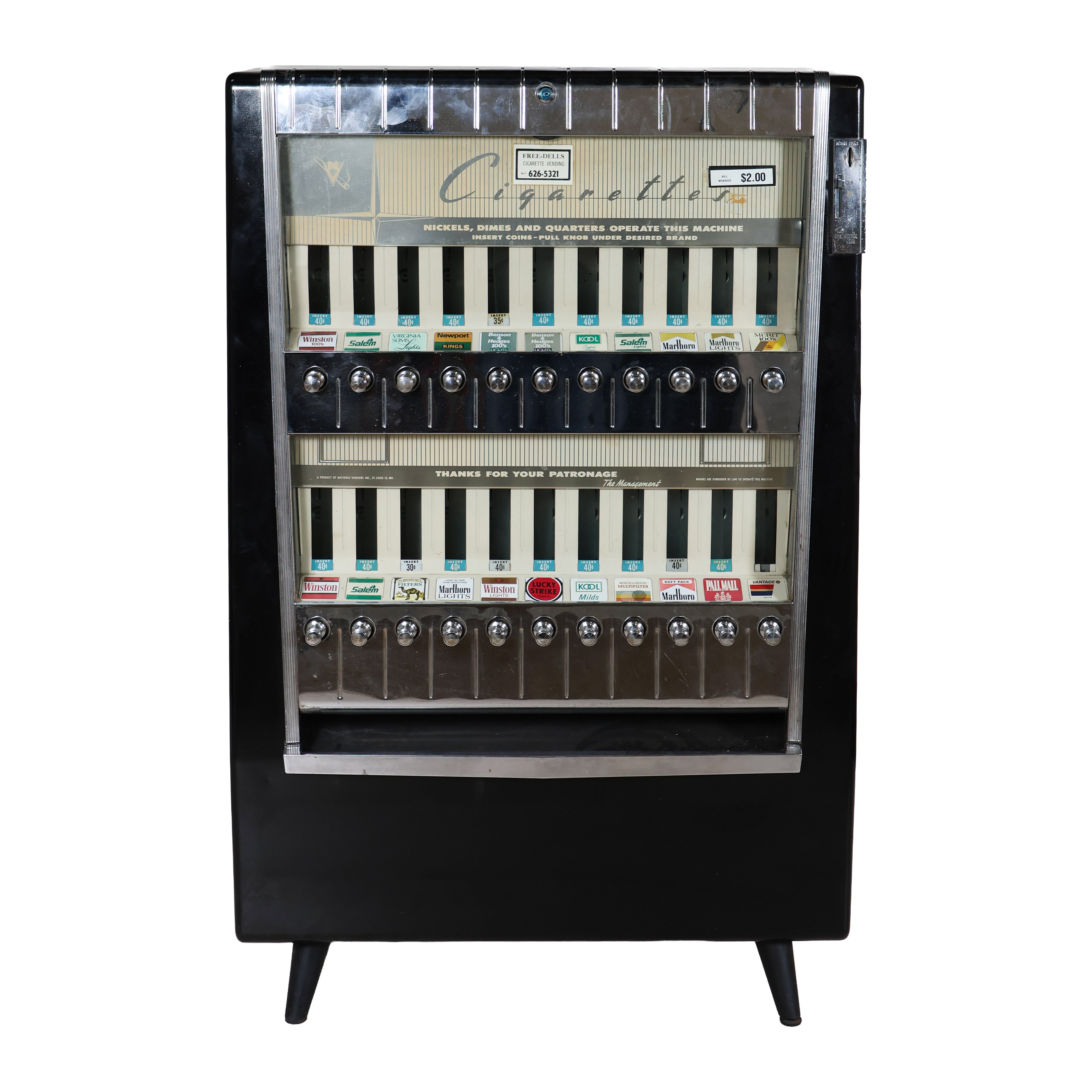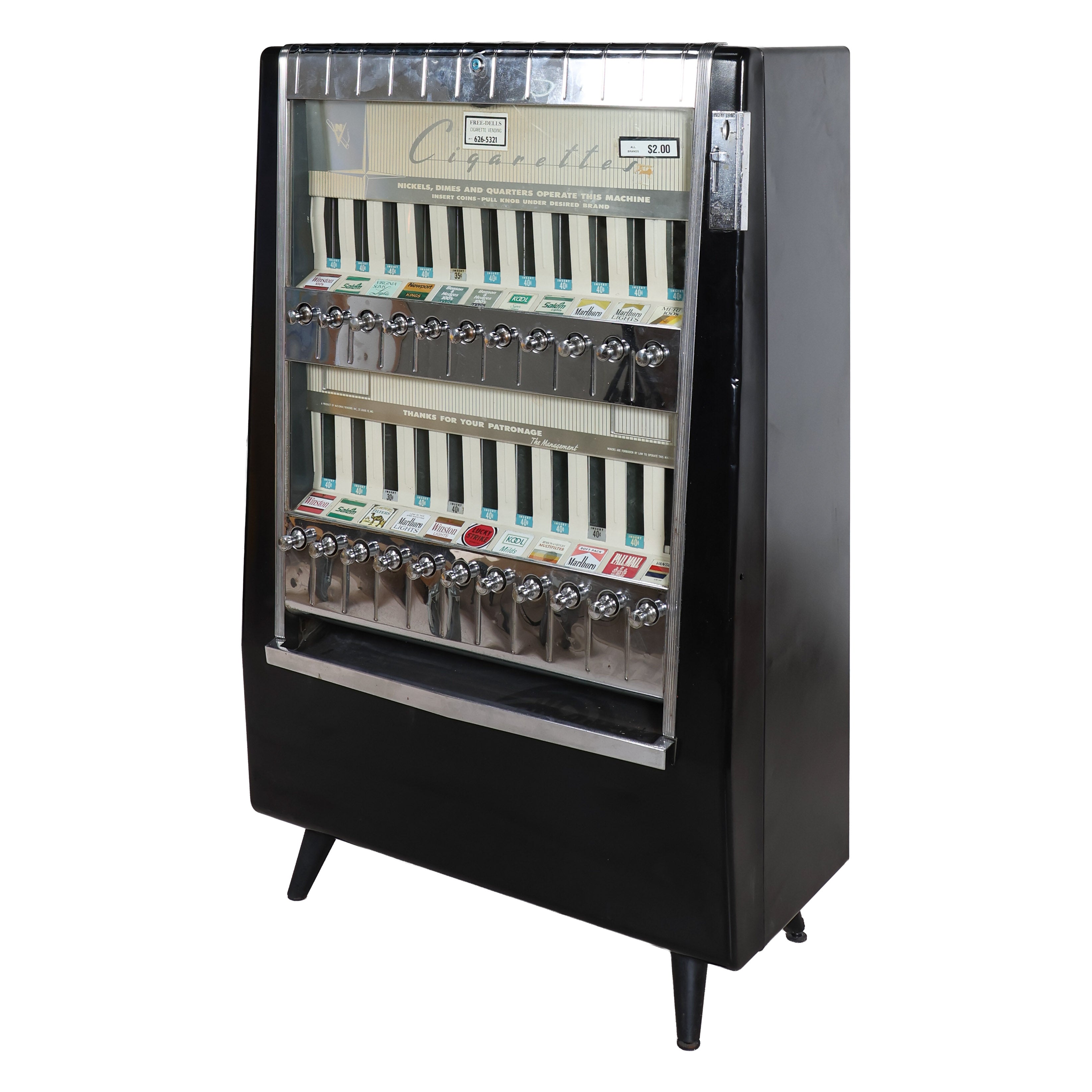Vintage cigarette dispenser from the 50s that doubles as a unique statement piece - you definitely won't see this one next door! Features a glossy black body, chrome detailing, and rows of brass pull knobs with original brand labels intact.