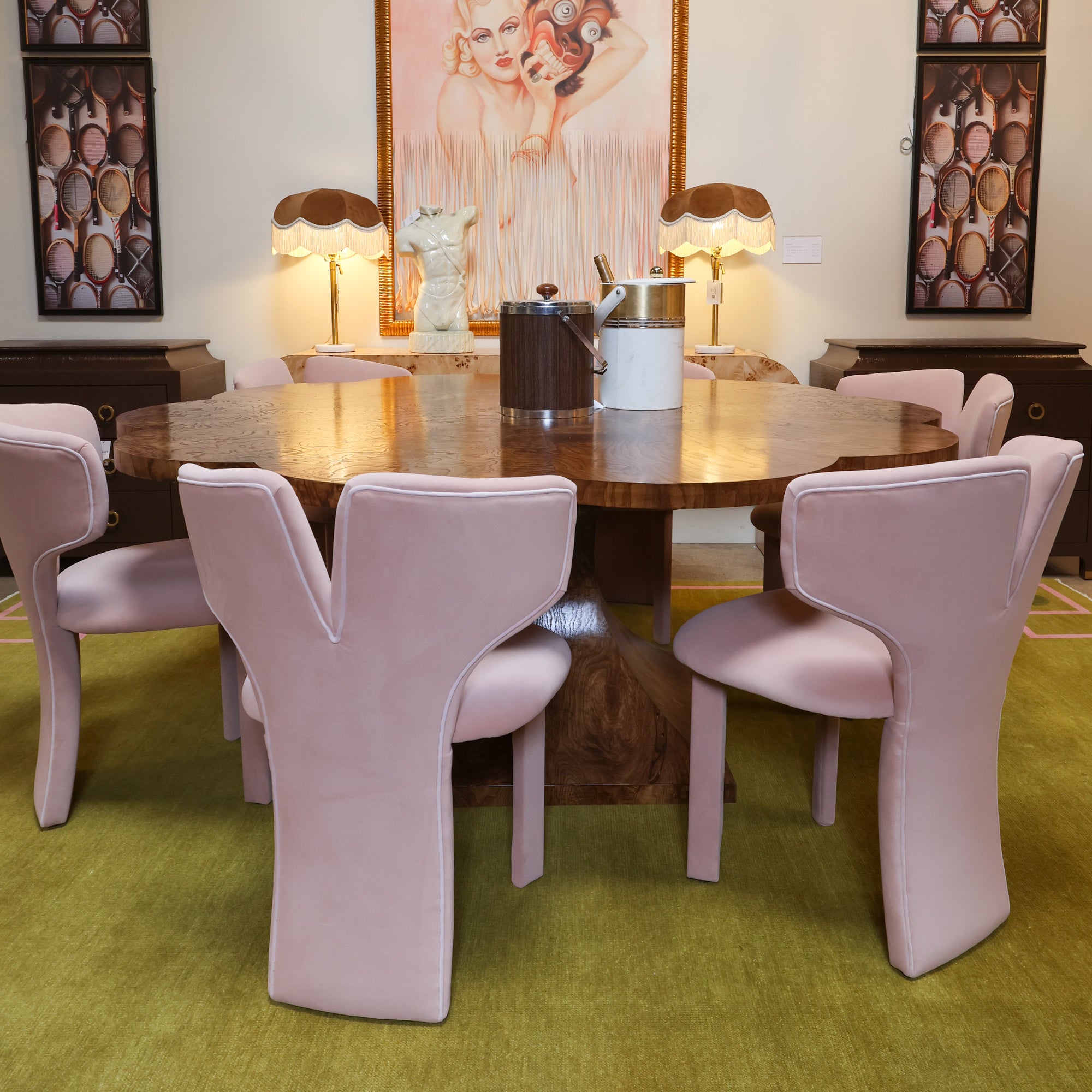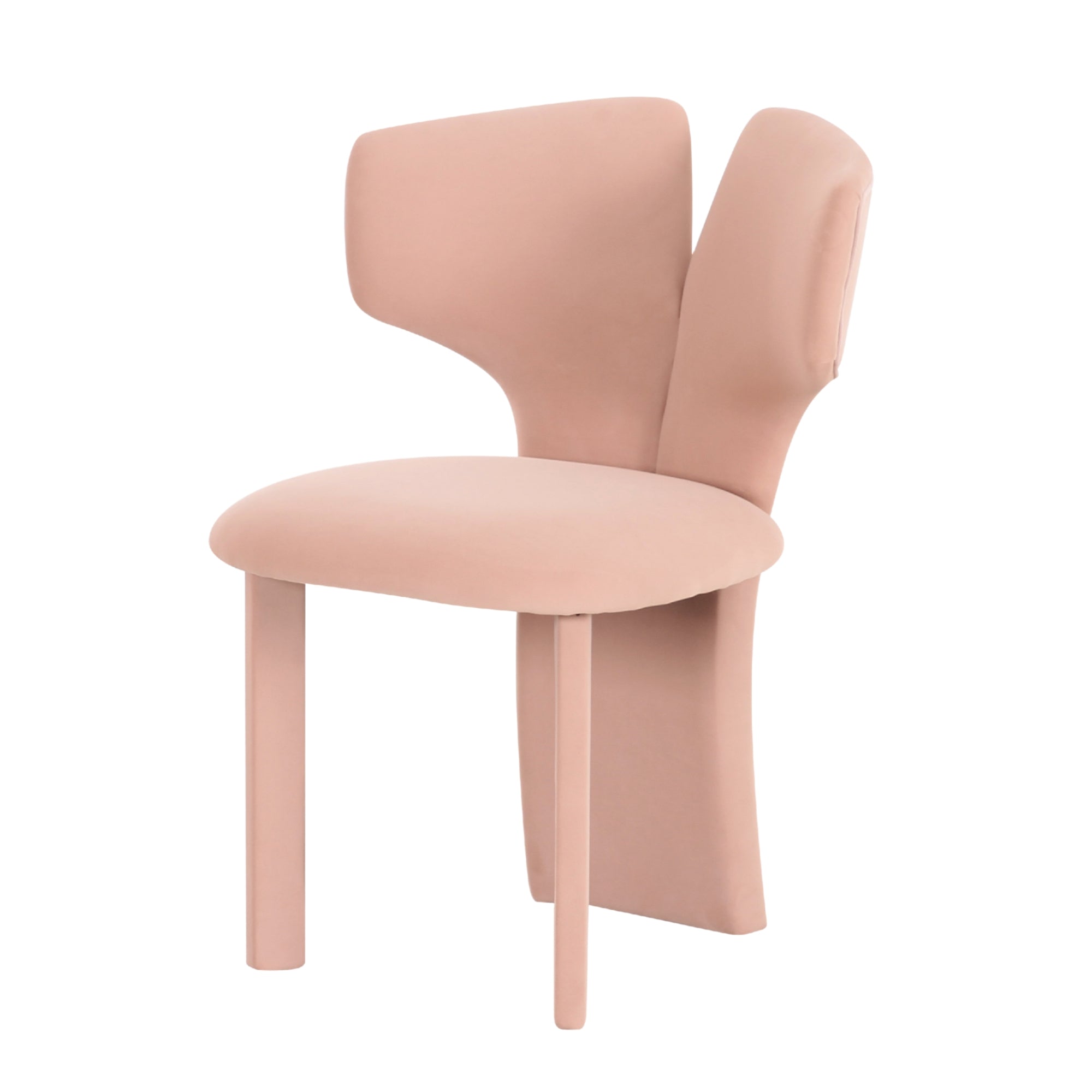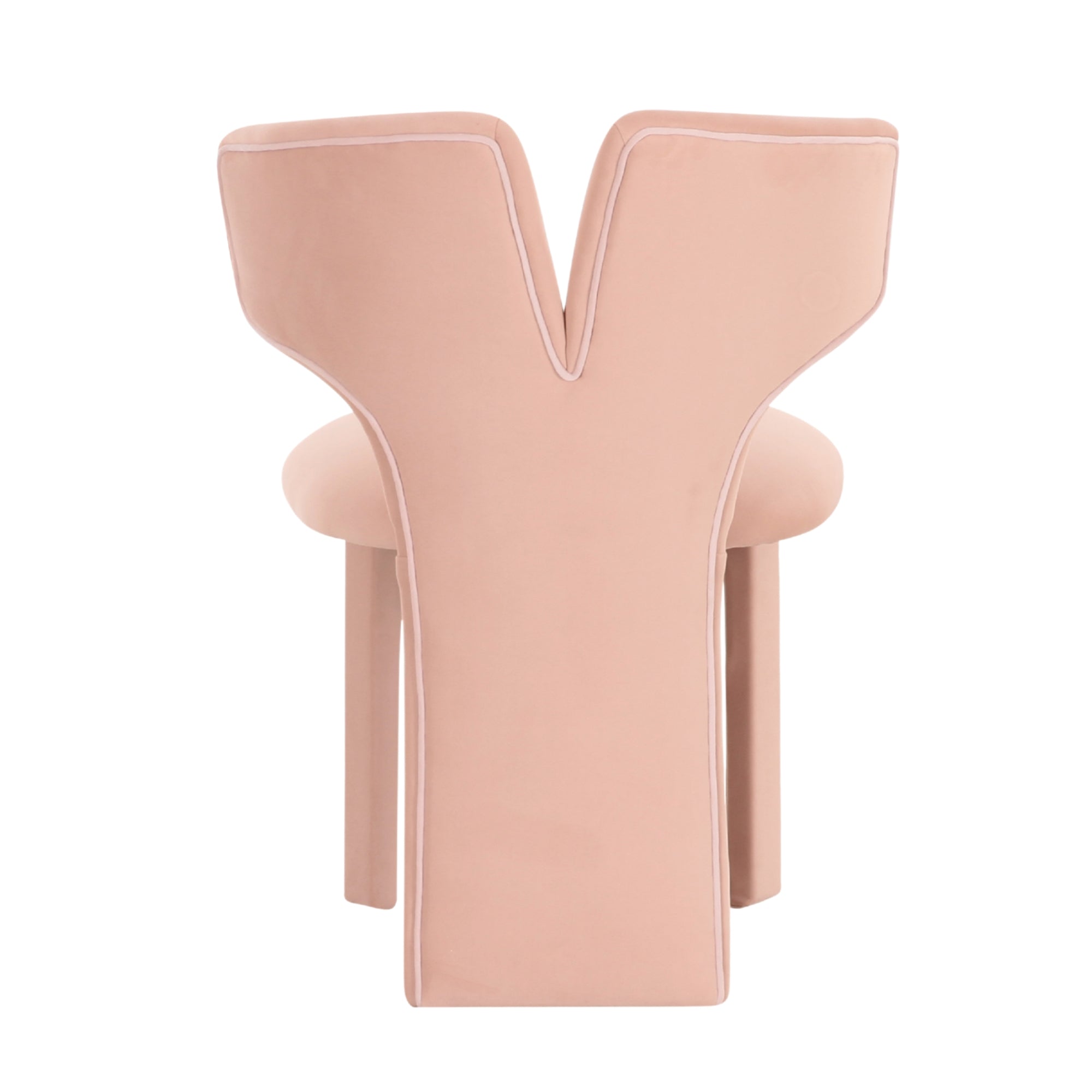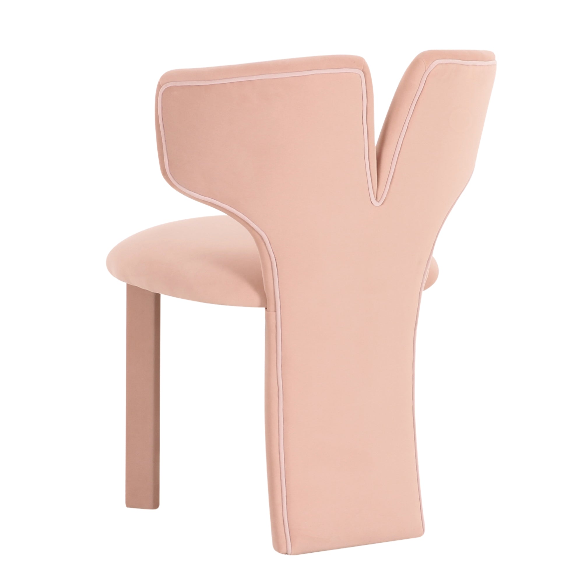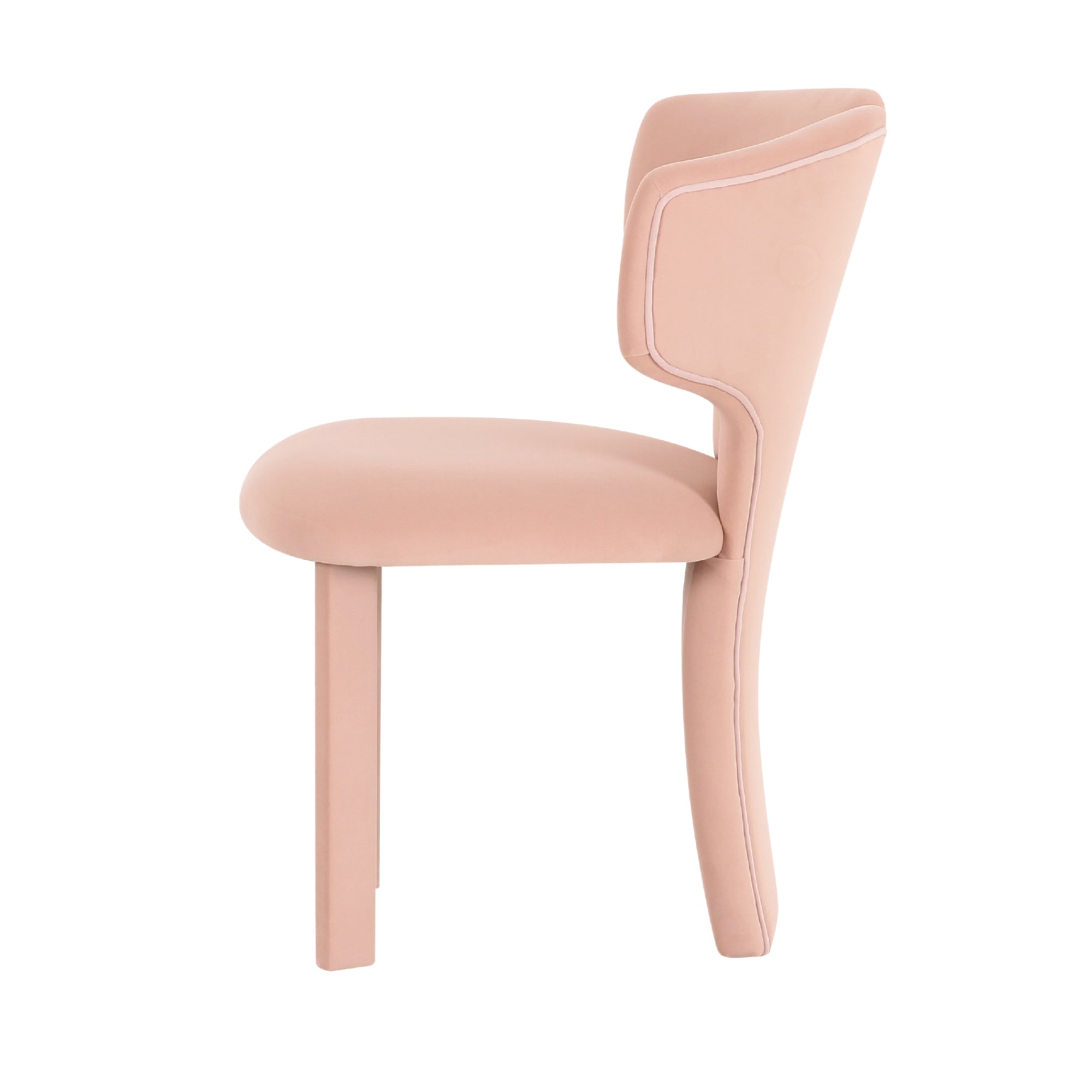 This heavenly seat combines soft rose velvet with tonal blush piping. A modern curved back creates ultimate dining comfort.