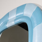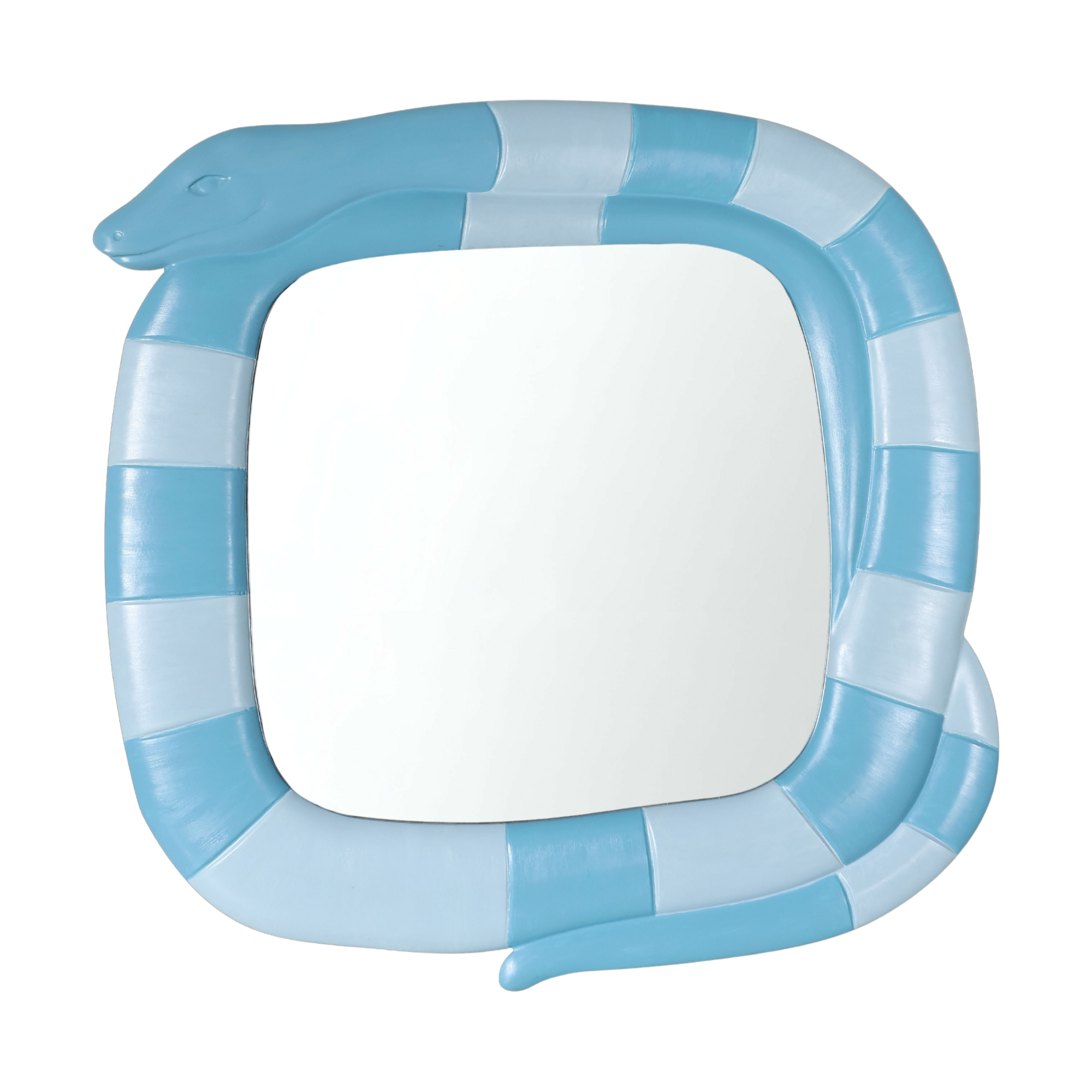 This wall mirror is framed by a snake design, finished in soft blue tones with alternating stripe detailing that gives it a sculptural, wrapped appearance. The gently rounded square mirror at center keeps the look balanced and allows the frame to do the talking.