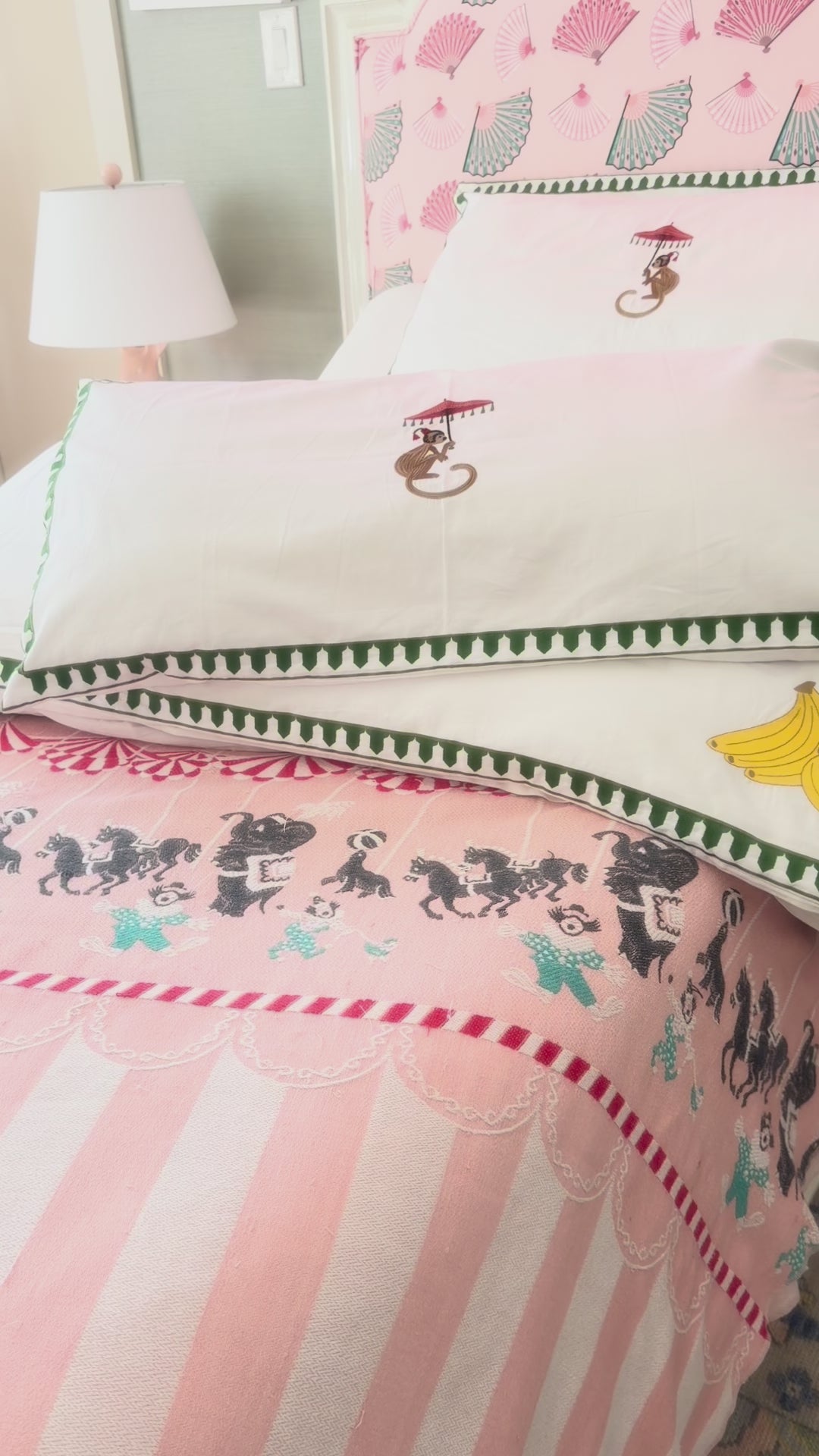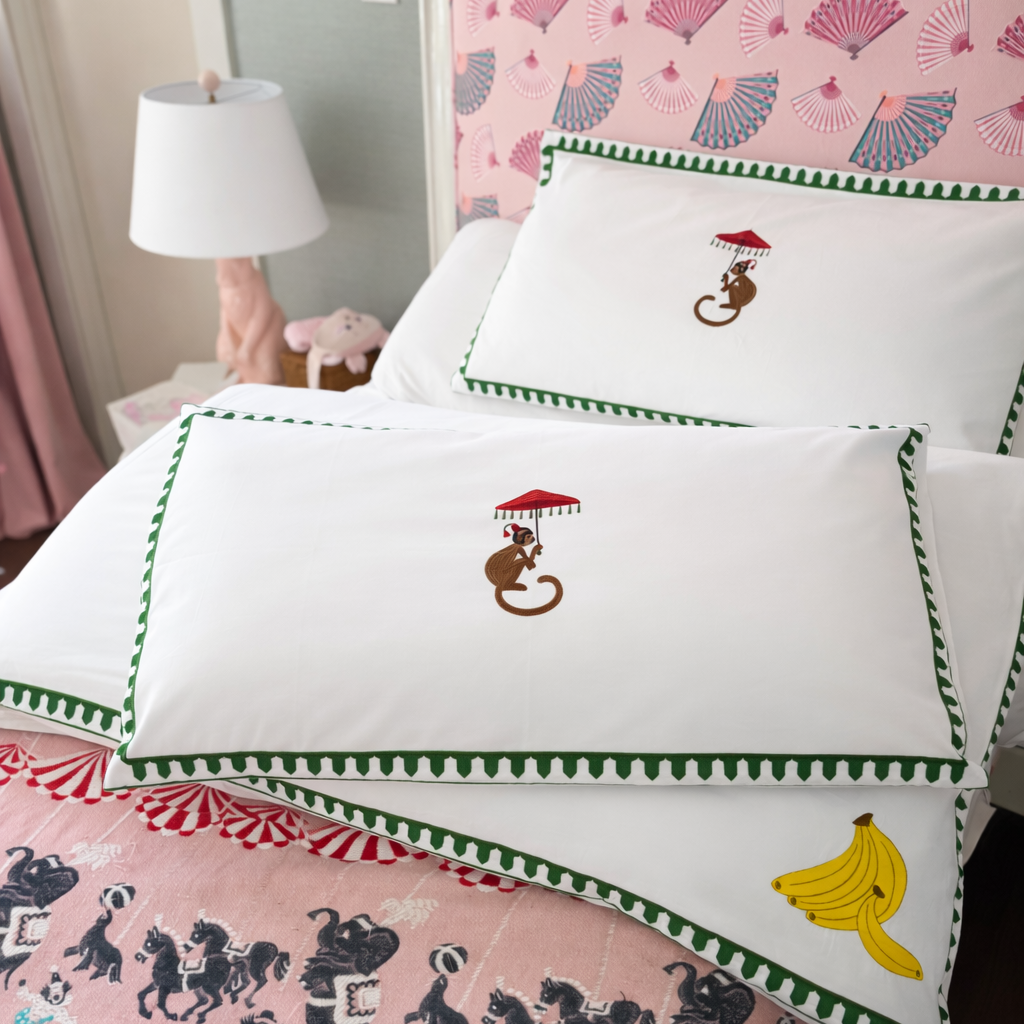 This duvet set brings the fun. Featuring an embroidered monkey with a parasol (and a bunch of bananas, of course), this playful bedding swings between cheeky and chic.