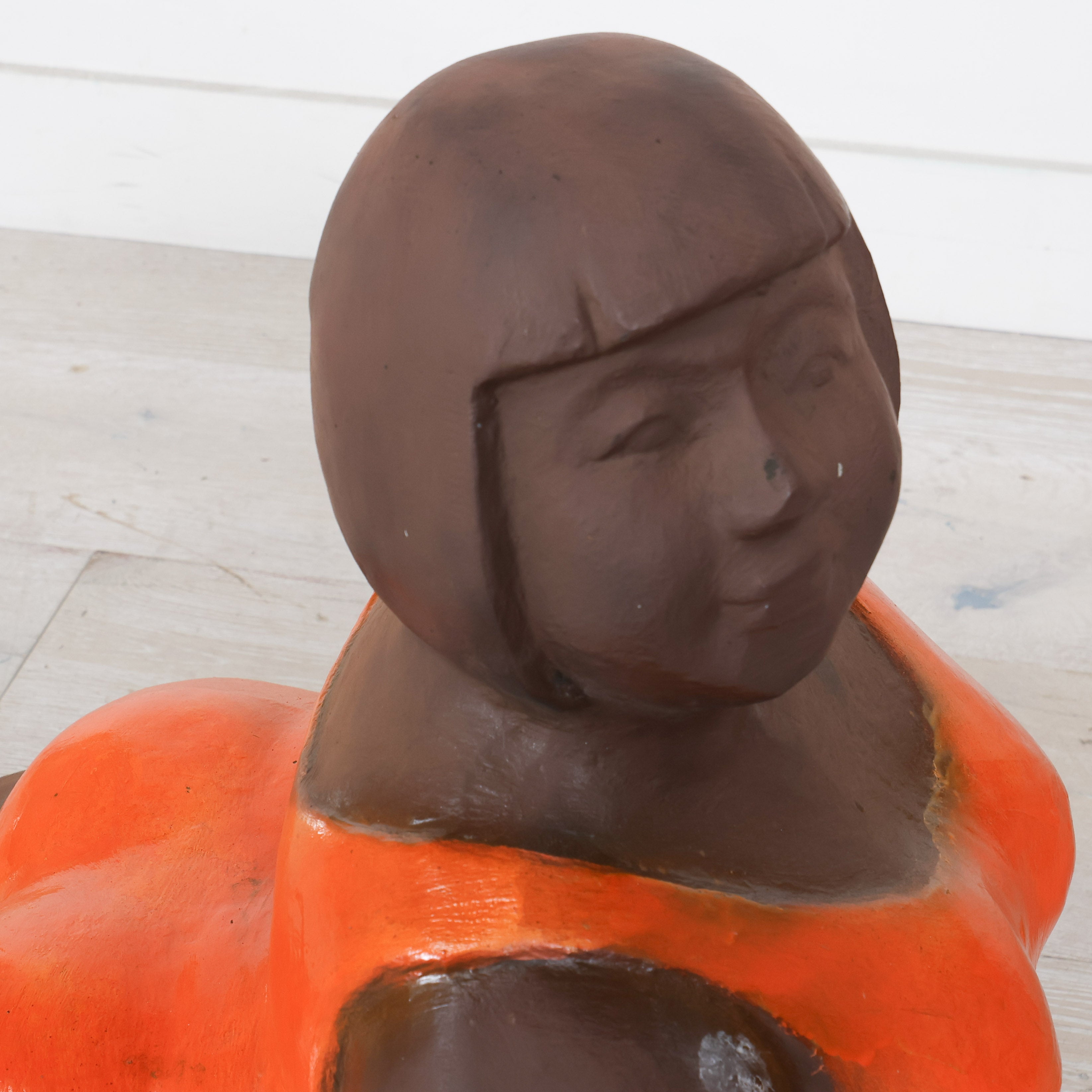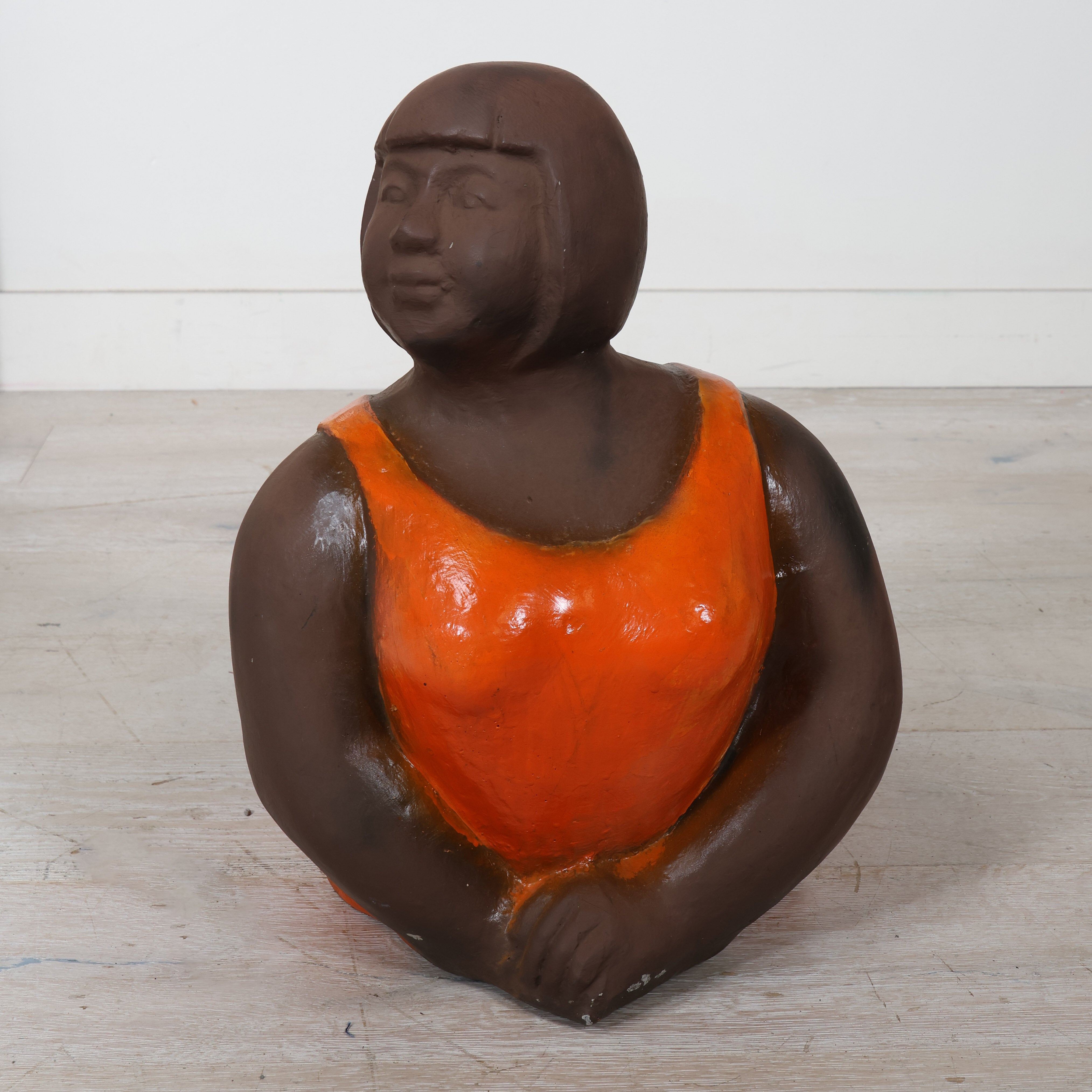 This lady features a rounded silhouette with a serene expression, finished in matte brown with a glossy orange bathing suit that pops against the form.