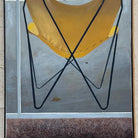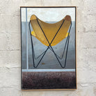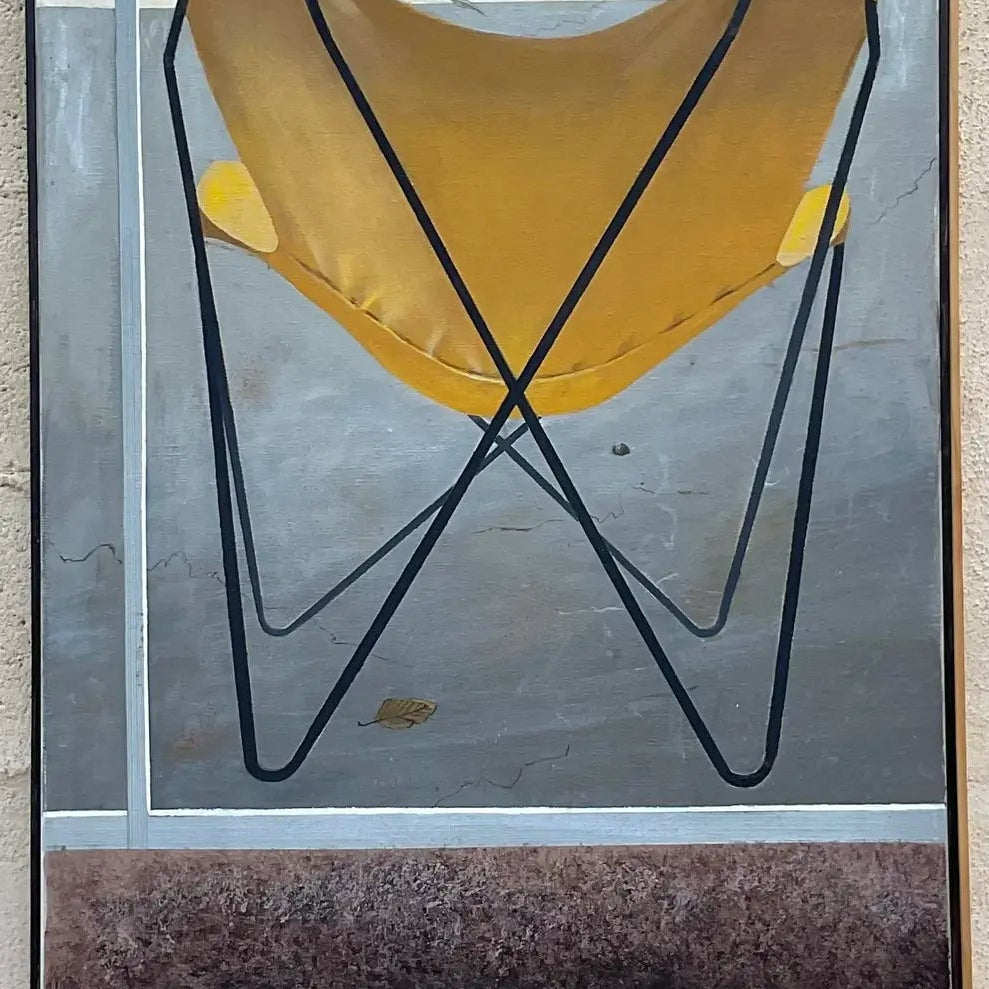 The painting features a striking yellow butterfly chair, its bold and iconic silhouette set against a muted background of grays and earthy tones. The artist's skillful use of light and shadow brings a sense of depth and dimension to the chair, making it the focal point of this still-life composition.