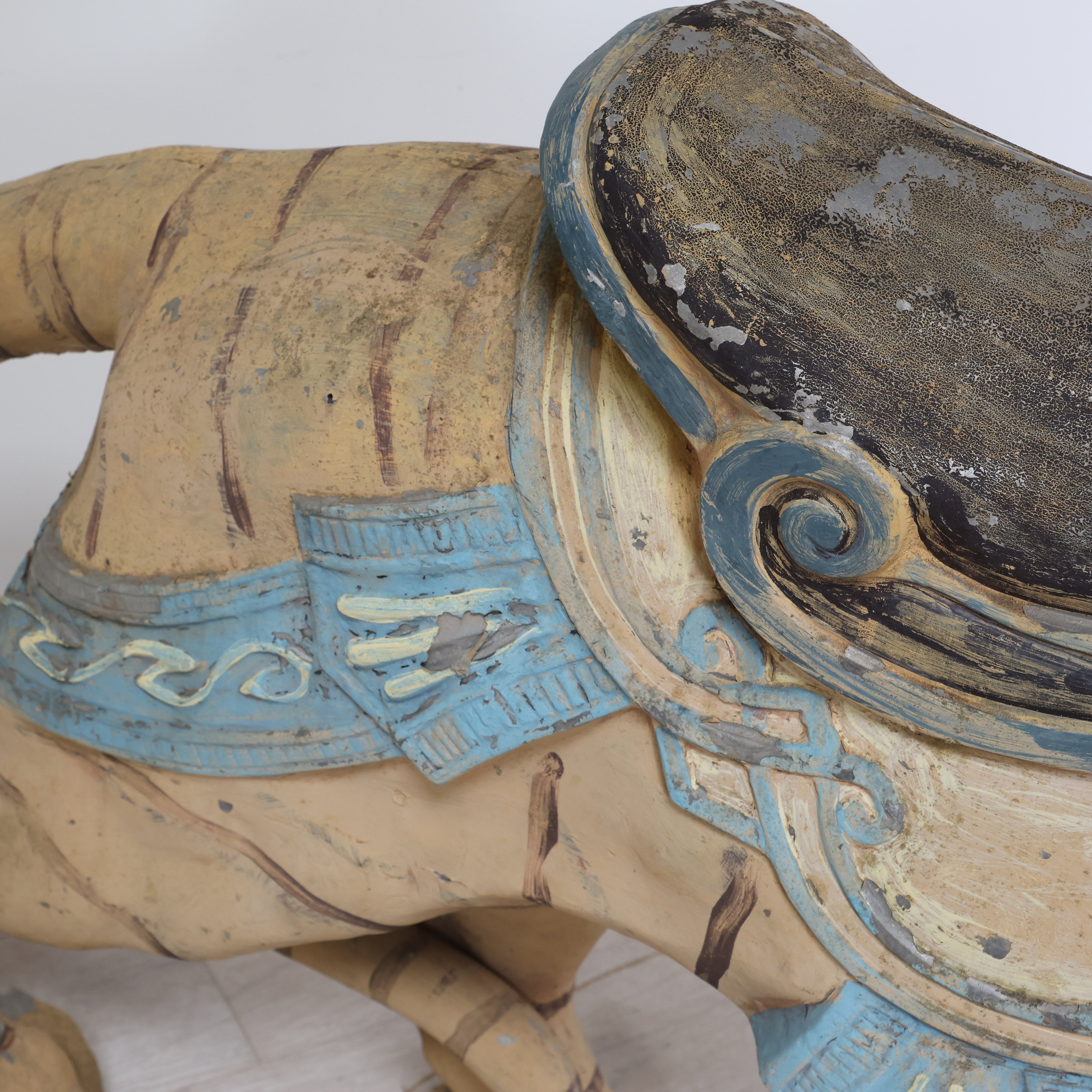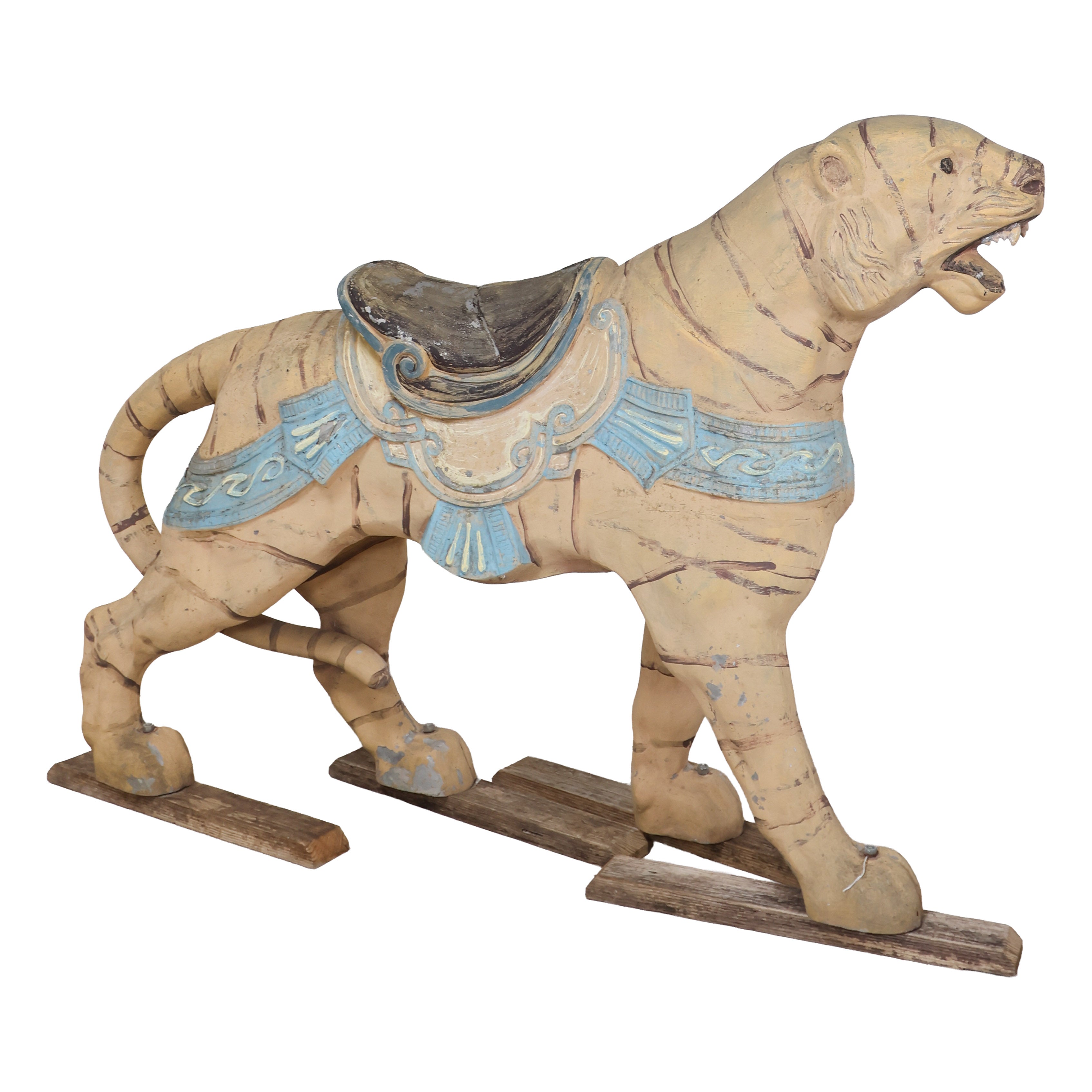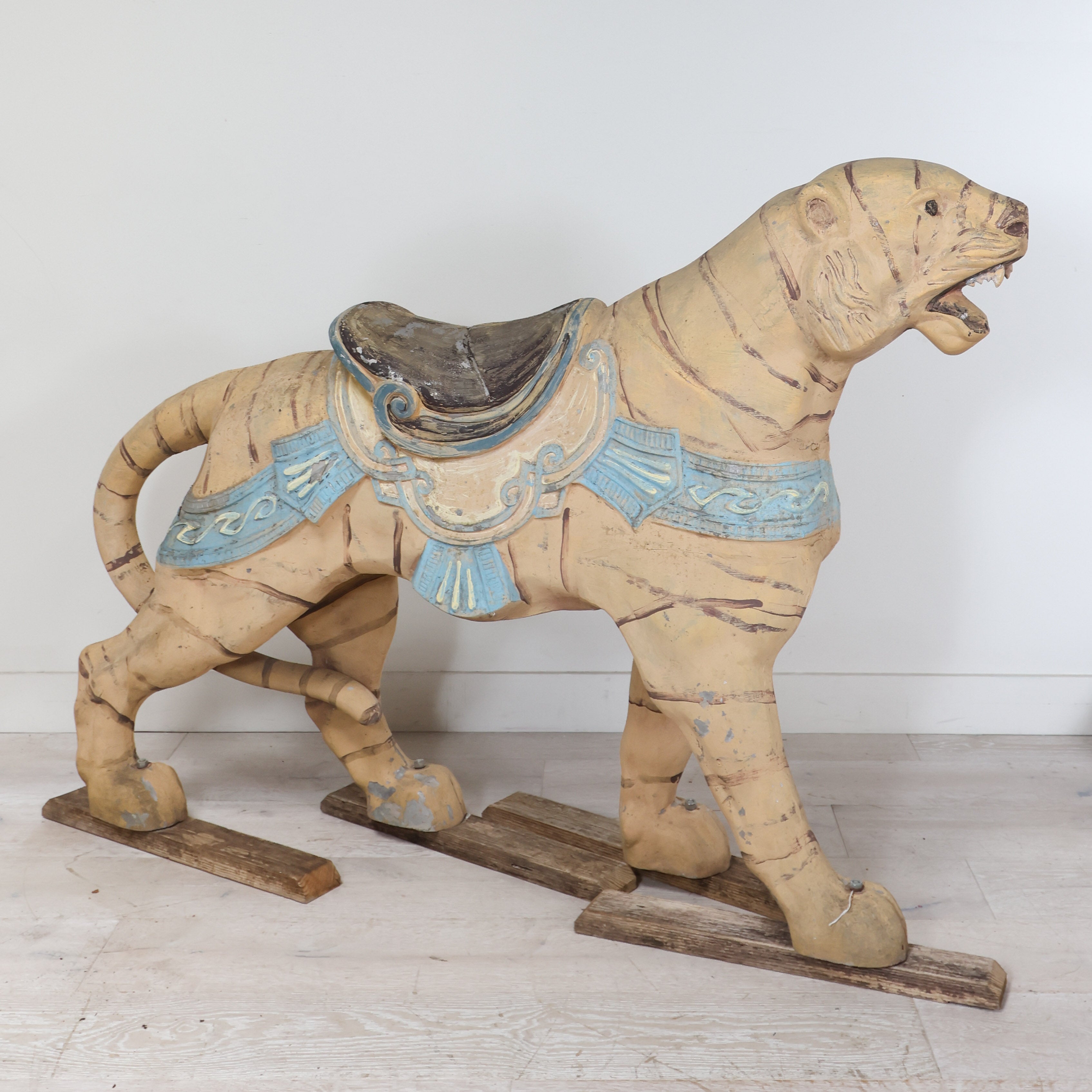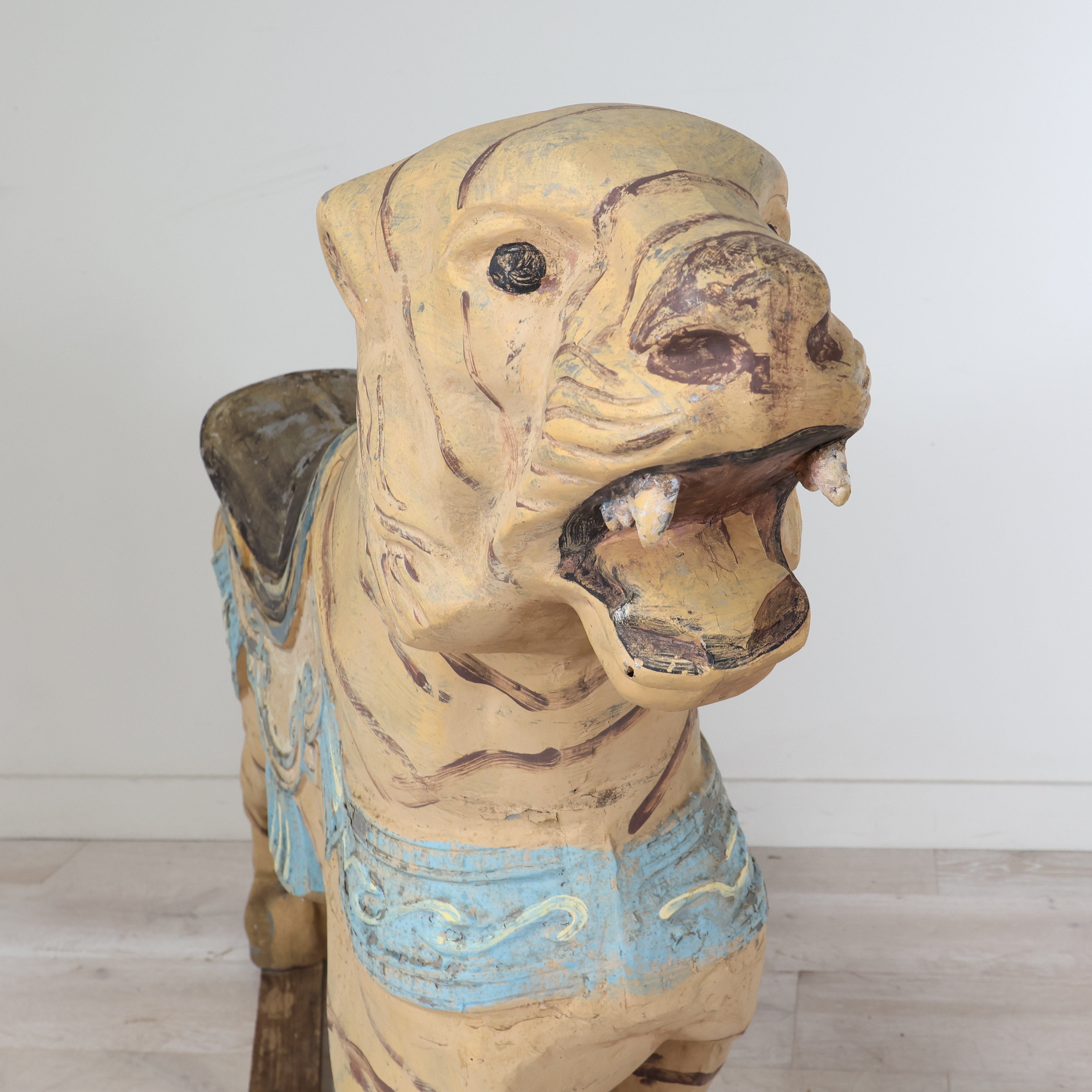 This hand-painted vintage carnival tiger looks like he walked straight off a carousel. We love the fierce (and cute) open-mouthed expression and the worn saddle seat.