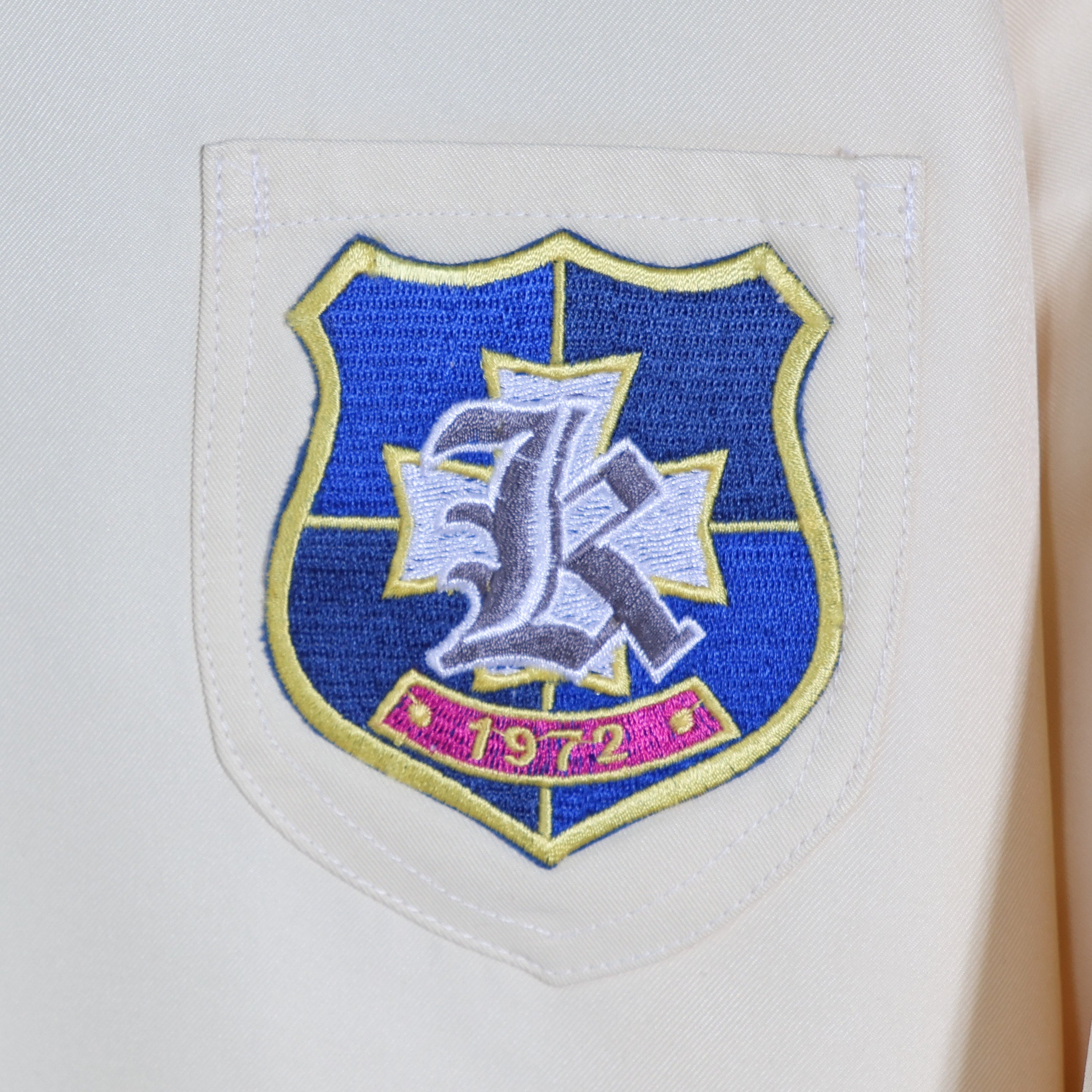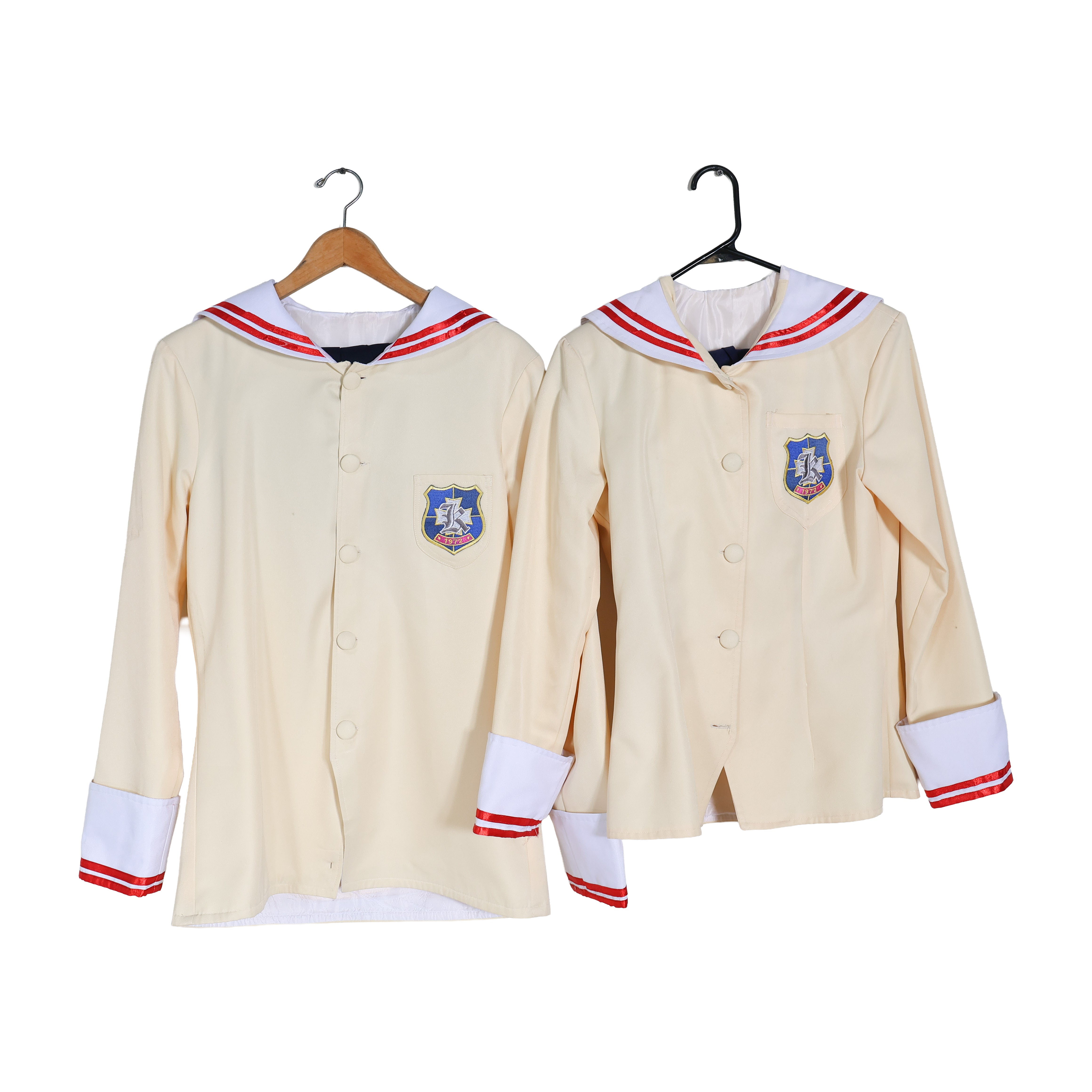 A pair of Clannad-inspired cosplay uniform tops, styled after the iconic school uniforms from the beloved anime series. Each cream-colored jacket features a classic sailor-style collar trimmed in bright red stripes, matching white cuffs, and a crest-style patch at the chest.