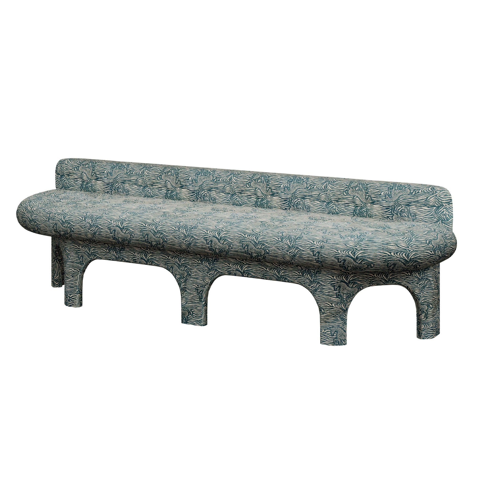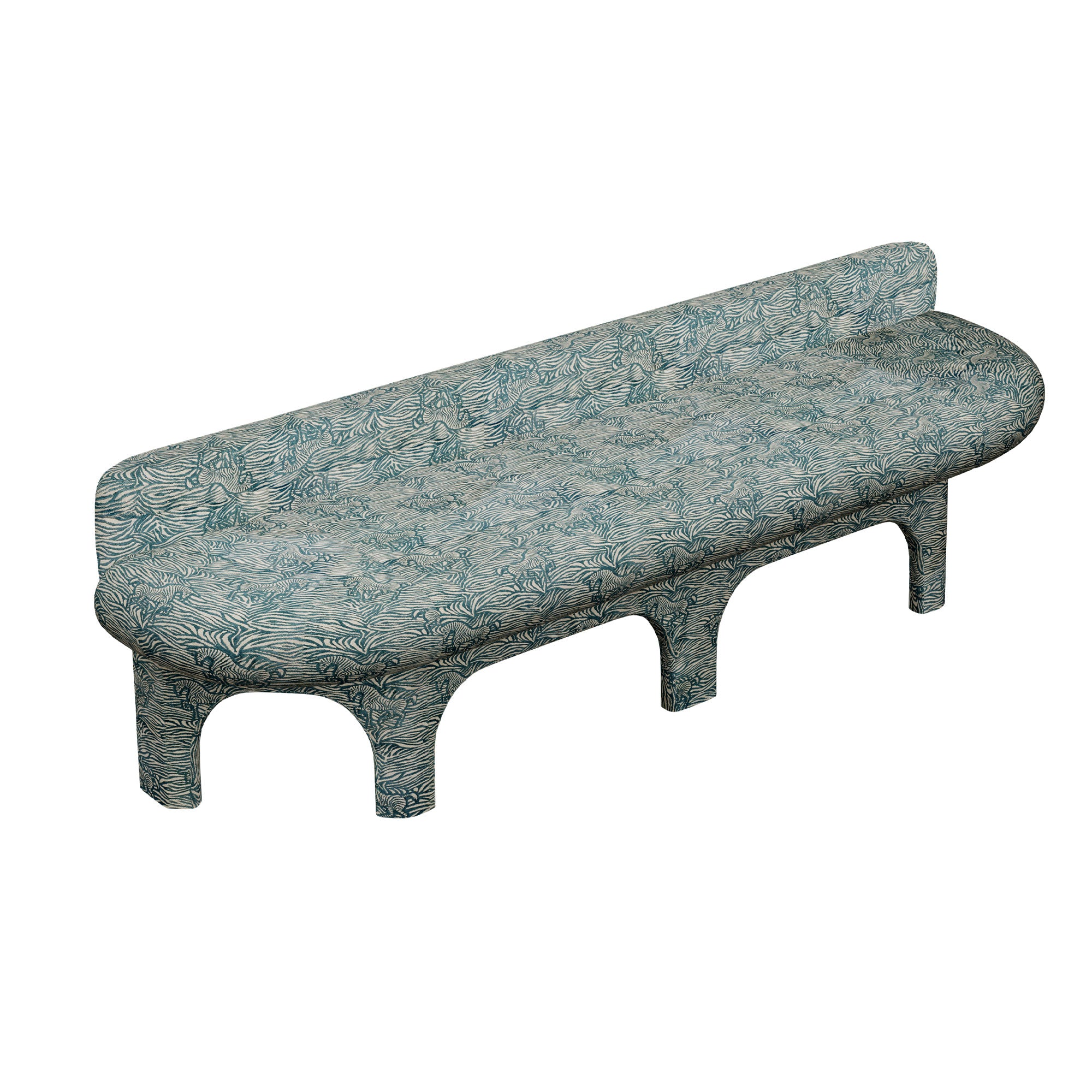Sculptural upholstered bench in a variety of showstopping fabrics. A fluid silhouette, upholstered legs, and undeniable presence create an almost creature-like form. A statement piece with personality.
