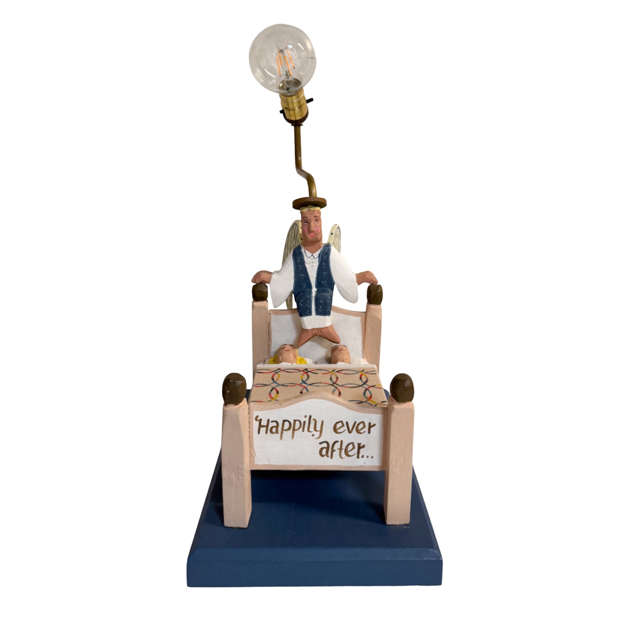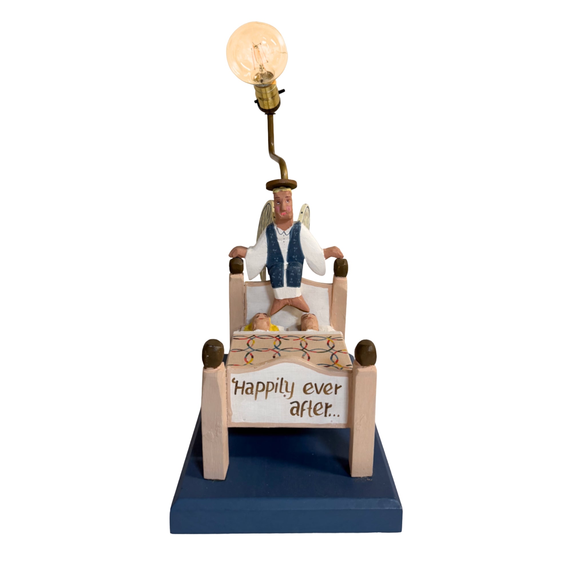 This hand-carved folk art lamp tells its own version of “happily ever after.”