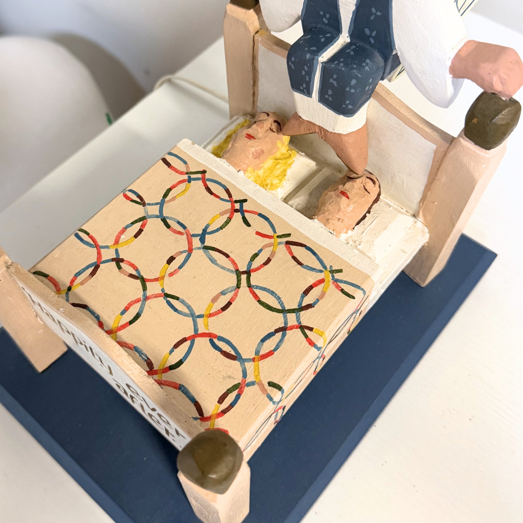 Featuring a whimsical carved scene of a winged groom perched triumphantly atop a wedding bed (yes, really), this piece leans fully into the humor and storytelling that makes vintage folk art so collectible. Hand-painted details, exaggerated proportions, and the cheeky inscription give it a one-of-a-kind, almost fairytale-meets-fever-dream quality.