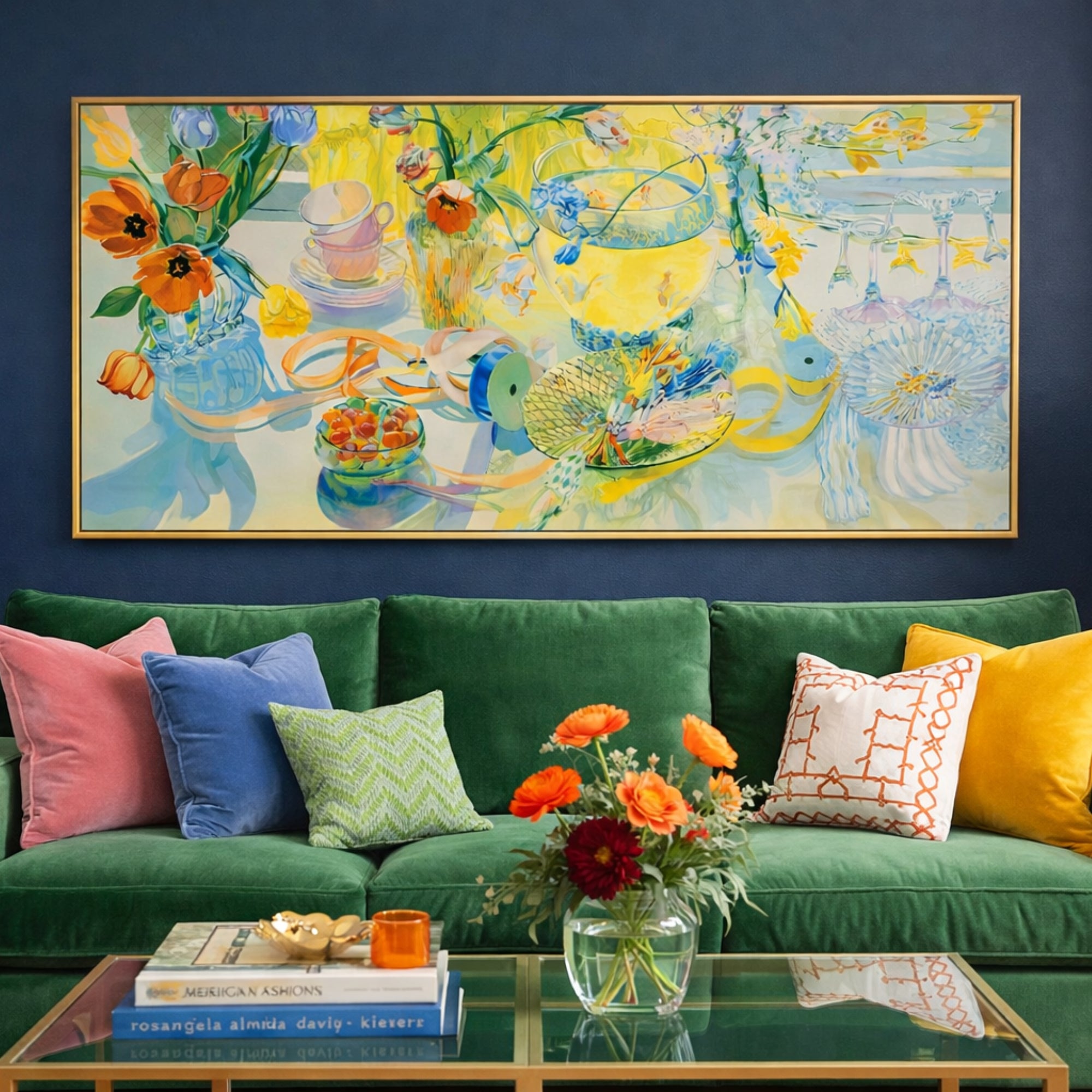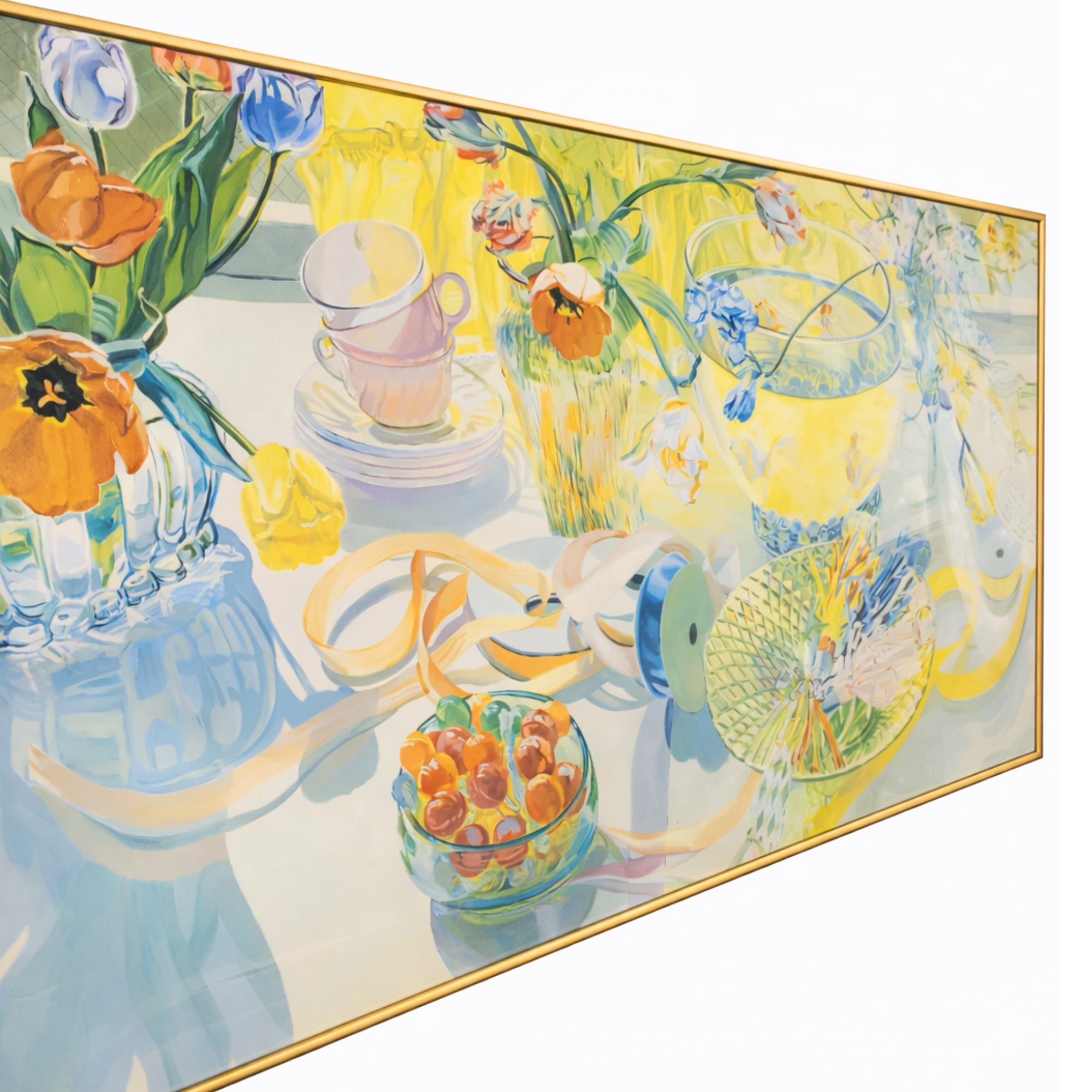 “Spring Party” by Janet Fish is all light, color, and layered detail—glassware, florals, ribbon, and a little bit of chaos in the best way. The palette is bright but controlled, and the way everything overlaps and reflects gives it that signature Fish depth. Printed in 1981 and framed in a thin gold frame. Wire on back for hanging. 55”x22”
