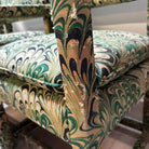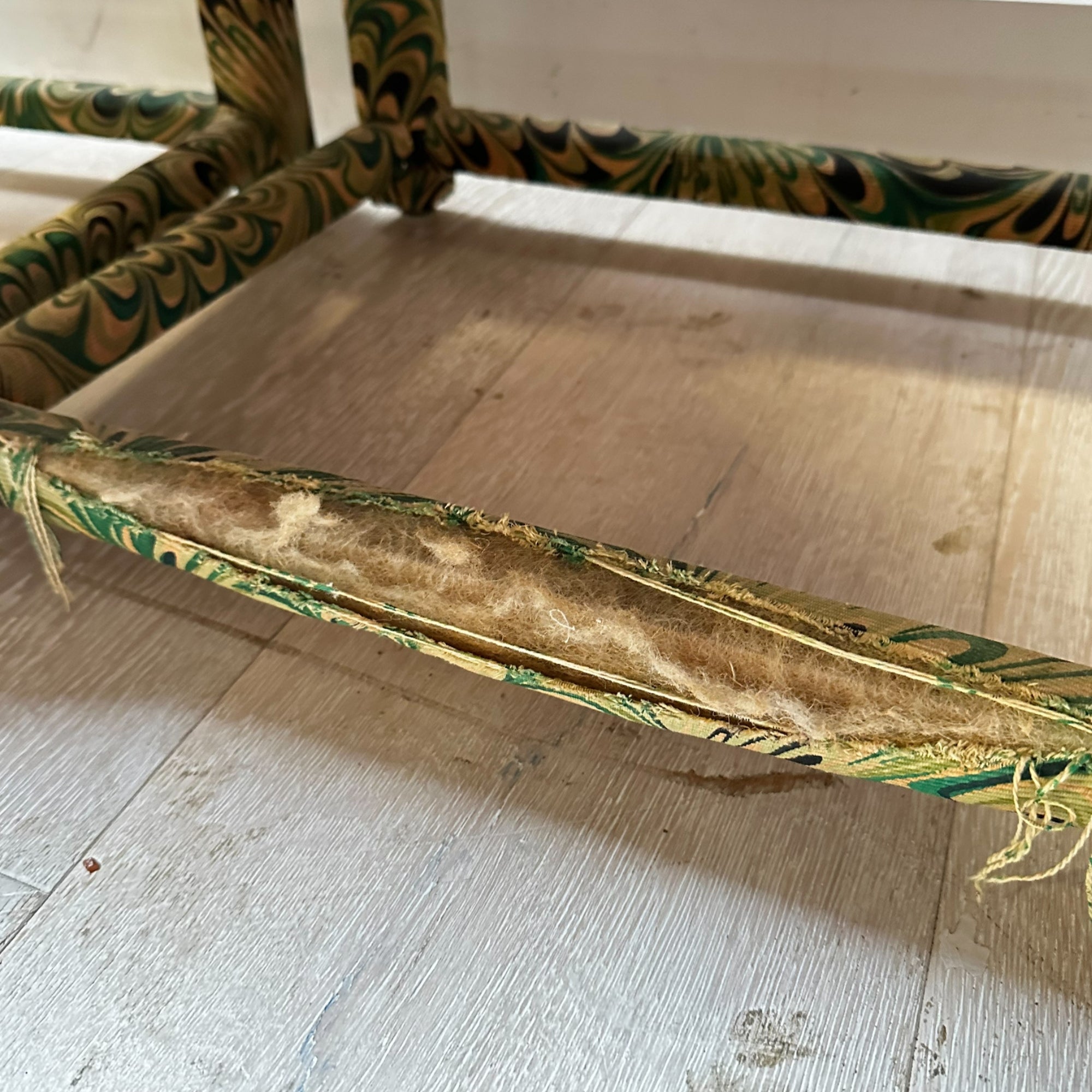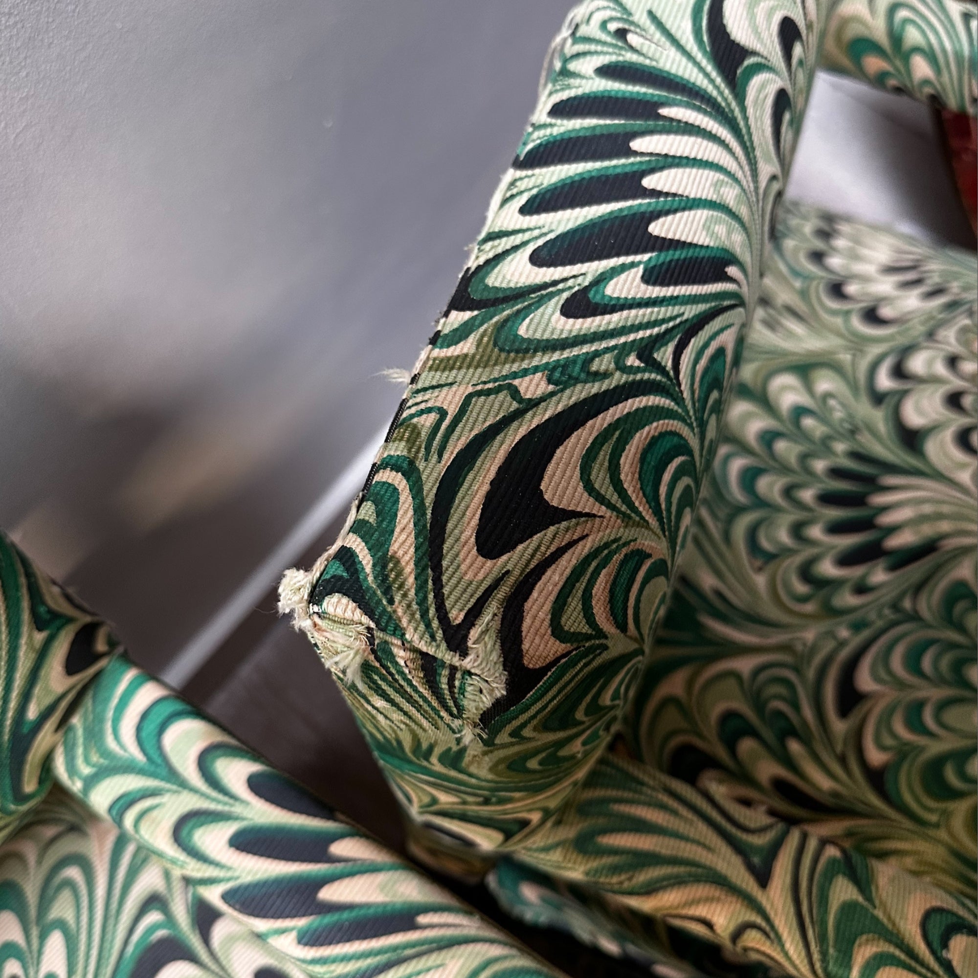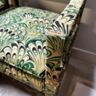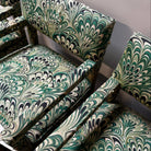 Make a statement with this bold set of four Parsons chairs, wrapped in a stunning green marble-style fabric with swirls of emerald, gold, black, and cream. Equal parts classic and eye-catching, these chairs bring personality to any dining room, office, or creative space.