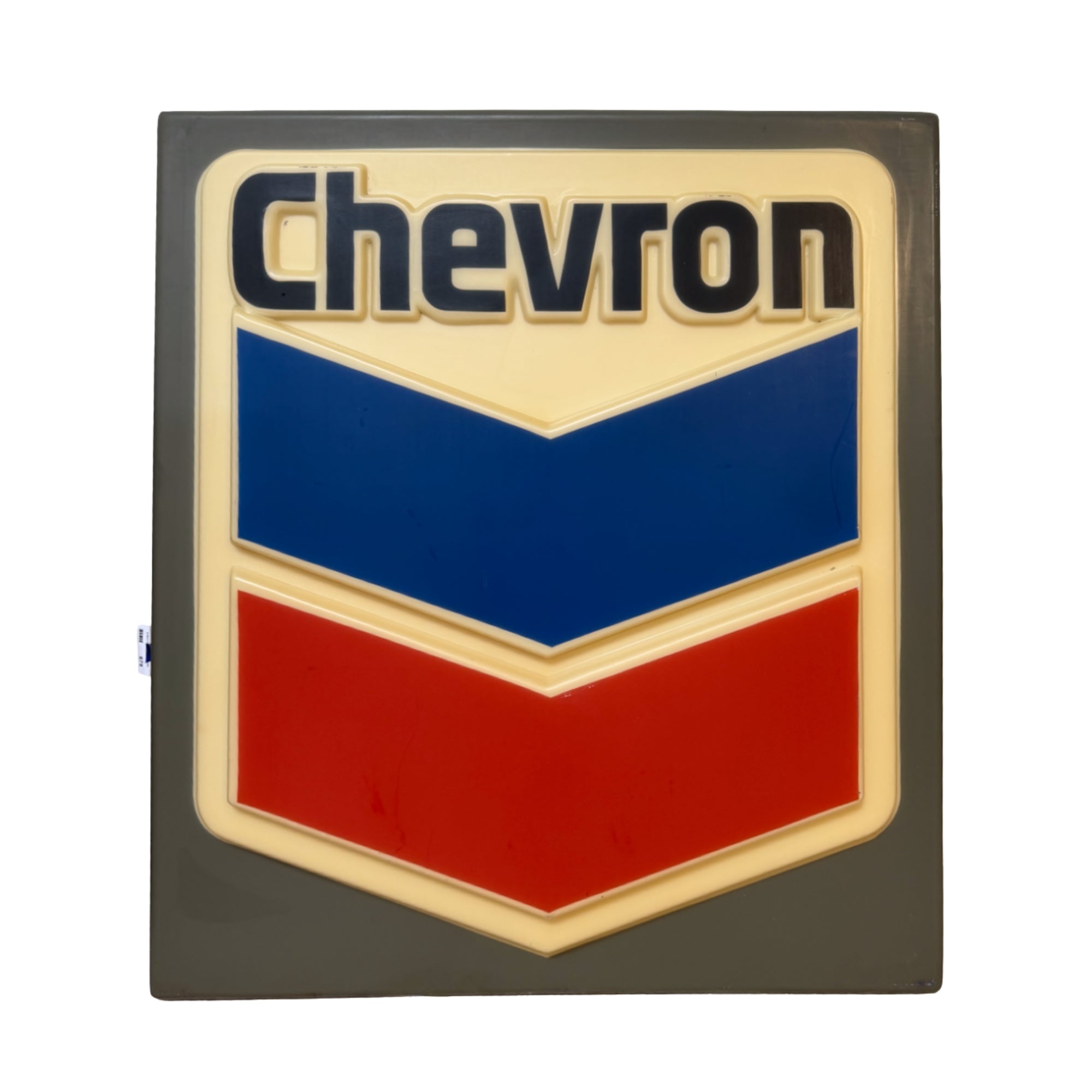 Featuring the iconic red, white, and blue Chevron shield, this piece likely dates to the late 20th century when illuminated plastic panel signs were used at service stations and garages. The softly diffused backing gives it that unmistakable glow (even unlit), making it feel more like a sculptural object than just wall decor.