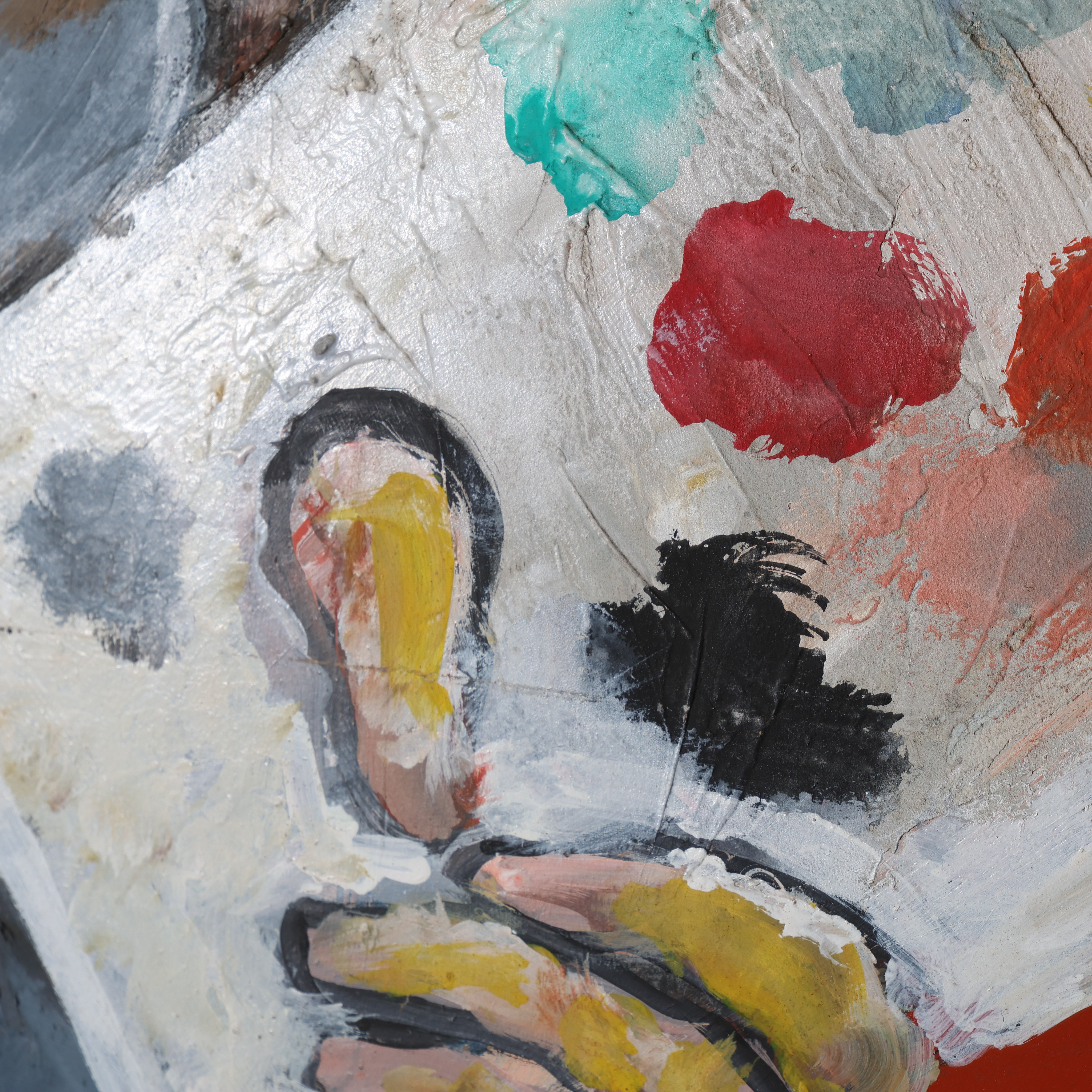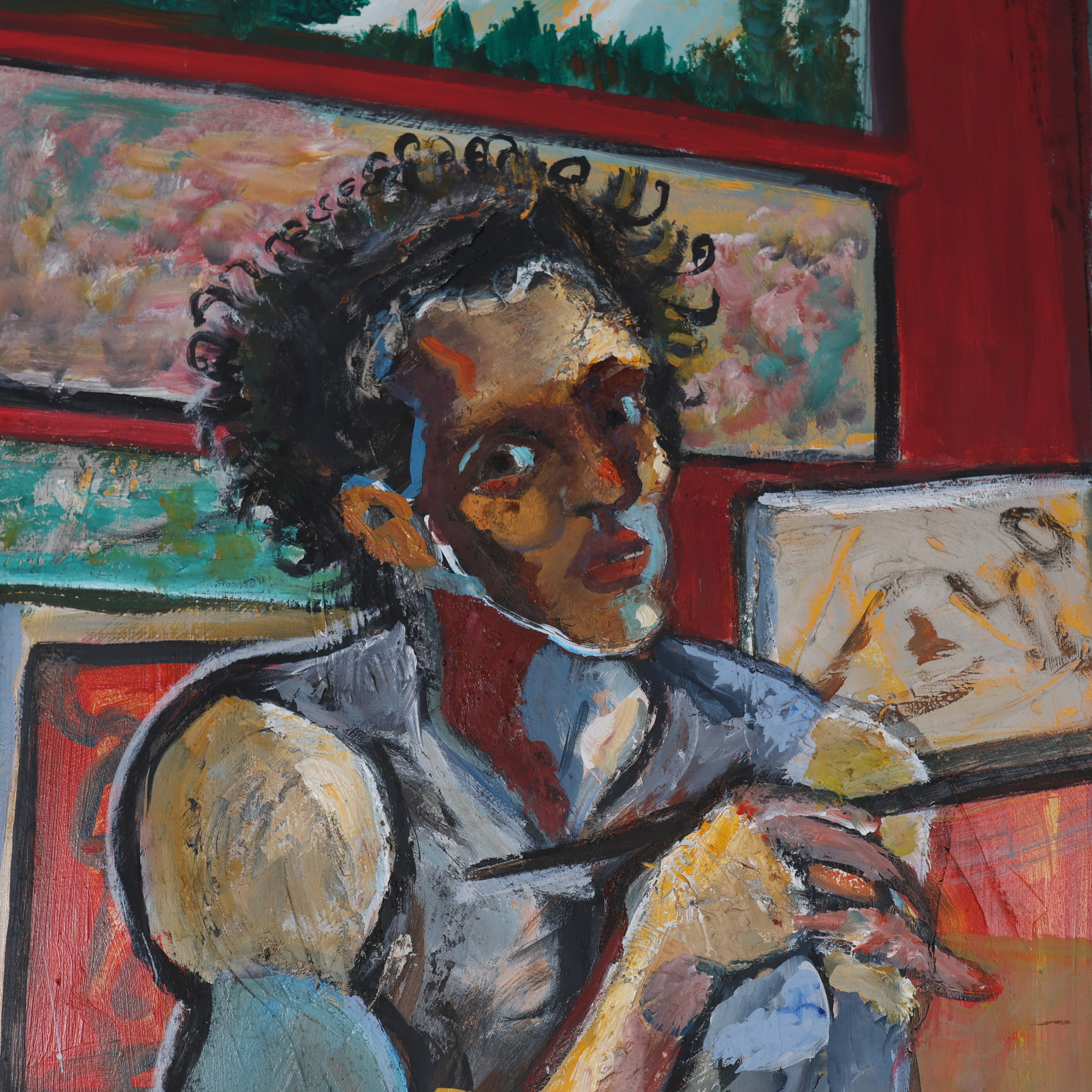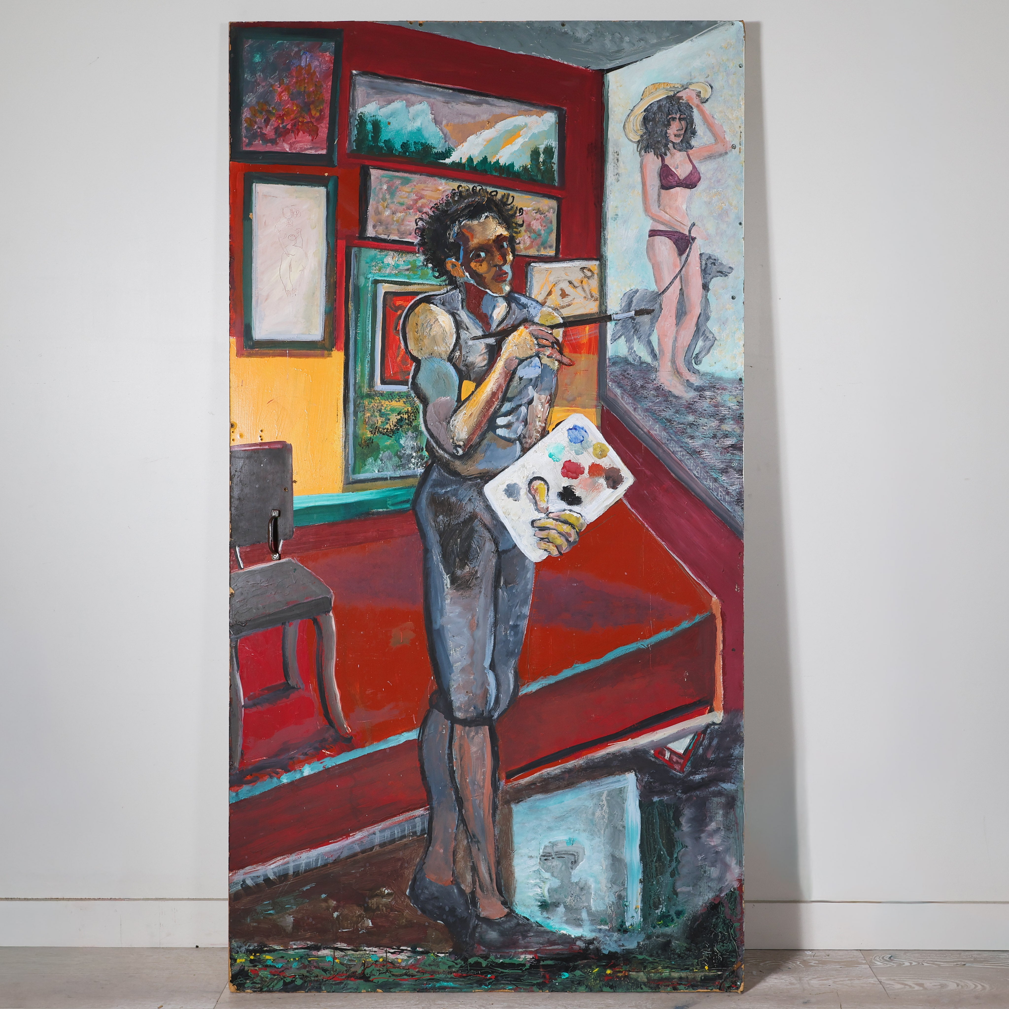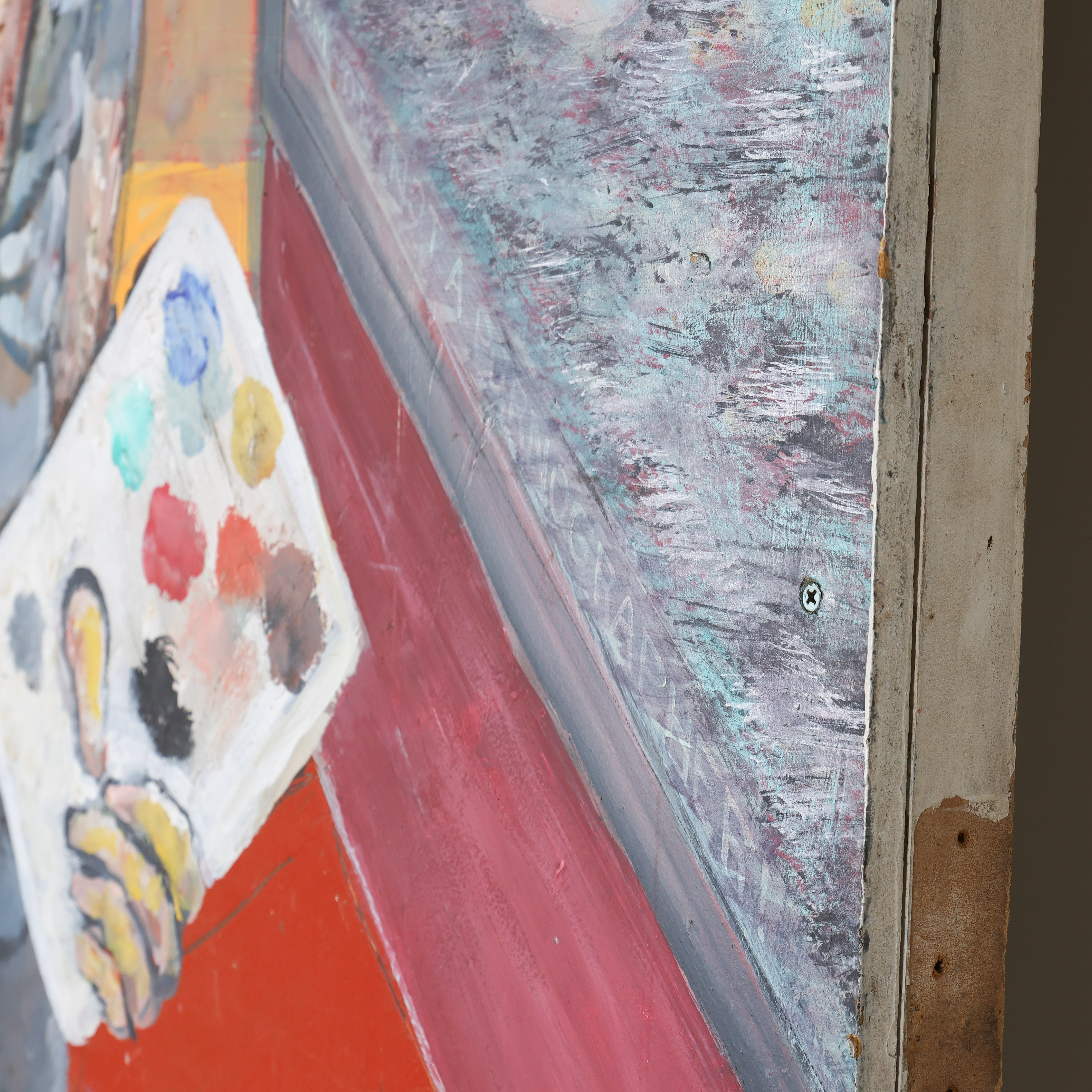 A beautifully layered composition painted directly onto a reclaimed door. This giant expressionistic work shows a male artist mid-process, palette in hand, as he paints a female figure. Around him, a patchwork of framed landscapes and abstract scenes fills the walls, creating an eclectic studio setting that feels alive with color and movement.