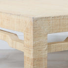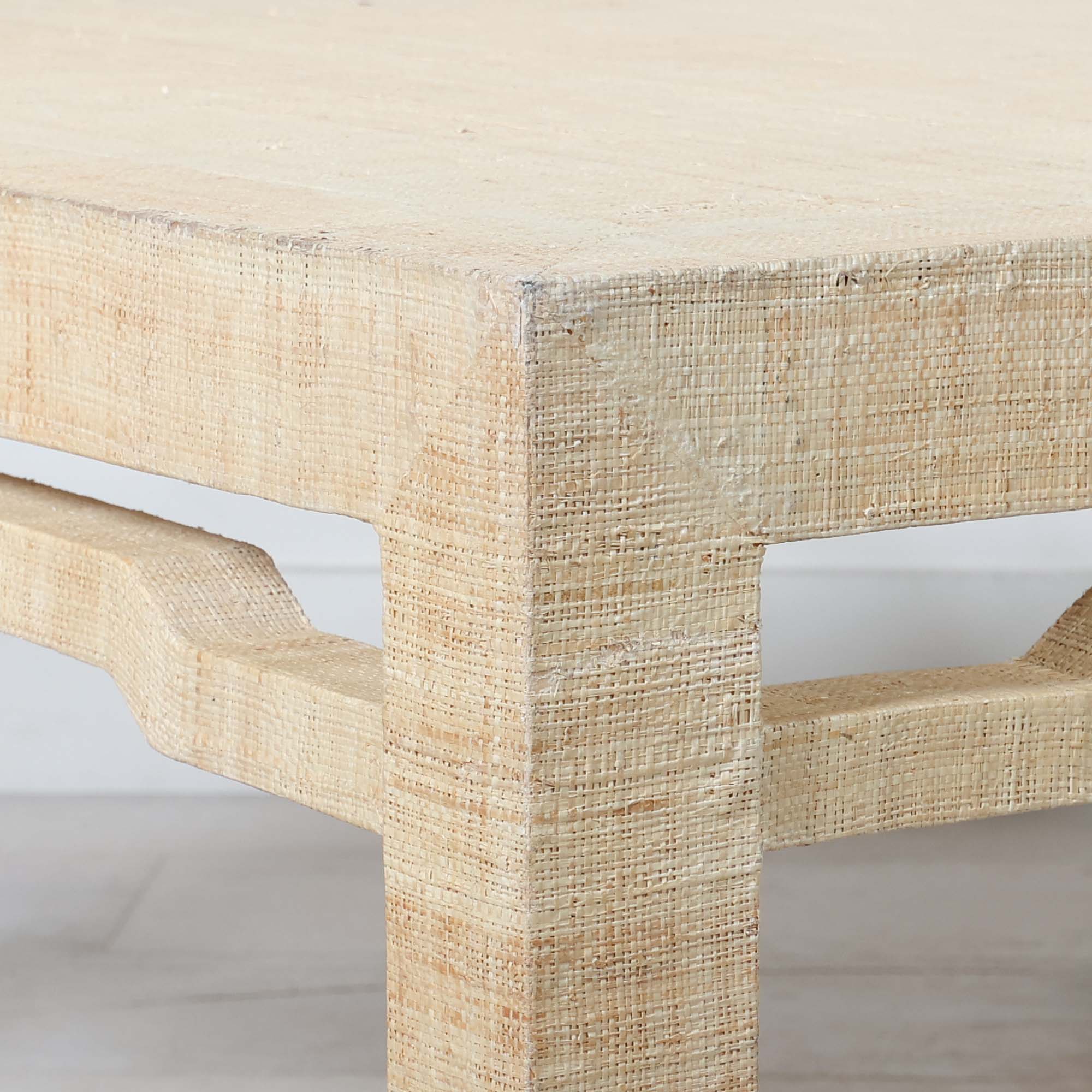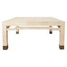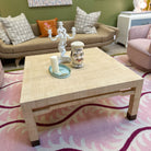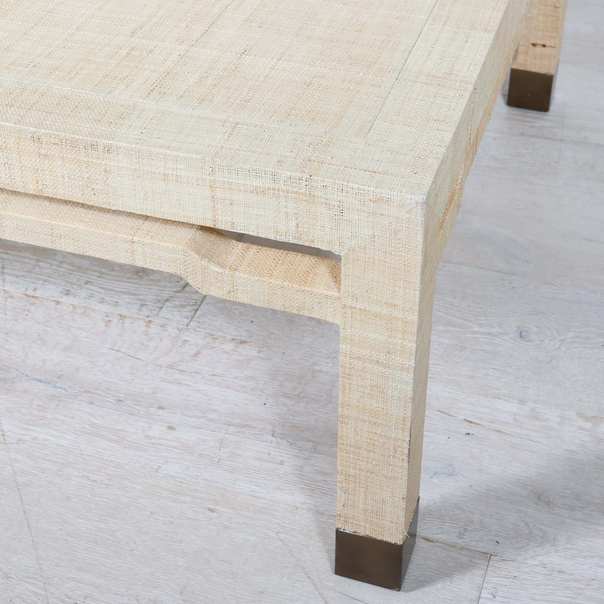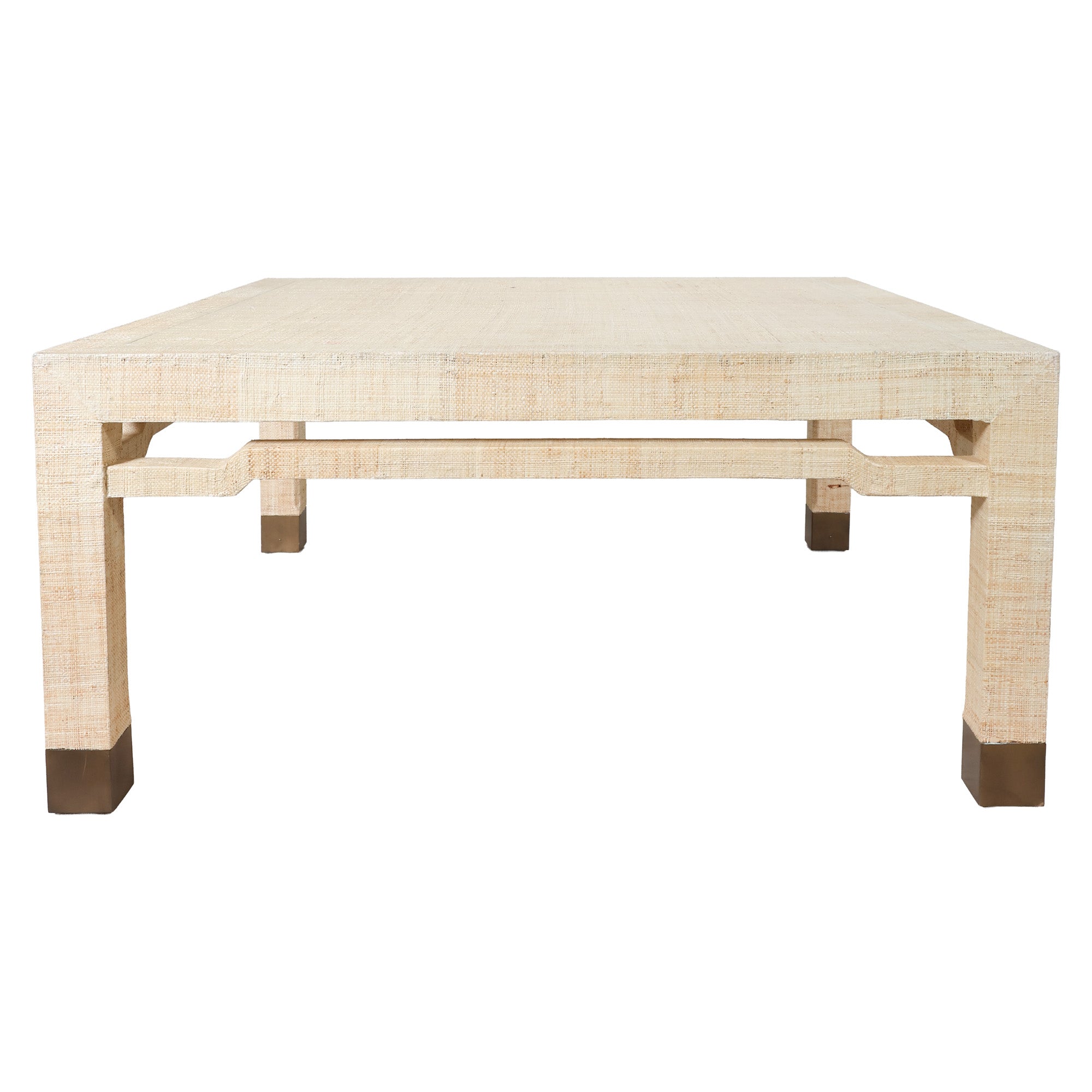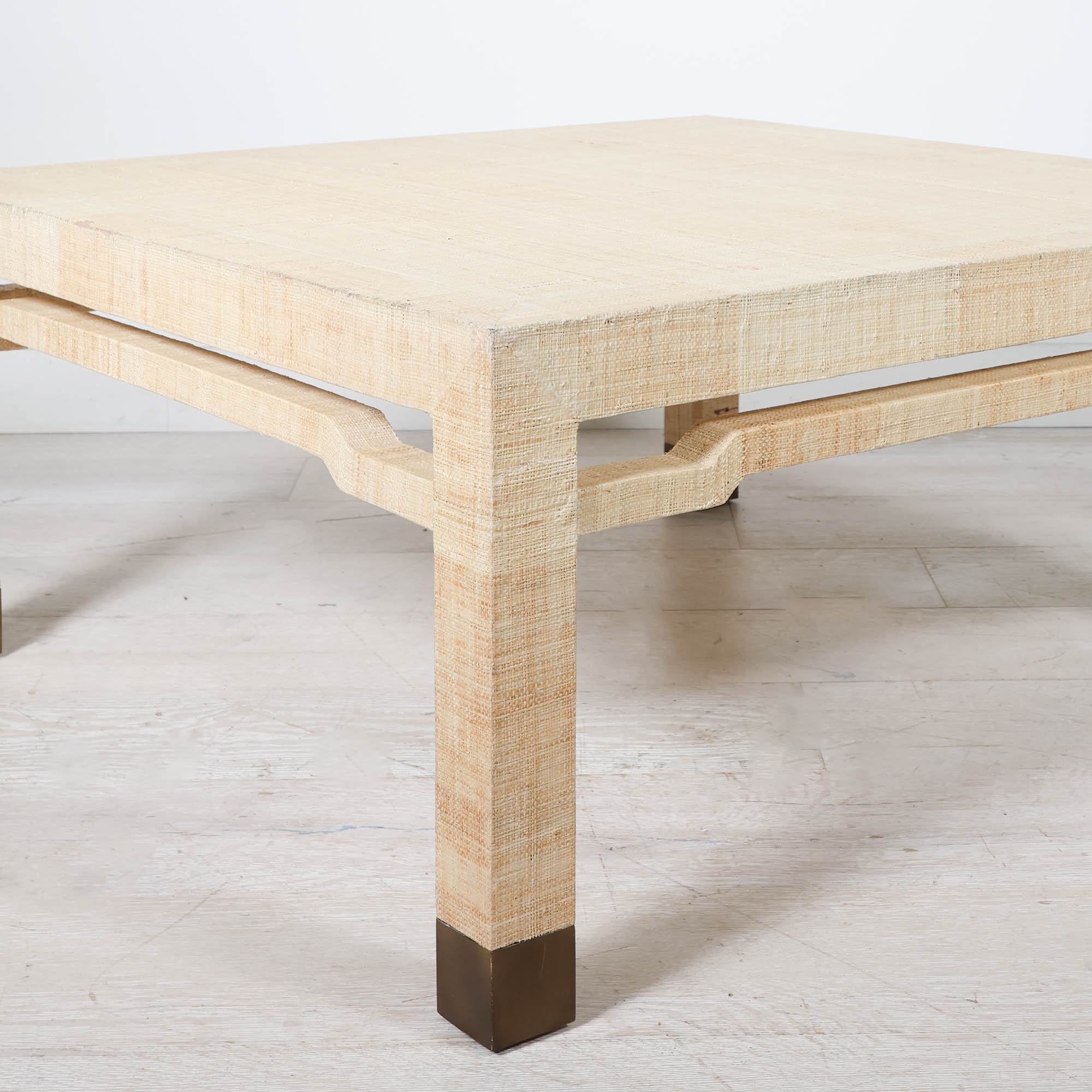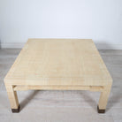 This large square vintage coffee table features a light tan raffia grasscloth finish and beautiful brass capped feet. Equally at home with a formal sofa or a laid-back sectional, this one is all about quiet confidence and natural texture done right.