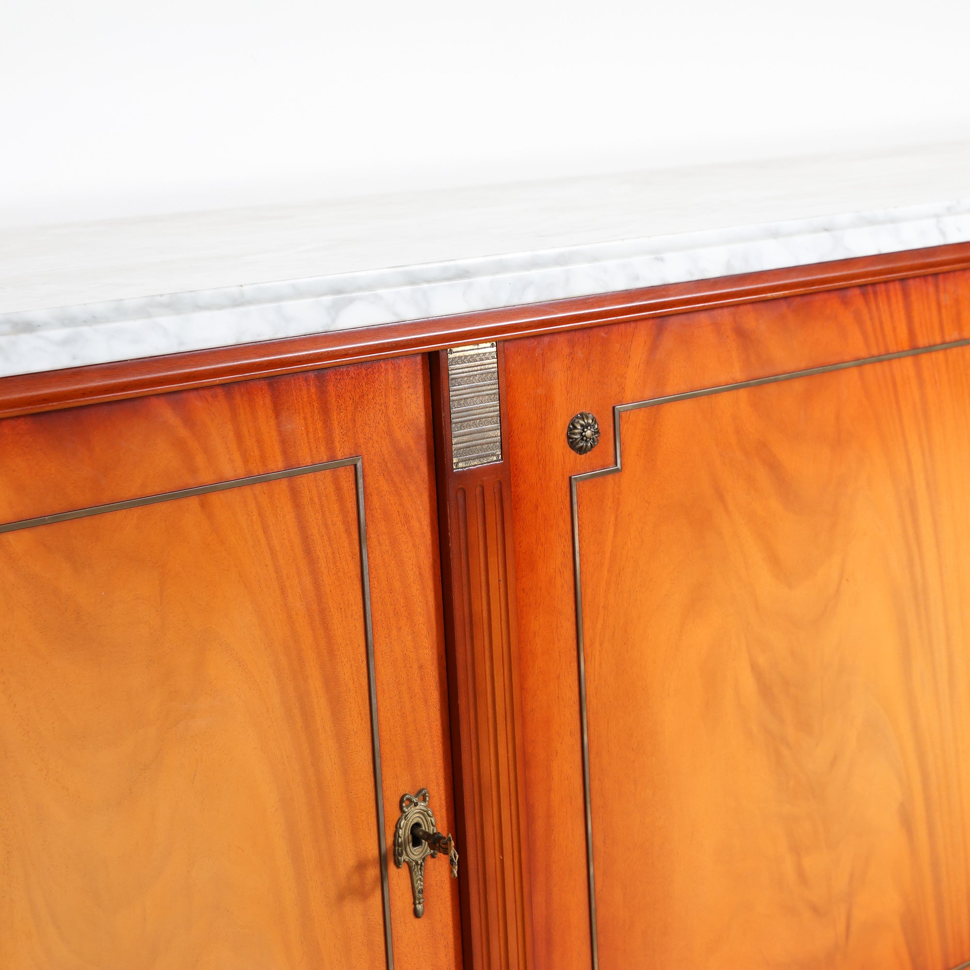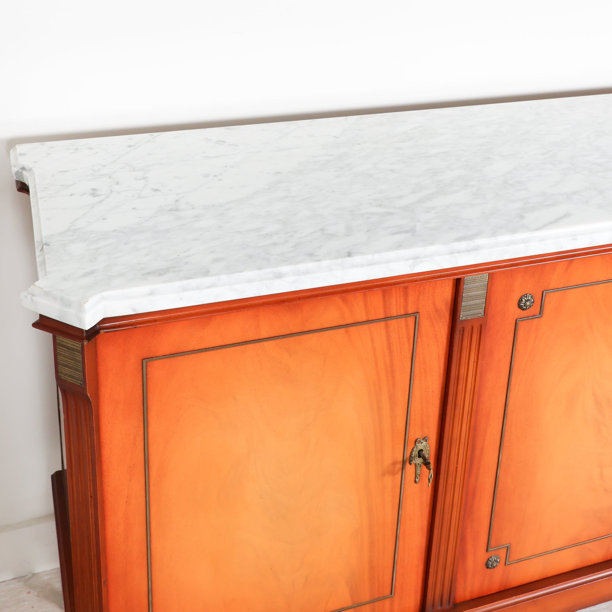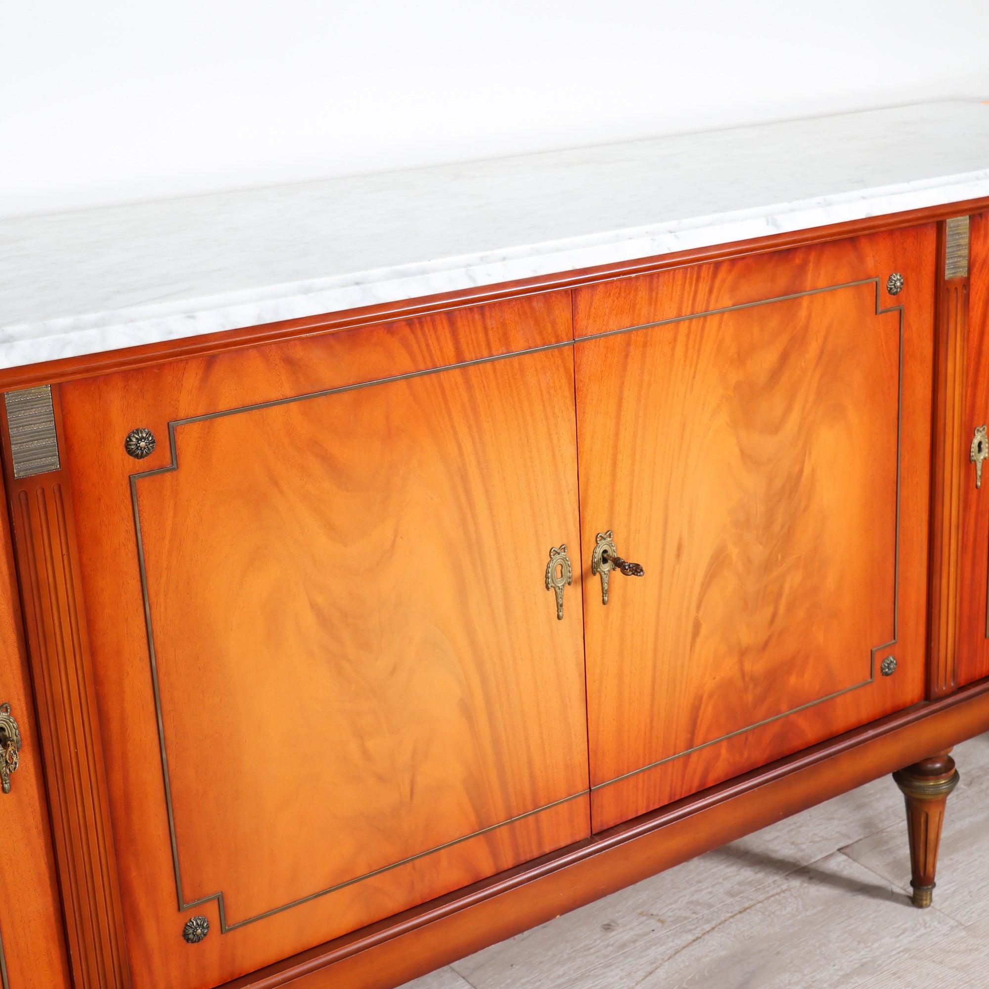 Crafted in richly figured wood, this Louis XVI–style sideboard features beautifully balanced veneer panels framed with subtle inlay detailing. The clean form is softened by tapered, fluted legs and delicate brass accents, all hallmarks of the Louis XVI tradition. A crisp white marble top crowns the piece, offering contrast and a polished surface perfect for serving, styling, or everyday use.