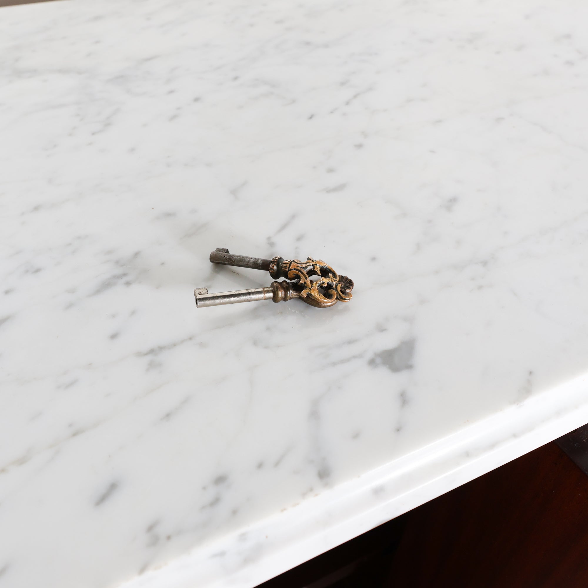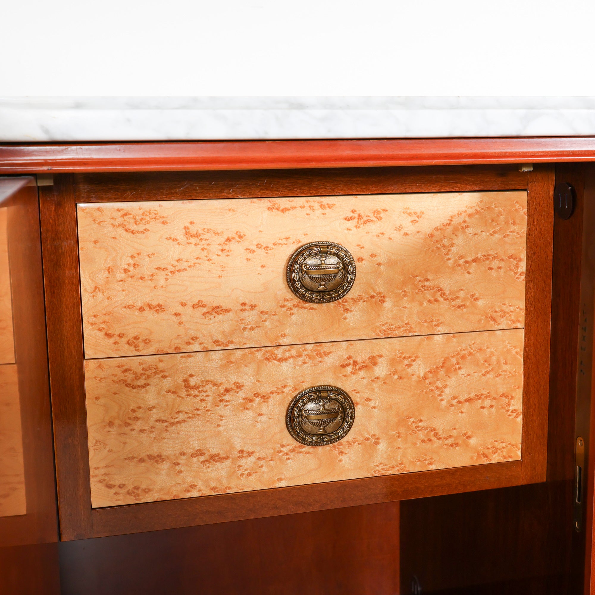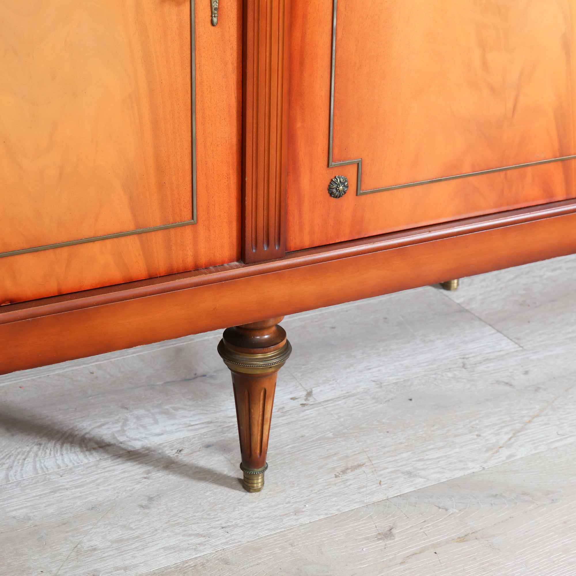 Crafted in richly figured wood, this Louis XVI–style sideboard features beautifully balanced veneer panels framed with subtle inlay detailing. The clean form is softened by tapered, fluted legs and delicate brass accents, all hallmarks of the Louis XVI tradition. A crisp white marble top crowns the piece, offering contrast and a polished surface perfect for serving, styling, or everyday use.