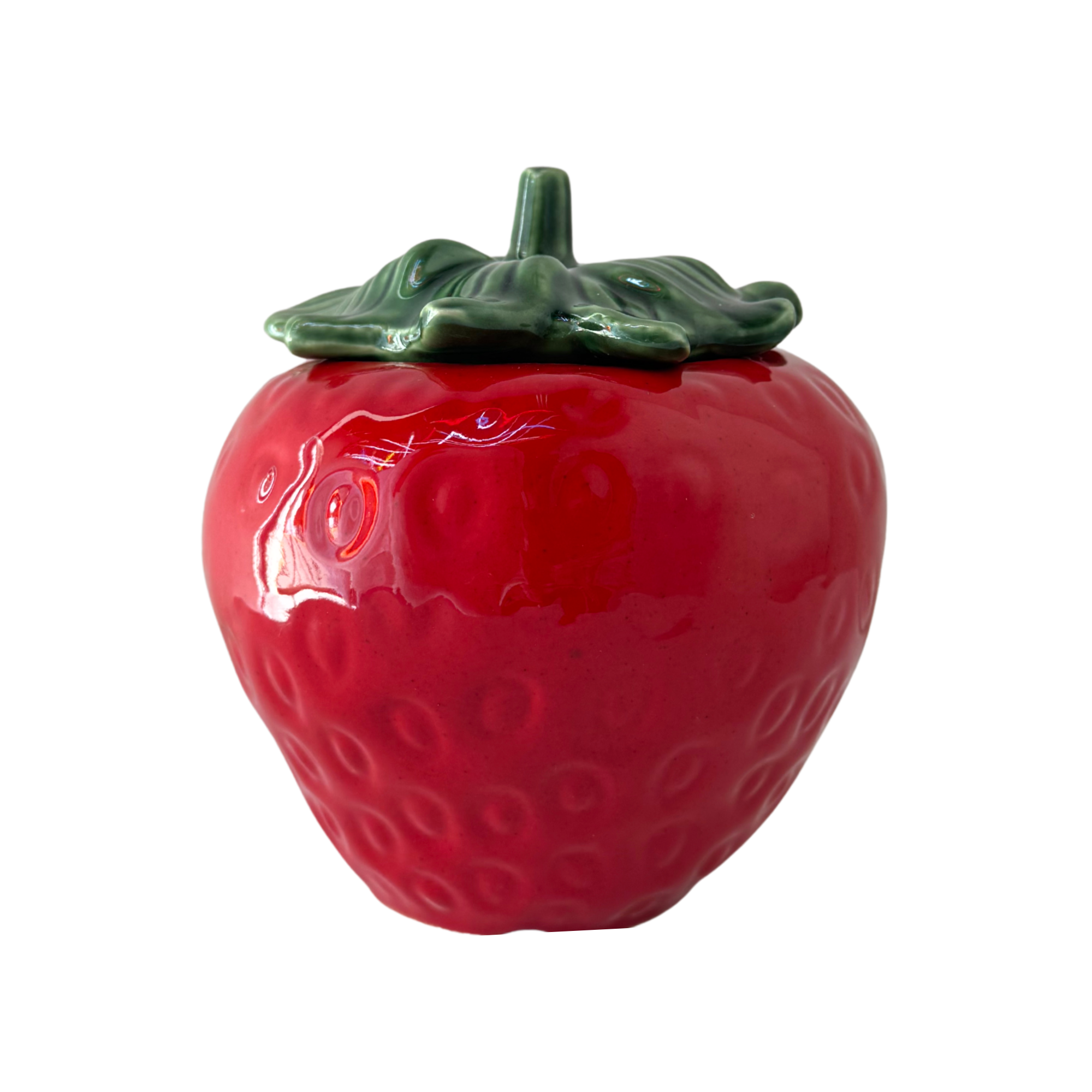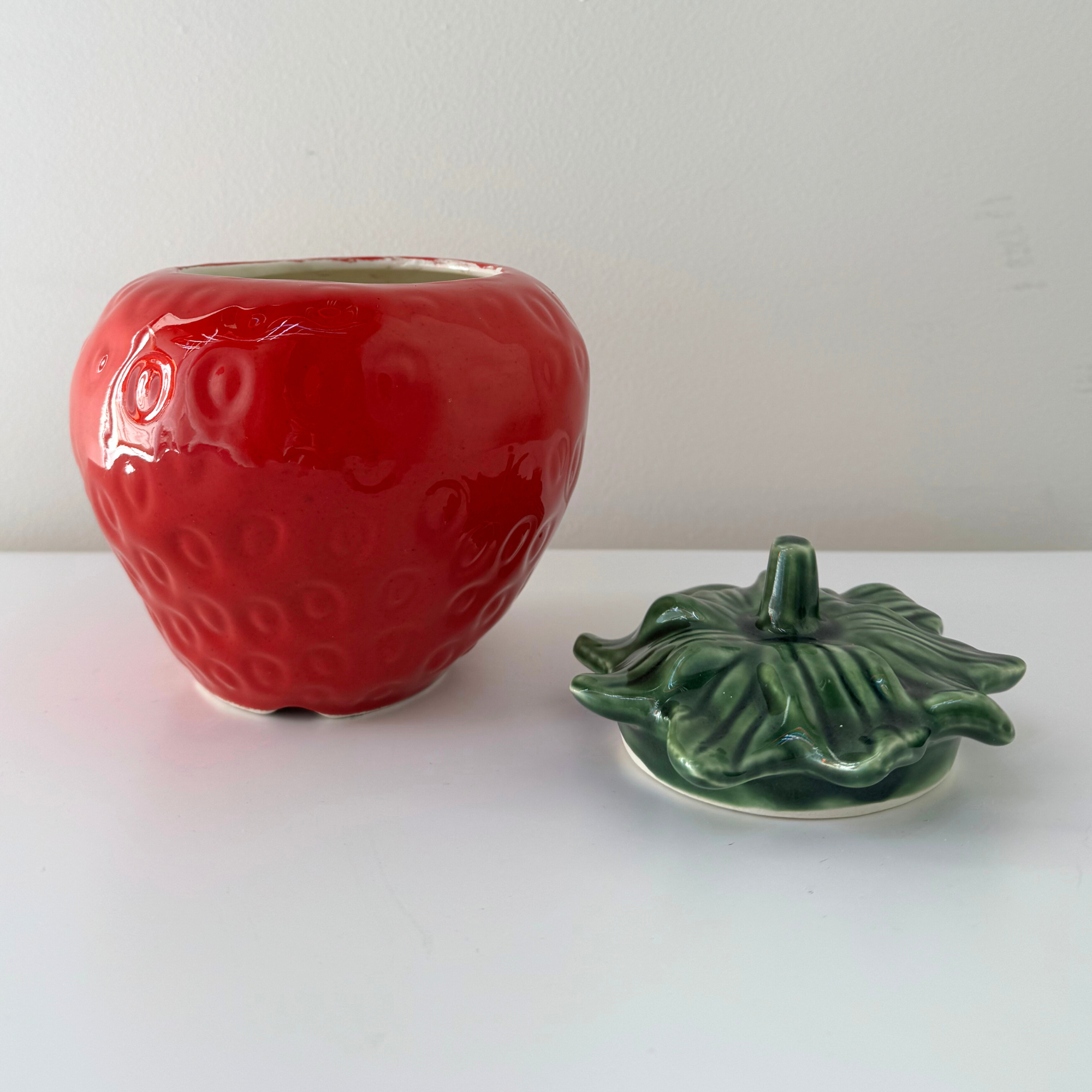 This vintage ceramic strawberry cookie jar from the 1970s by House of Webster is finished in a bright red glaze with a green stem lid and white interior. Stamped on the bottom and shaped with a gently flared top.