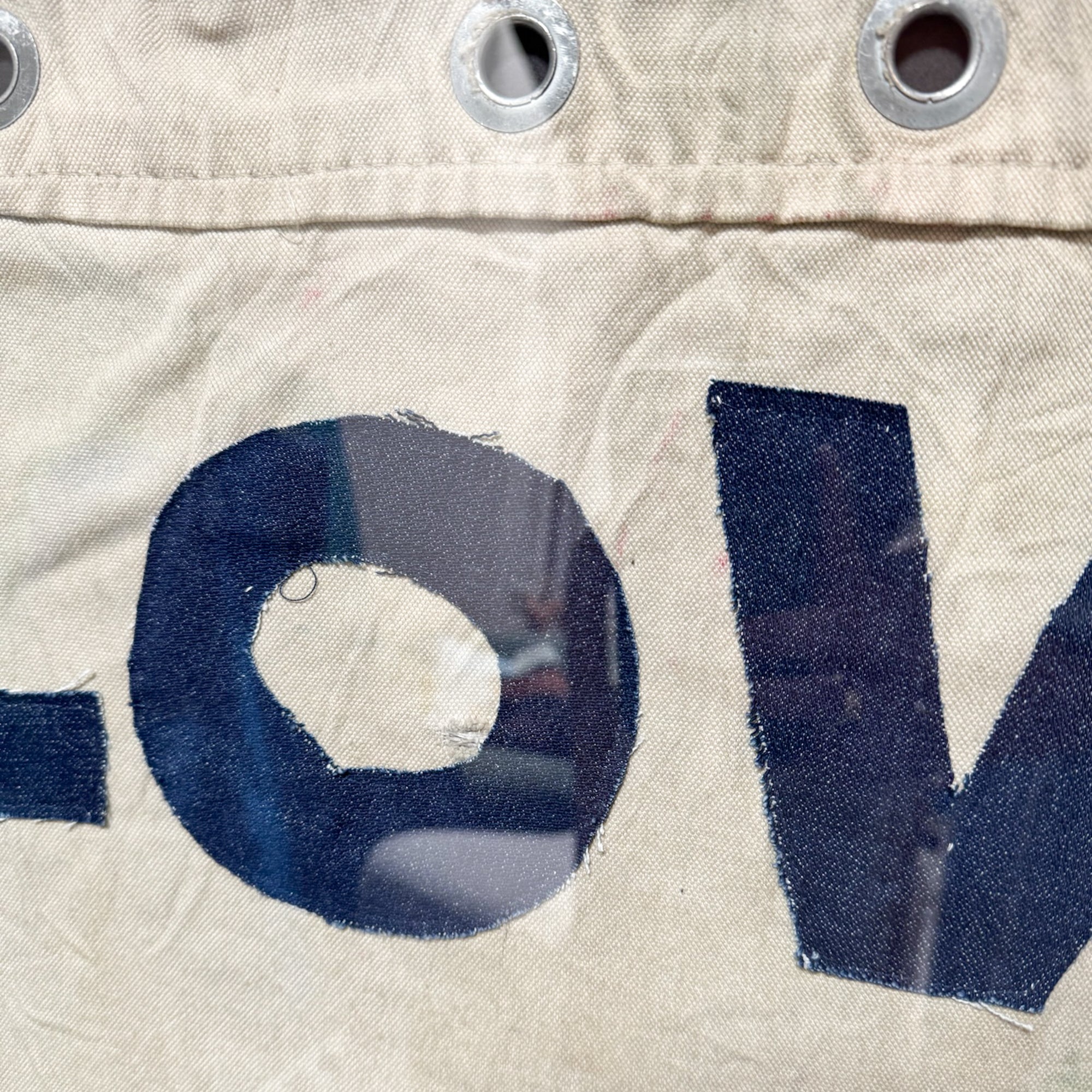 Austin-based artist Laurie Sobocinski has always loved fabrics and thrifting, and she brings that passion into her work by using as many upcycled textiles as possible. From wool suits to denim and corduroy jeans, she is always searching for new materials to repurpose. The canvas for her current pieces once served as US mailbags — carriers of countless letters in their past life. Today, they carry bold word art that expresses fun and meaningful phrases.