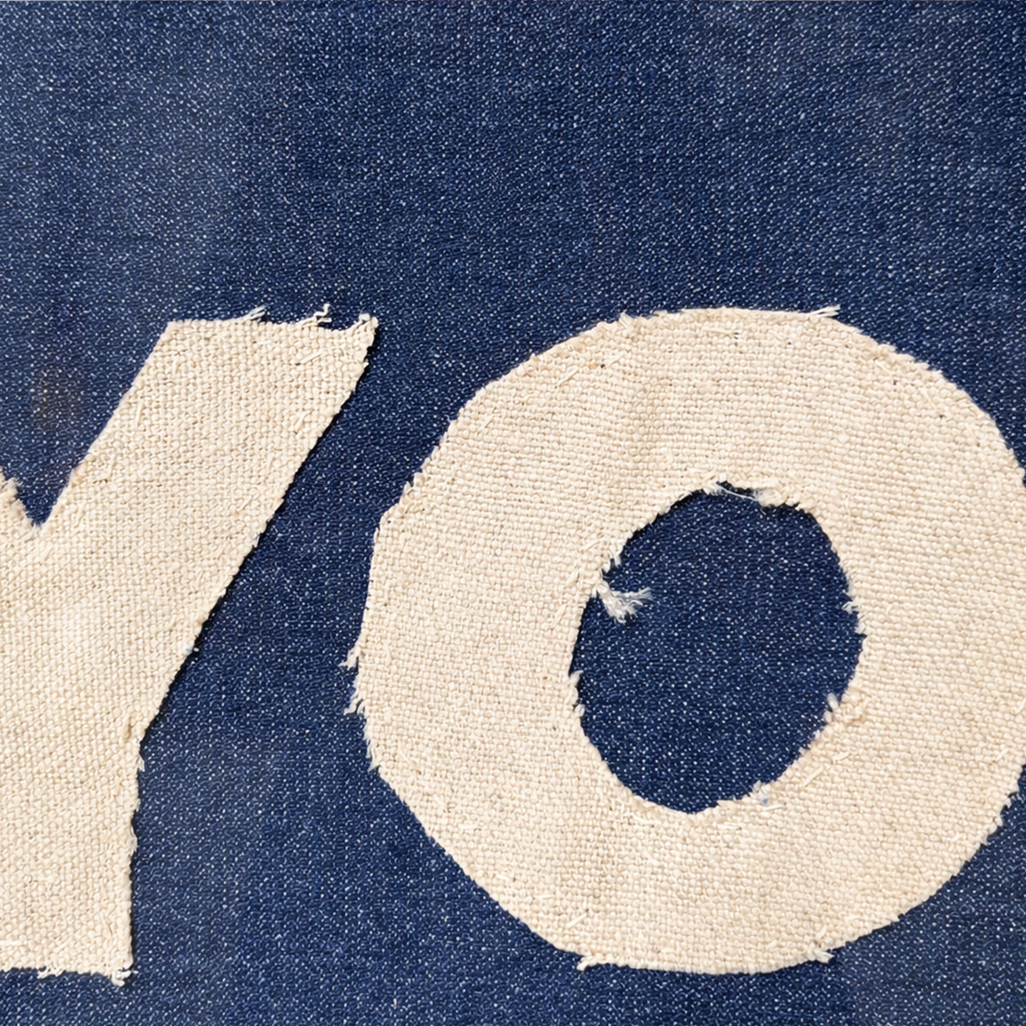 Austin-based artist Laurie Sobocinski has always loved fabrics and thrifting, and she brings that passion into her work by using as many upcycled textiles as possible. From wool suits to denim and corduroy jeans, she is always searching for new materials to repurpose. The canvas for her current pieces once served as US mailbags — carriers of countless letters in their past life. Today, they carry bold word art that expresses fun and meaningful phrases.