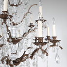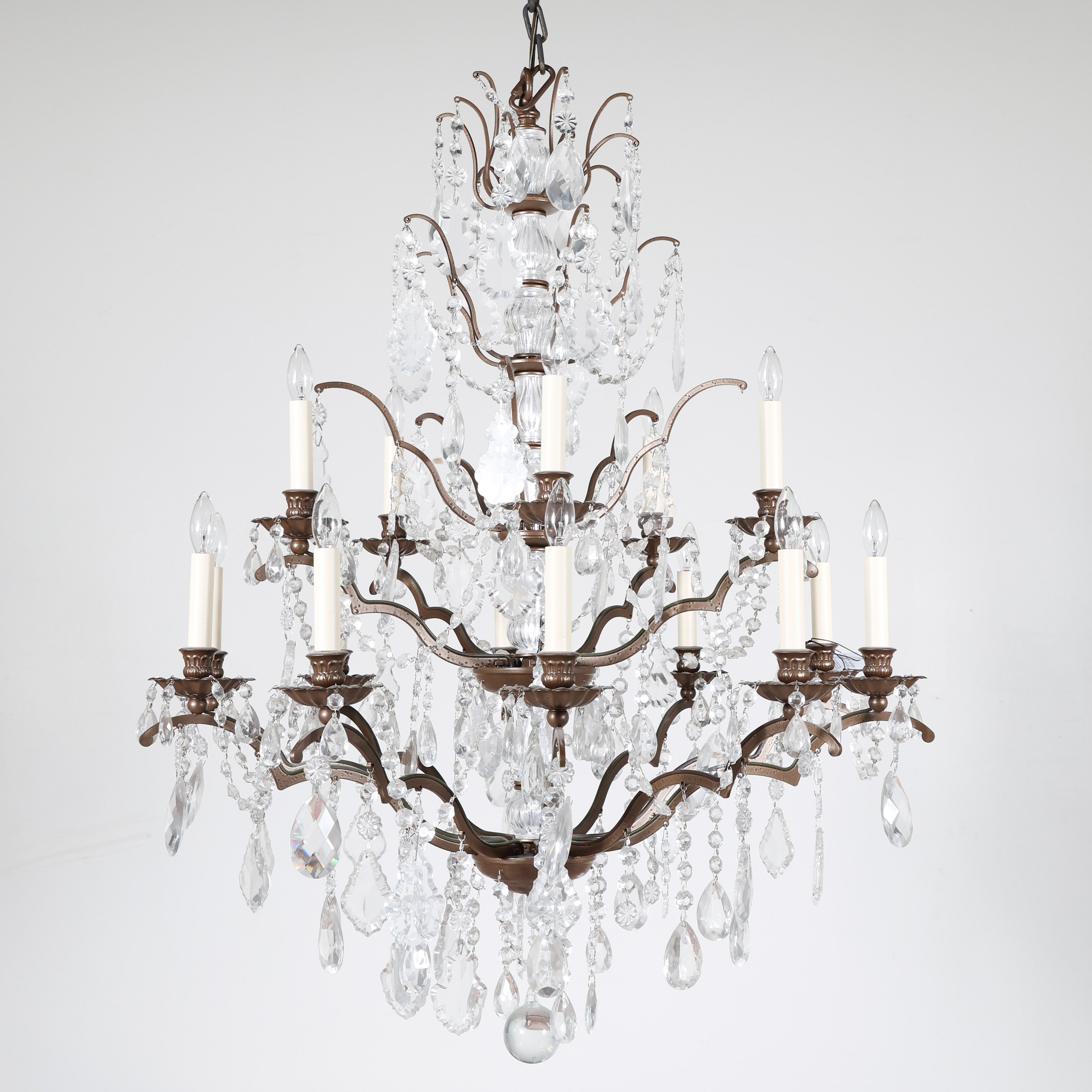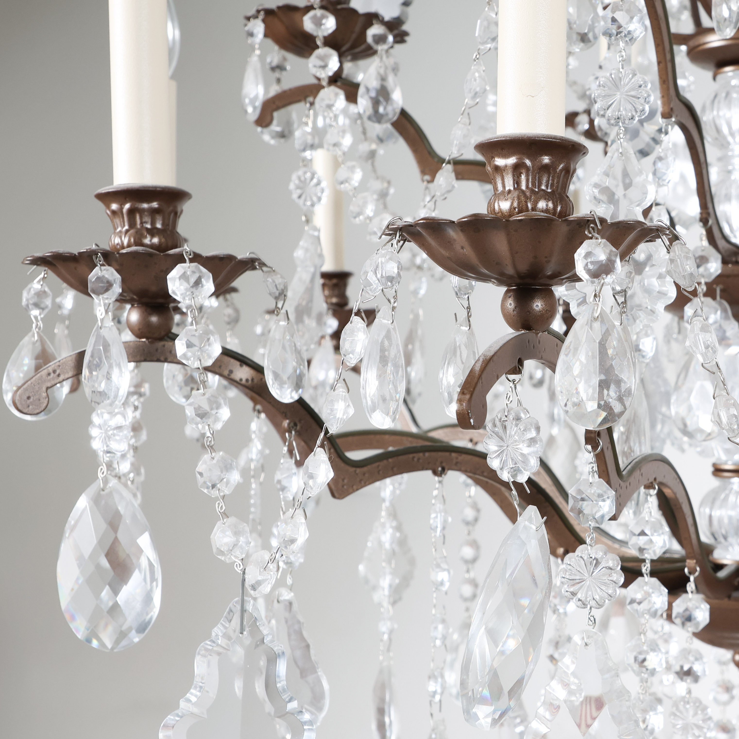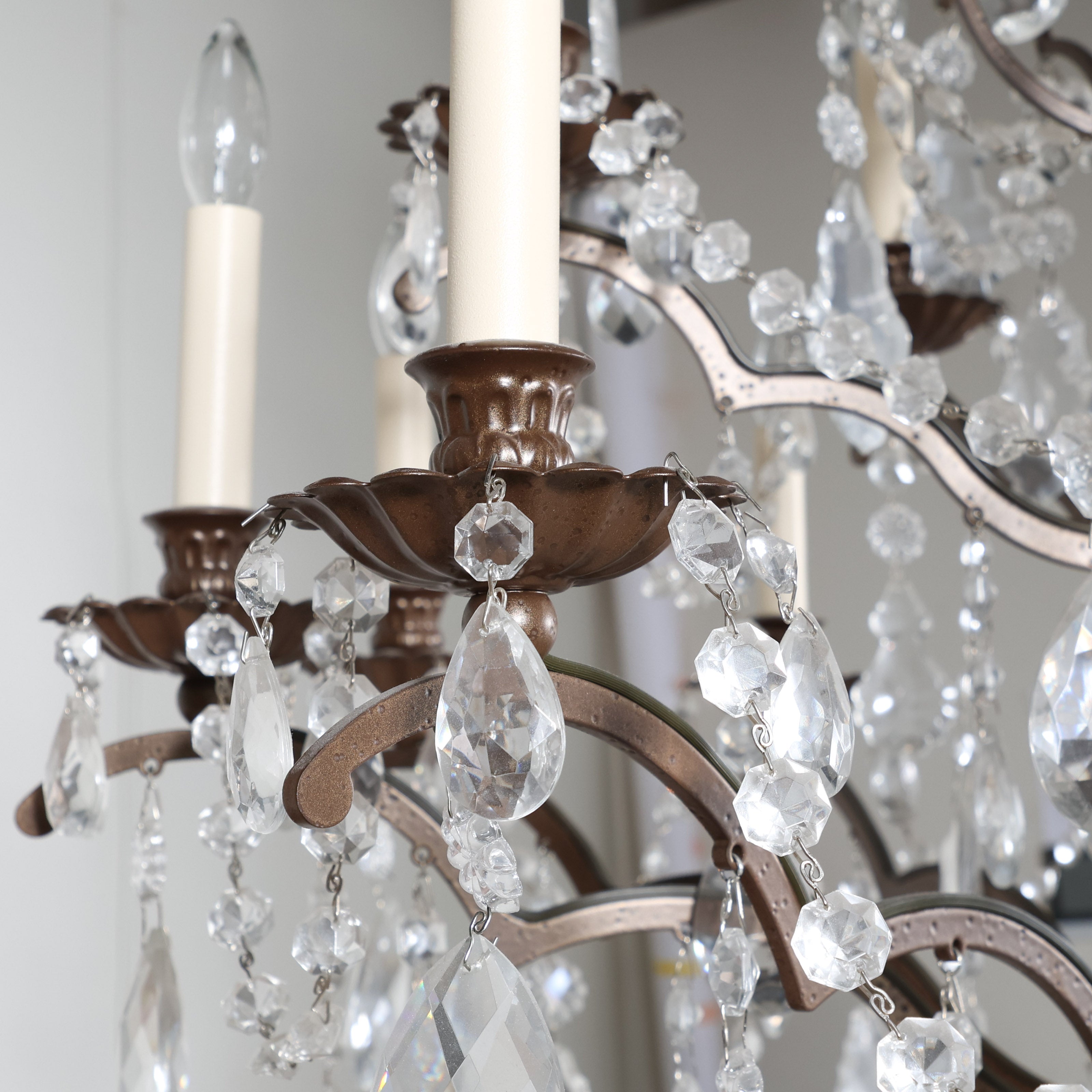 This elegant iron and crystal chandelier has a classic round silhouette and beautifully layered presence. Gently scrolling iron arms support candle-style lights, each dressed with cascading crystal drops and faceted prisms that catch and scatter light from every angle.