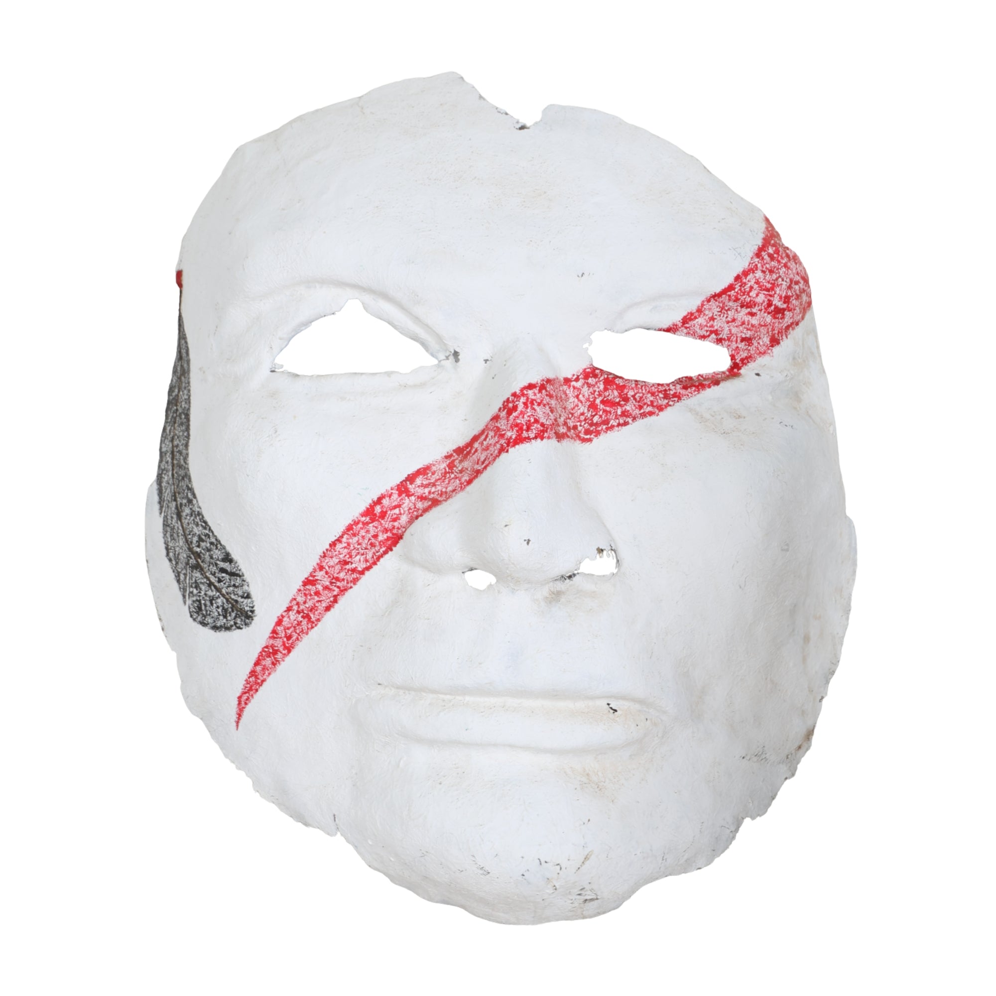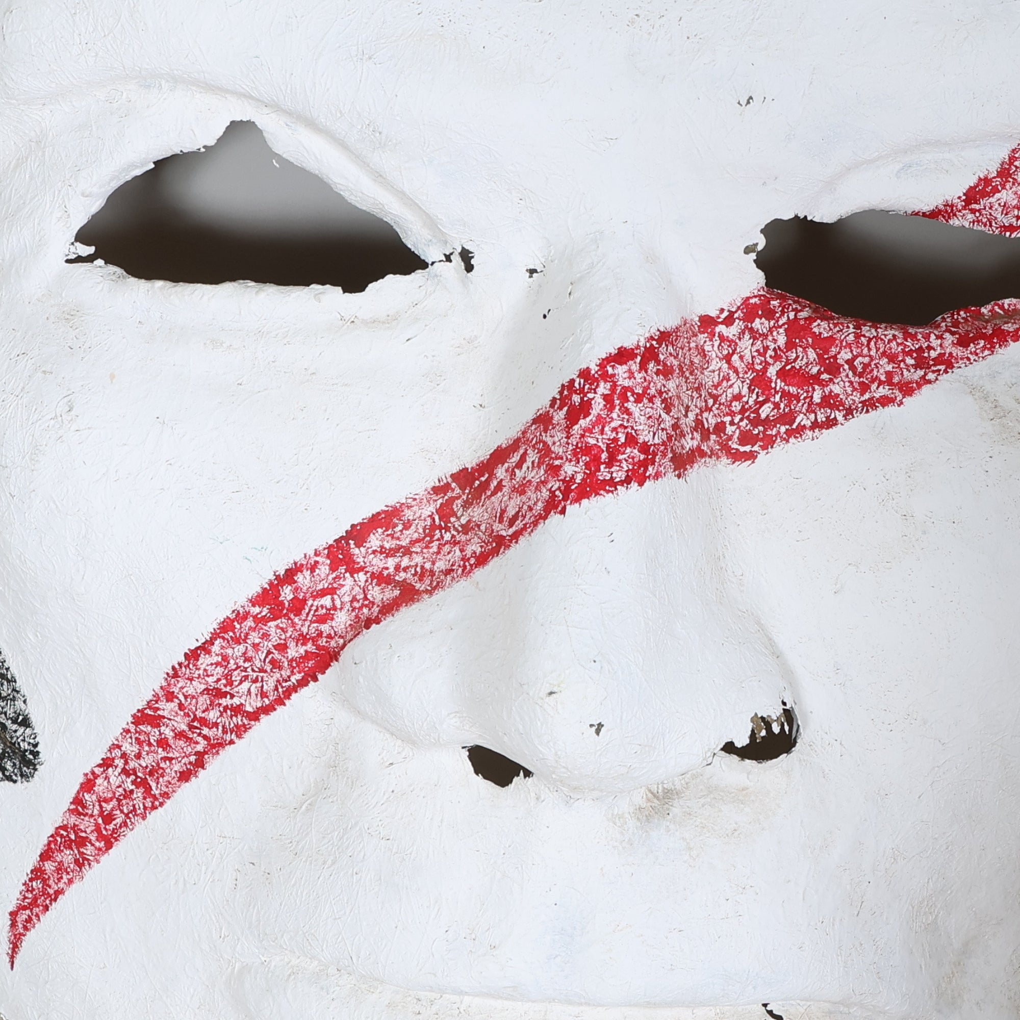 A striking oversized fiberglass mask featuring a stark white surface slashed with a bold red diagonal stripe. The sculptural face has a subtly expressive form and hand-textured finish, giving it a raw, theatrical presence.