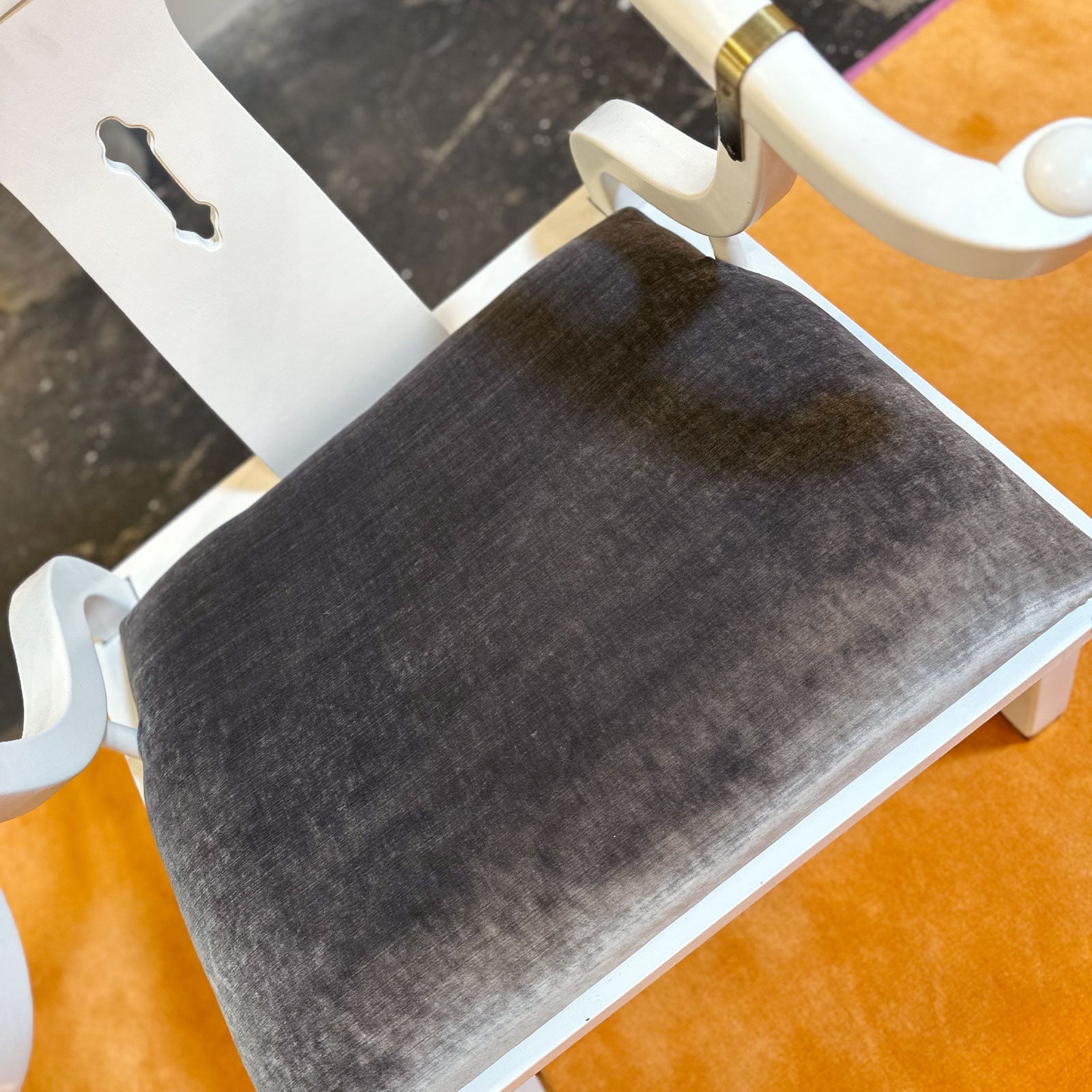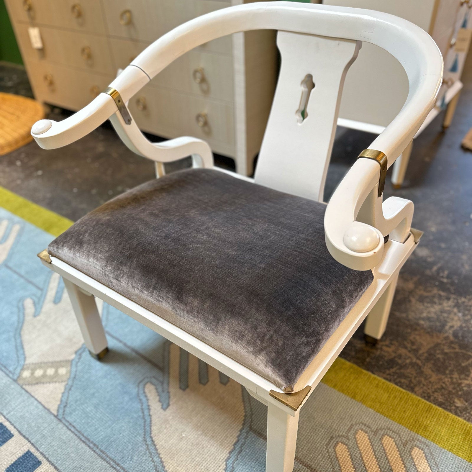 This pair of vintage armchairs features a more recently updated white lacquer frame with elegant curved arms and subtle brass accents. The seats were upholstered in a soft, moody gray velvet that adds depth and a modern edge to their timeless form. The pierced splat back and sculptural lines give them that collected, layered look we love.