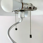 These post-modern table lamps bring playful geometry and polished restraint together in one very good-looking pair. Each lamp features a sculptural, serpentine metal stem anchored by a glossy black spherical base and topped with a crisp, conical metal shade.
