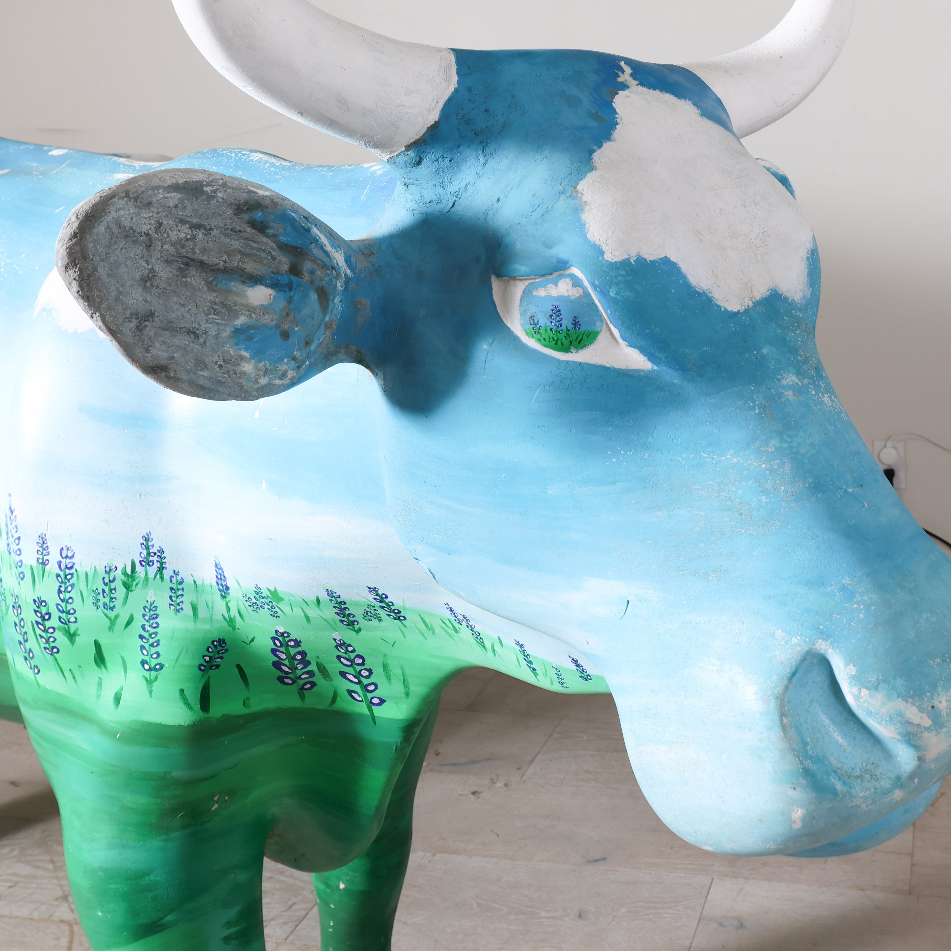 This life-size cow sculpture is hand-painted with a sweeping Texas landscape—bright blue sky, rolling green fields, and a blanket of bluebonnets stretching across her body. It was scouted in Round Top and is artist-signed and dated 8/6/2001, with the added distinction of being signed by George W. Bush and Laura Bush.