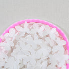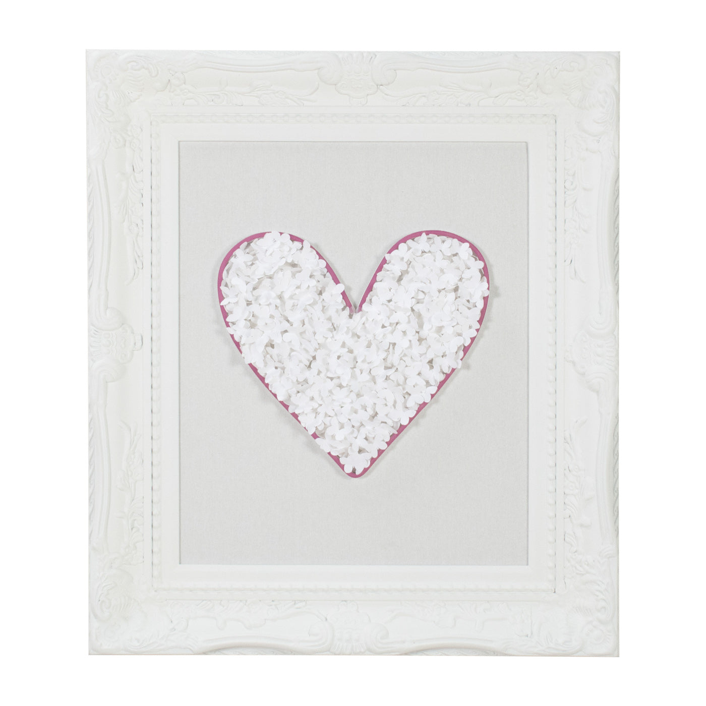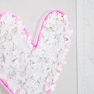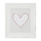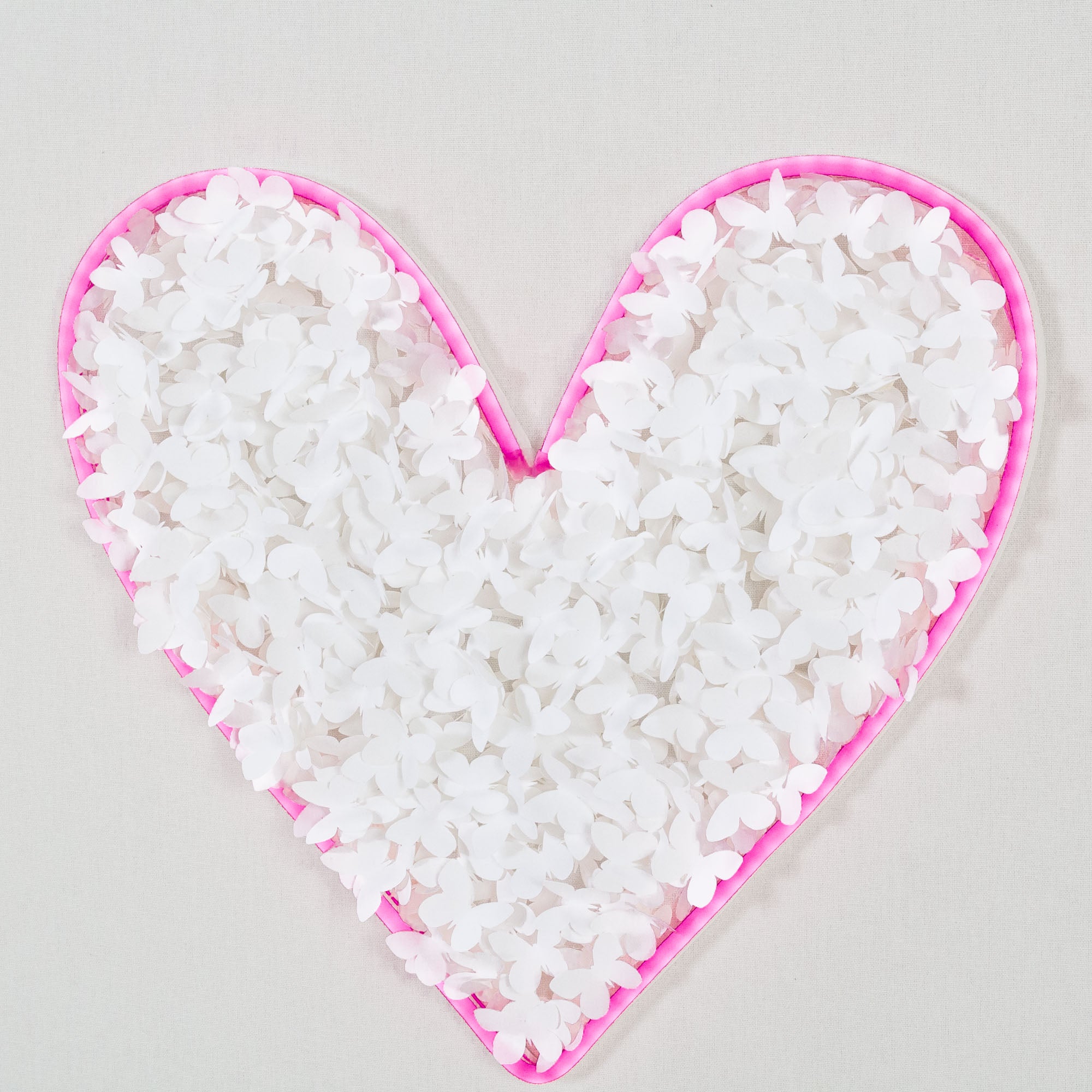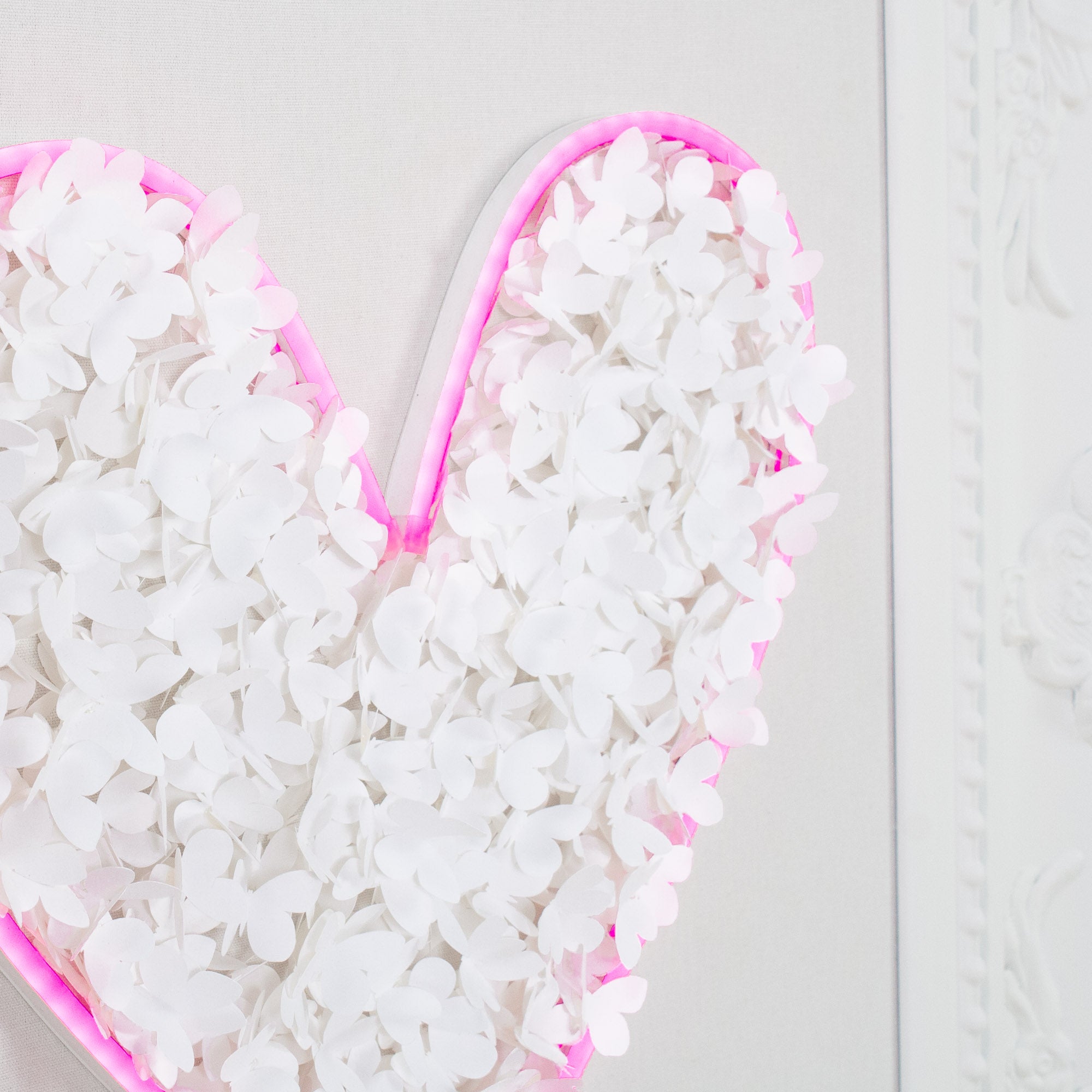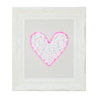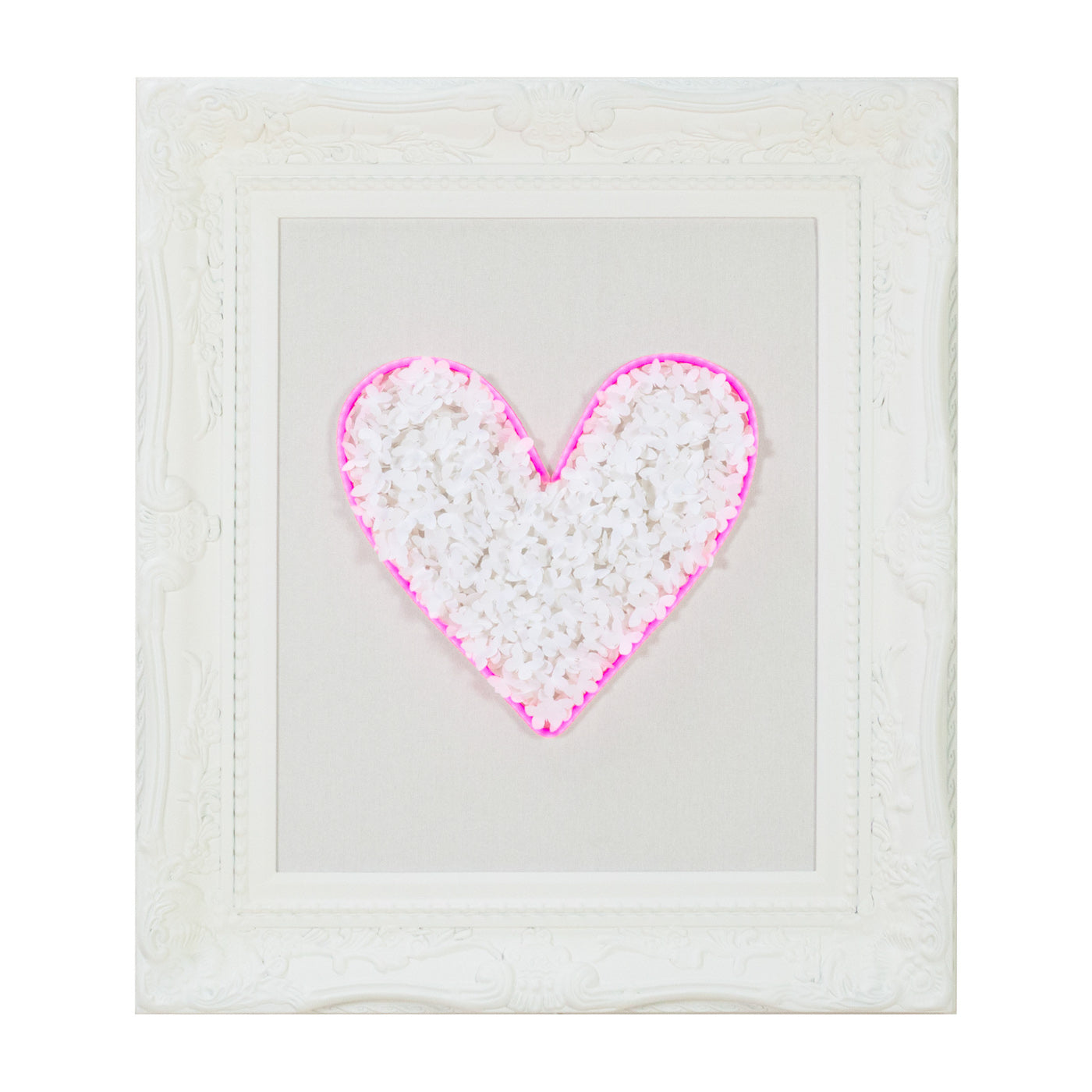 From the Tat Frederick studio, Lite Up Lois is comprised of a neon pink heart filled with white hand-cut butterflies fixed to canvas and framed in white with a black cord.