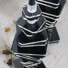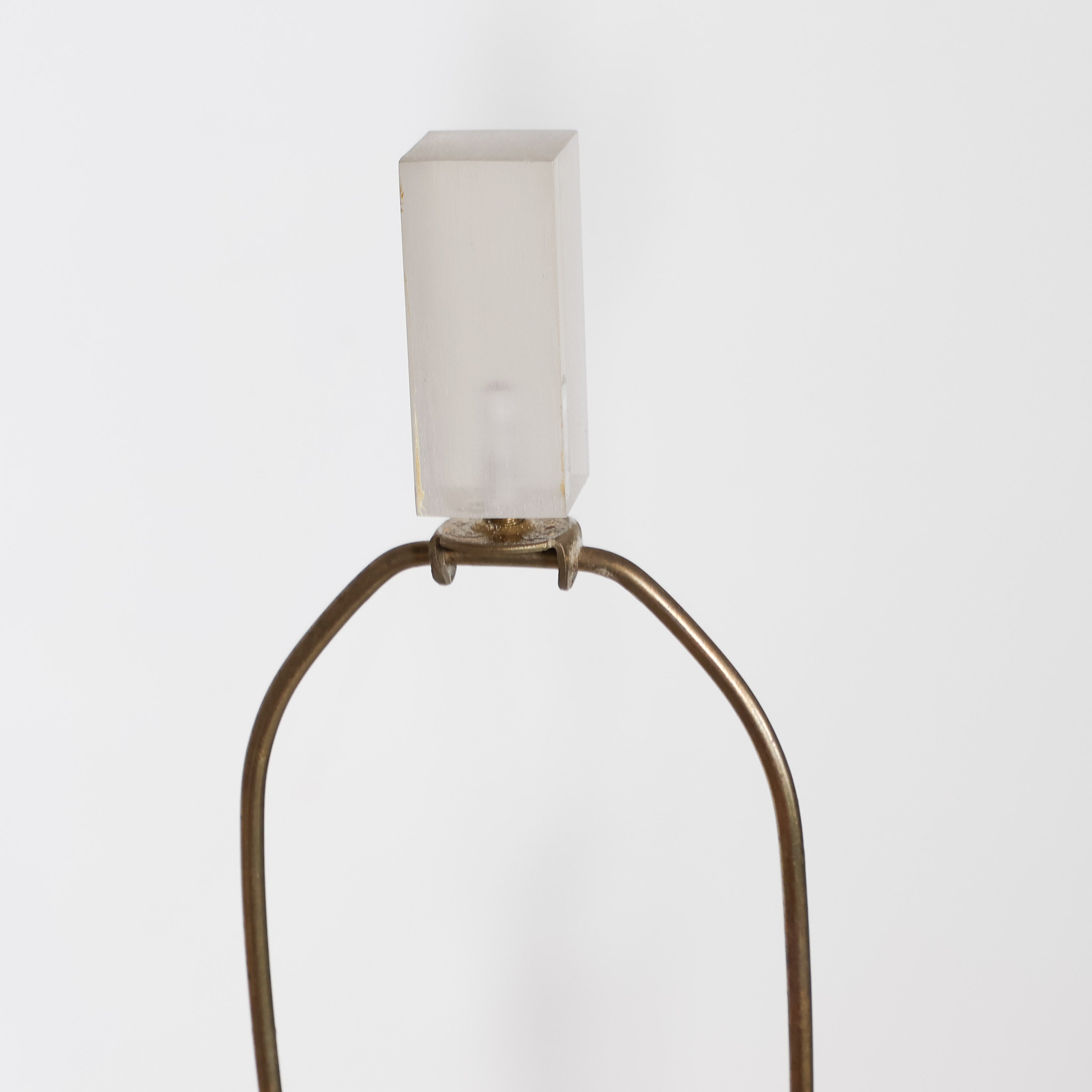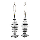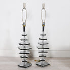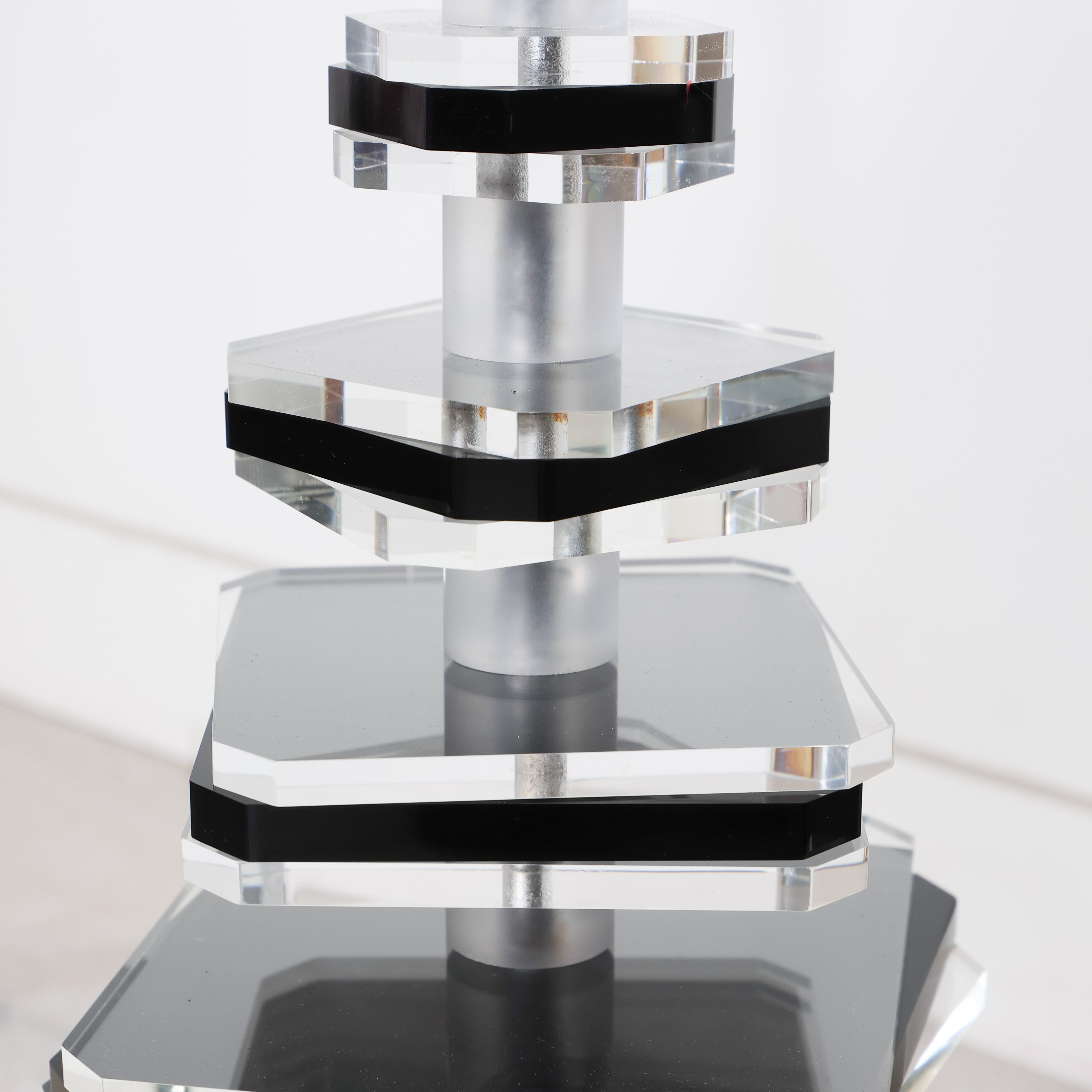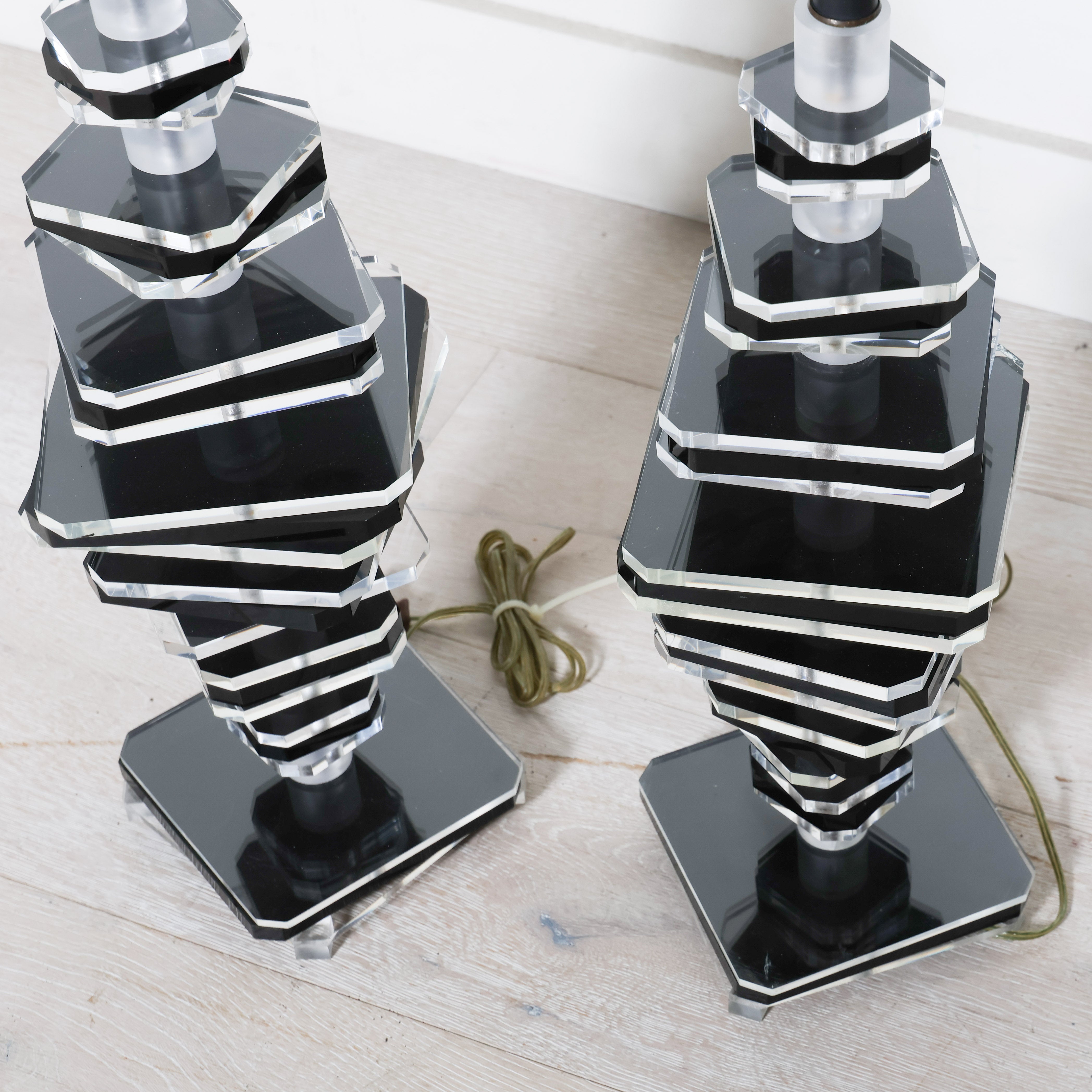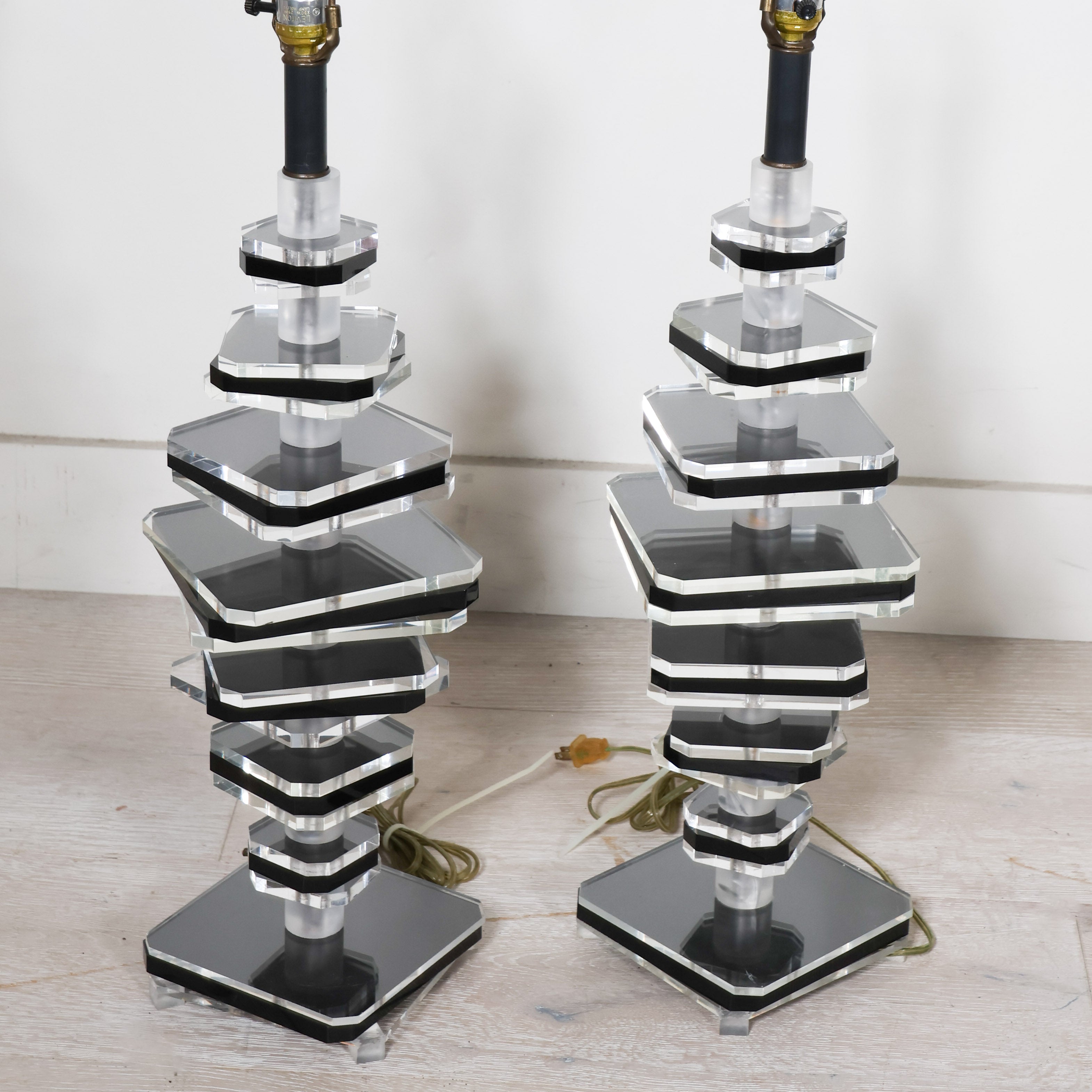 This impressive pair of tuxedo table lamps features clear lucite slabs sandwiched between layers of black lucite. The individual blocks can be rotated to create different looks.