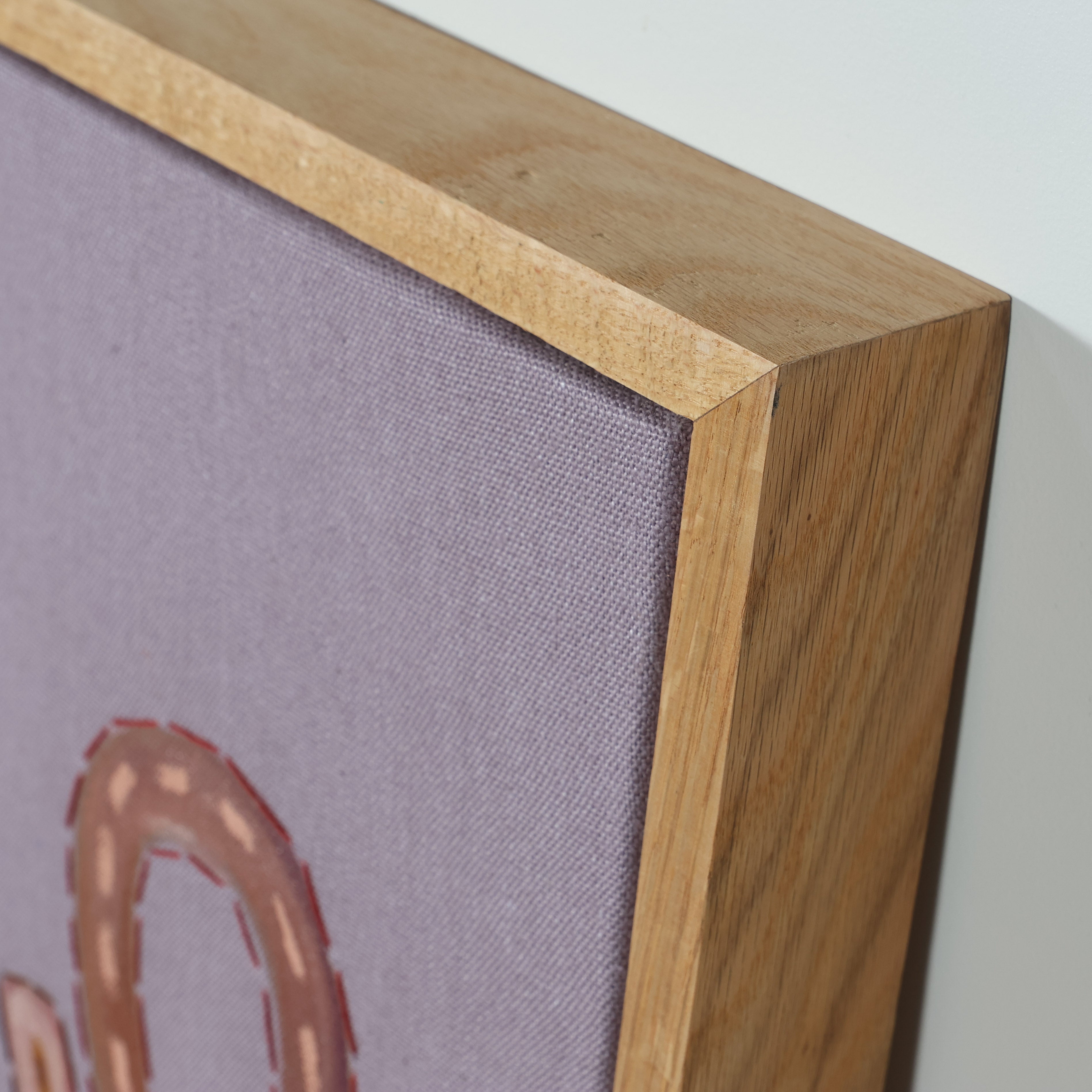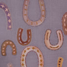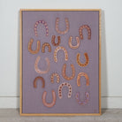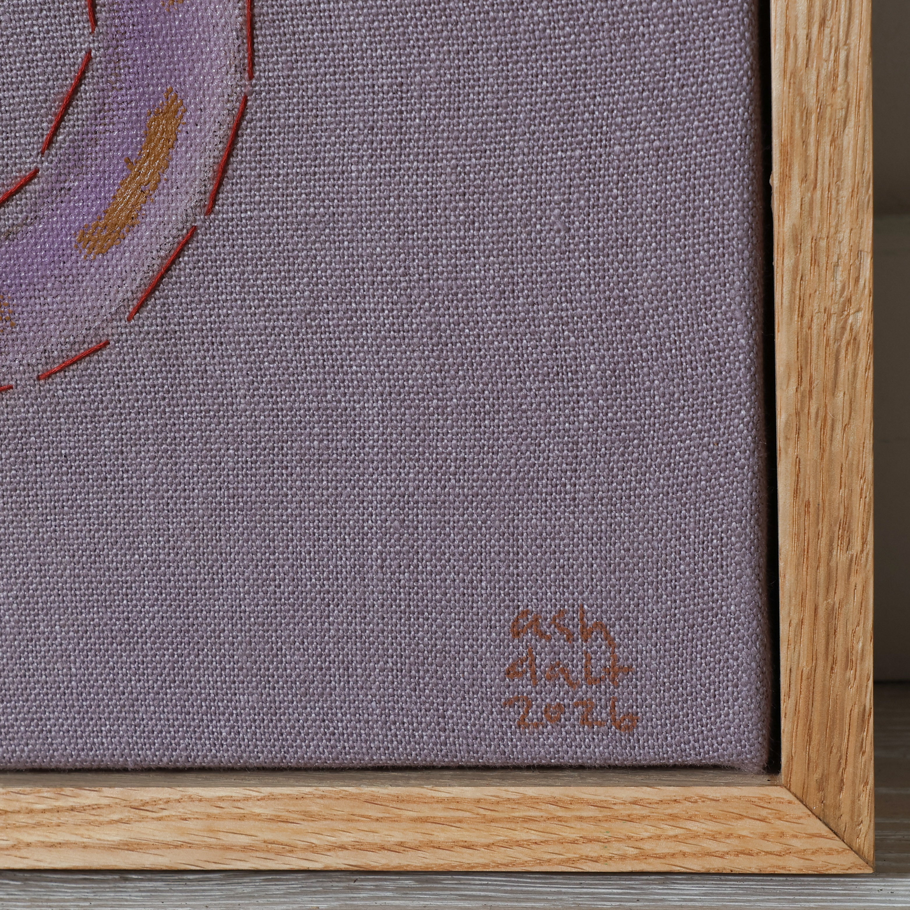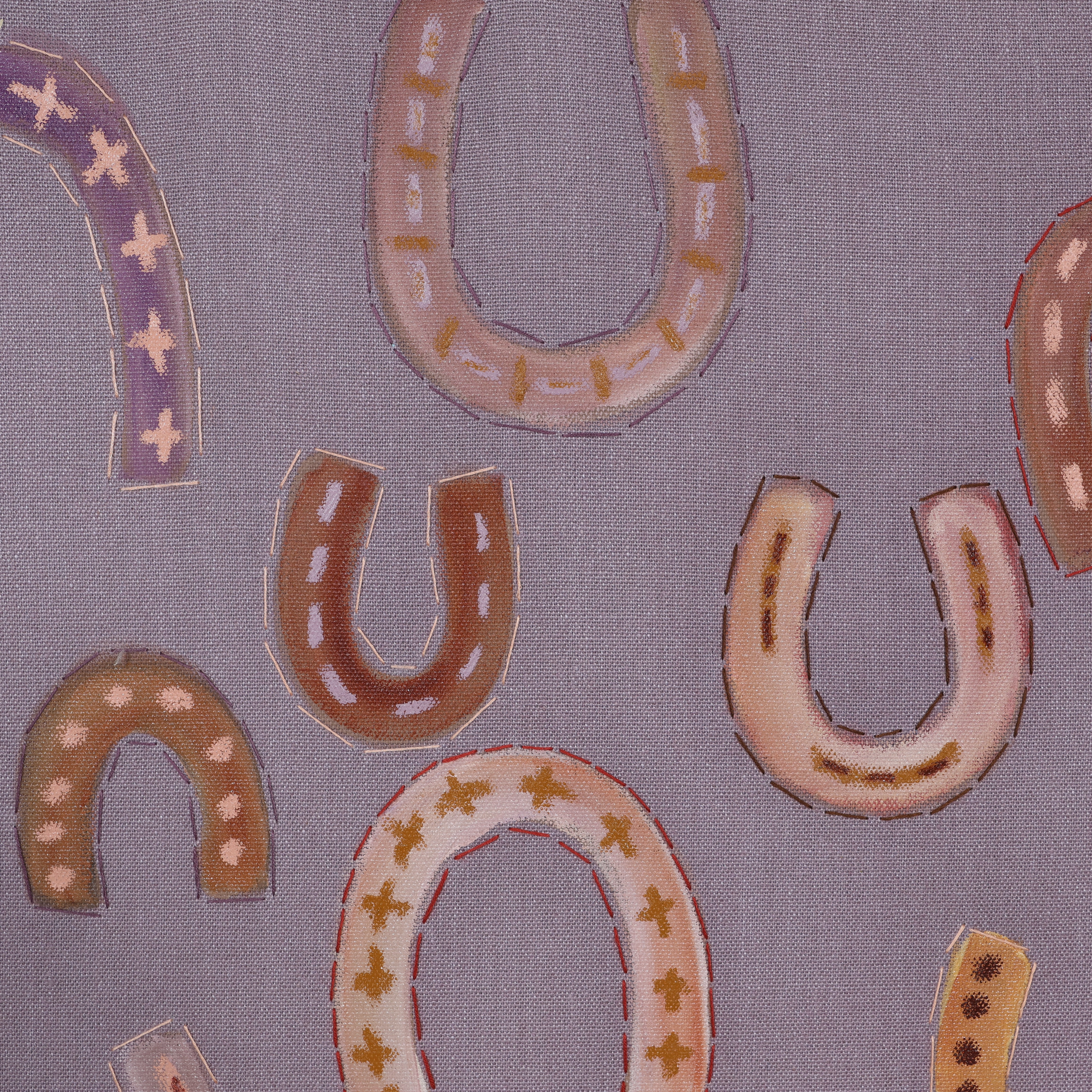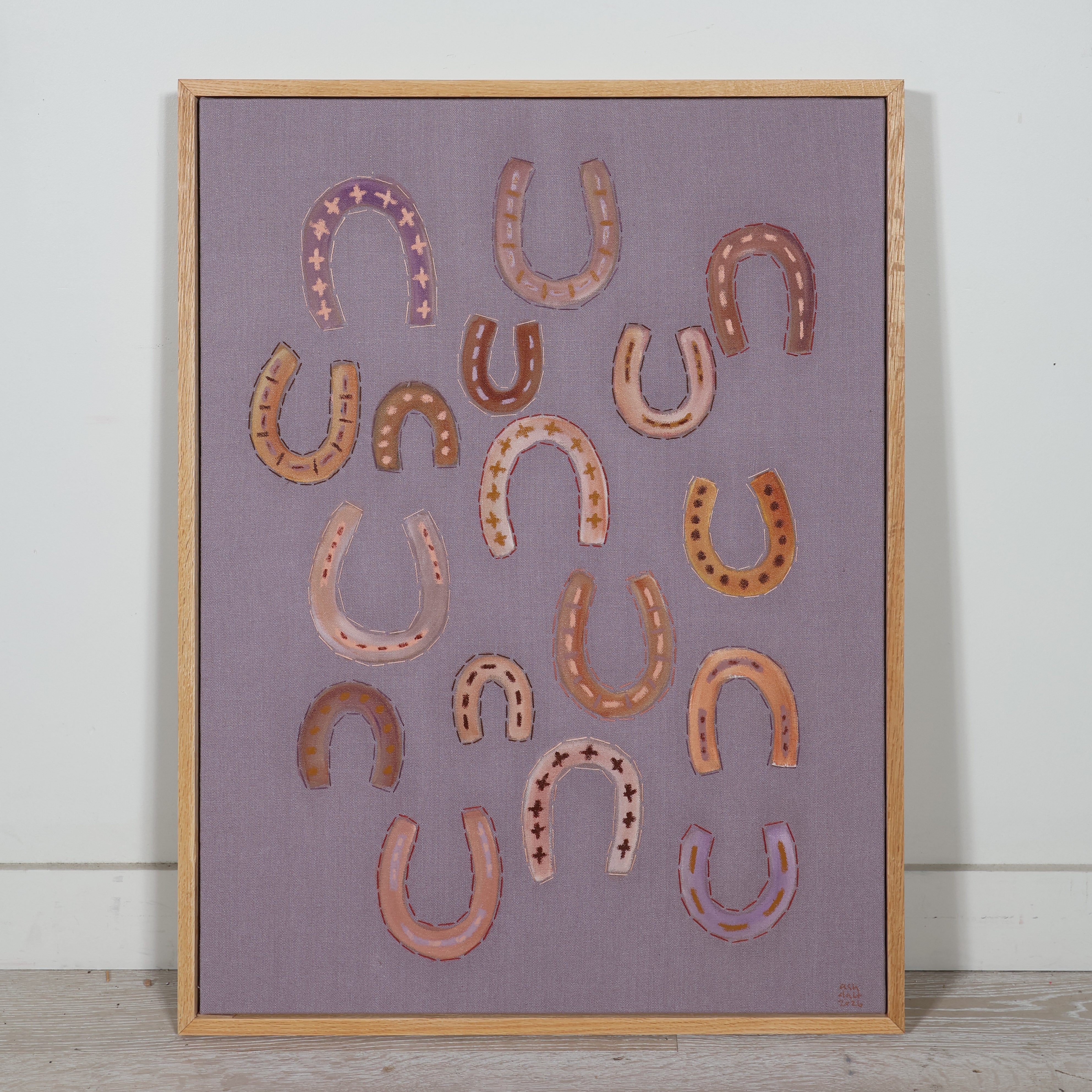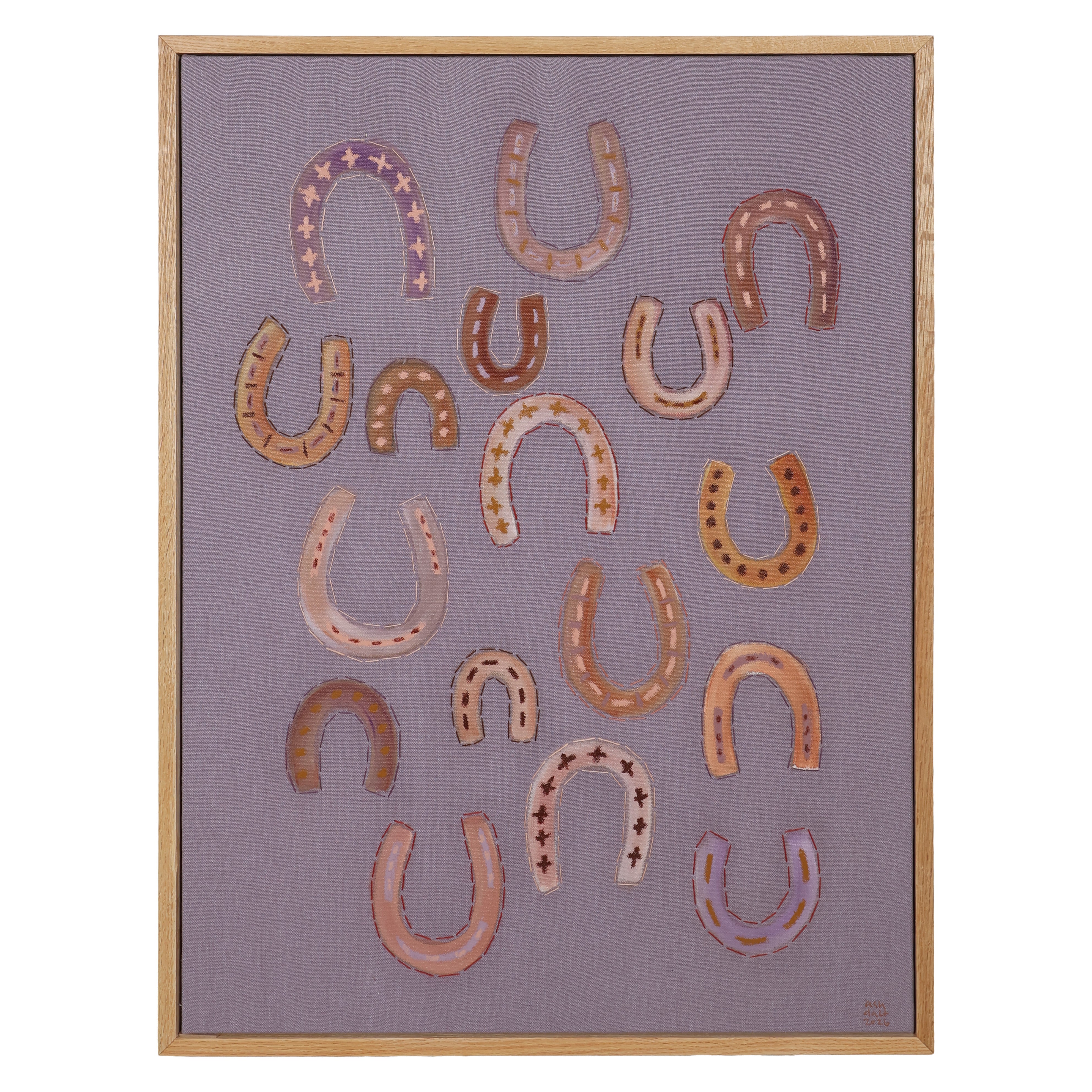 This original work by Ashley Dalton leans into an old superstition. Traditionally, a horseshoe hung upright is said to hold luck in, keeping it safe and close. Turn it downward, and that luck is meant to pour out, shared generously with anyone who passes by. "Lucky You, Lucky Me on Mauve" brings both together in one stunning arrangement, mixing upward and downward horseshoes in oil paint and oil pastel, with hand embroidered thread on linen.
