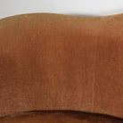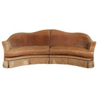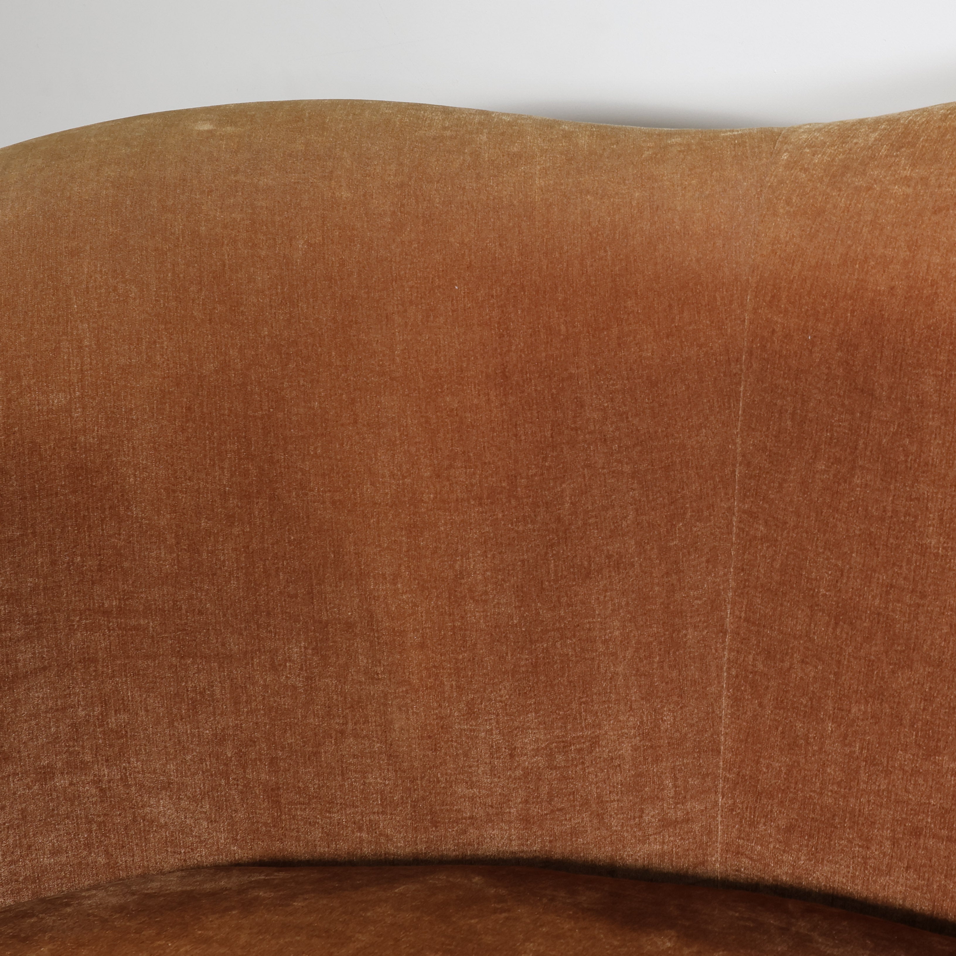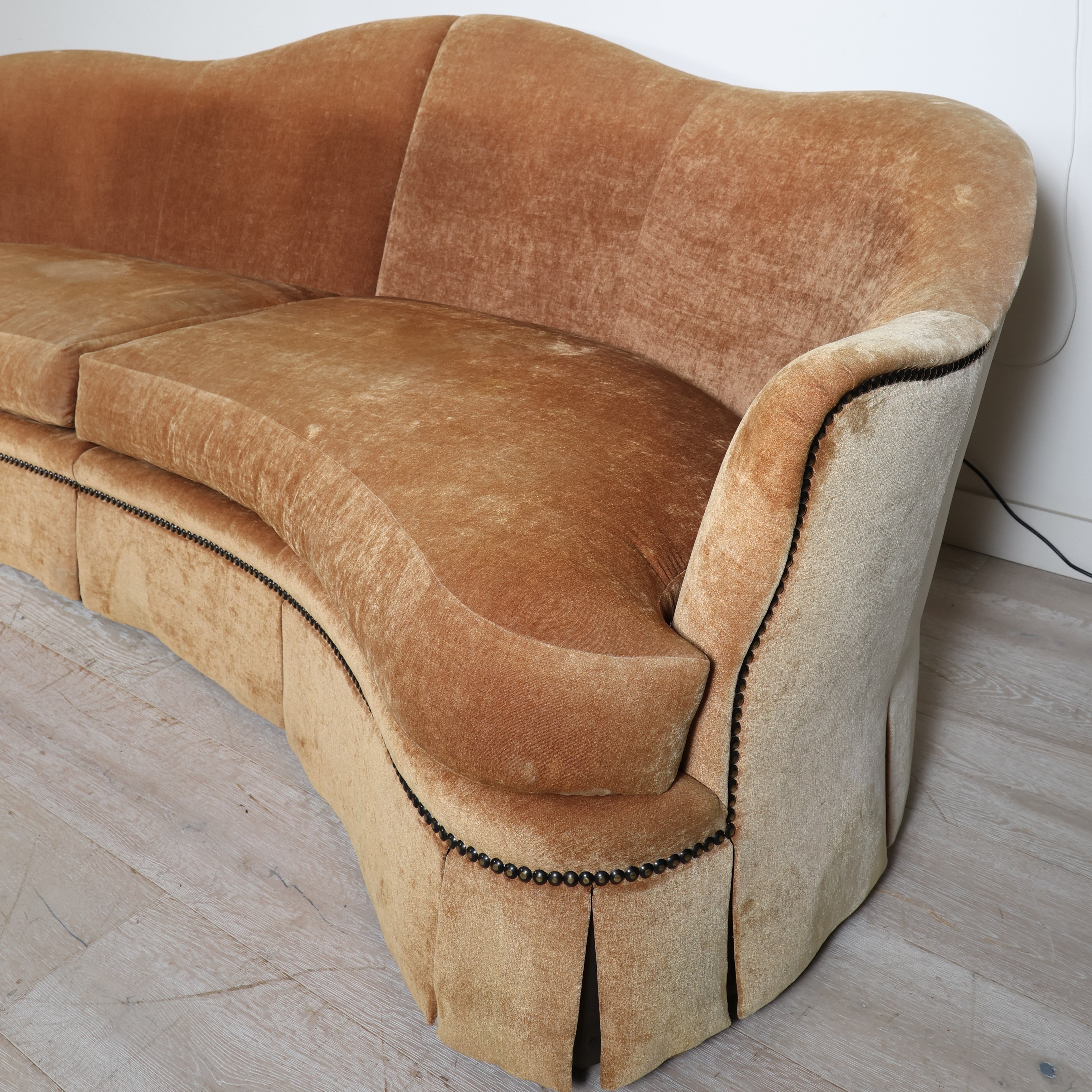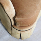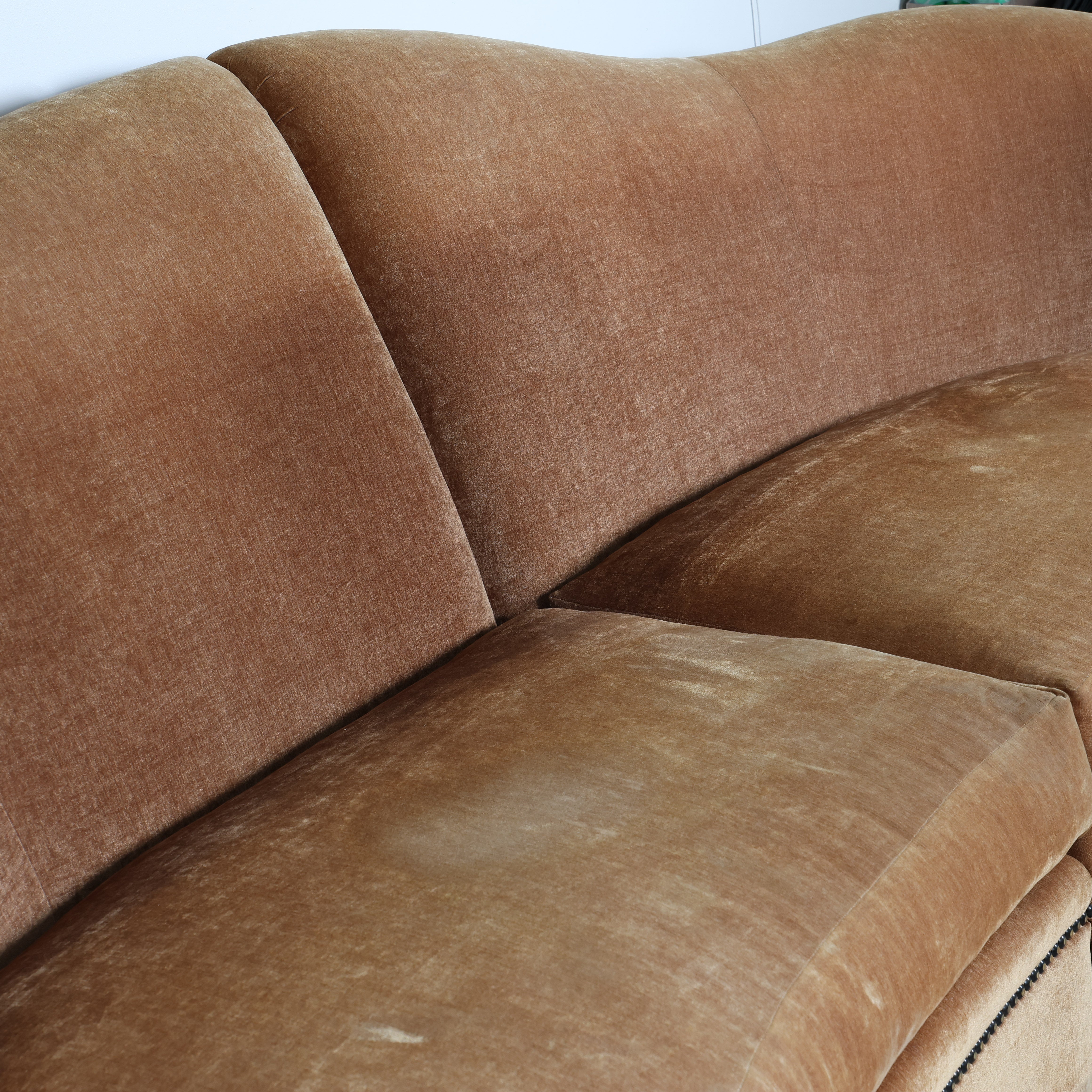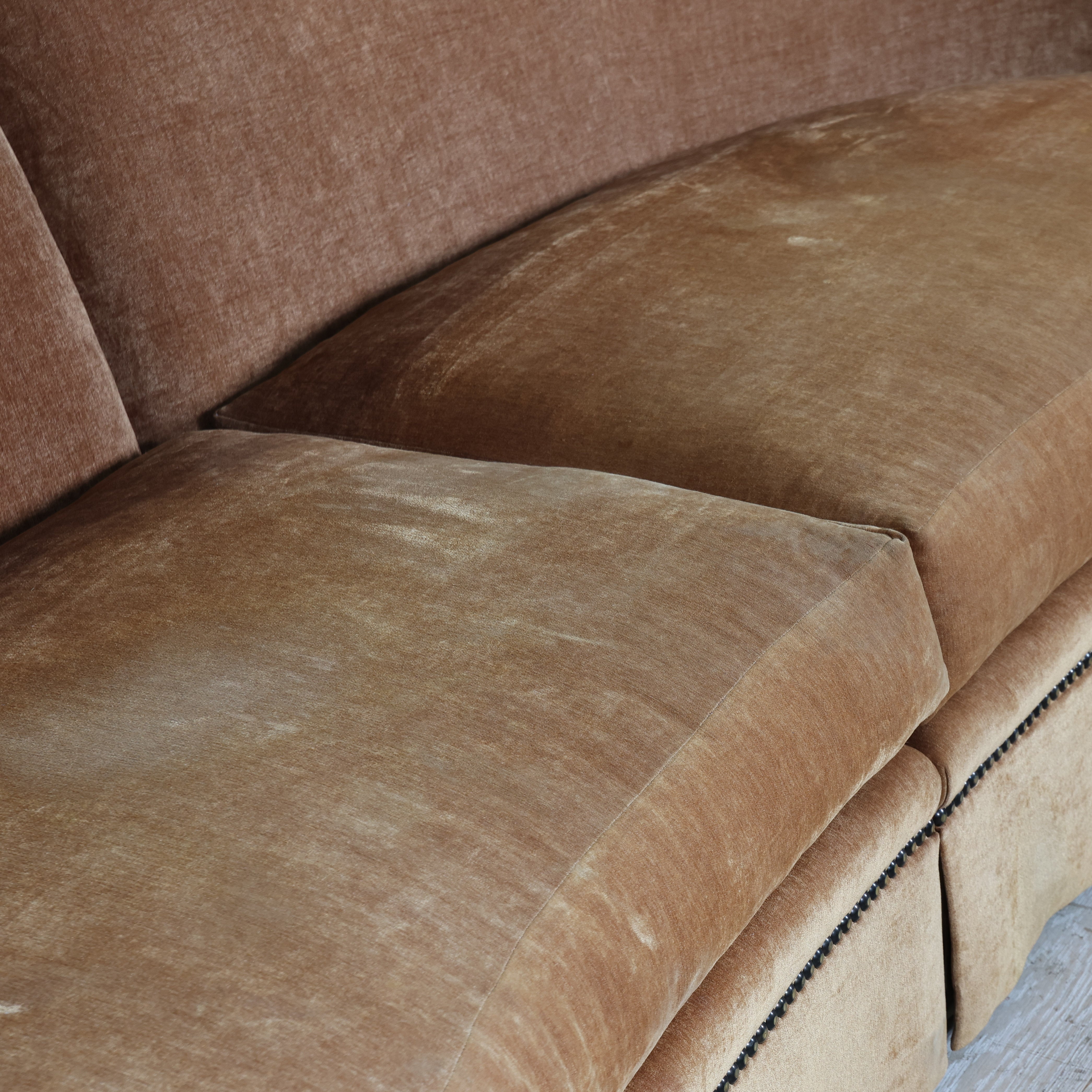 Upholstered in a warm, neutral velvet with a rich patina from age, it offers generous seating and timeless appeal.