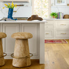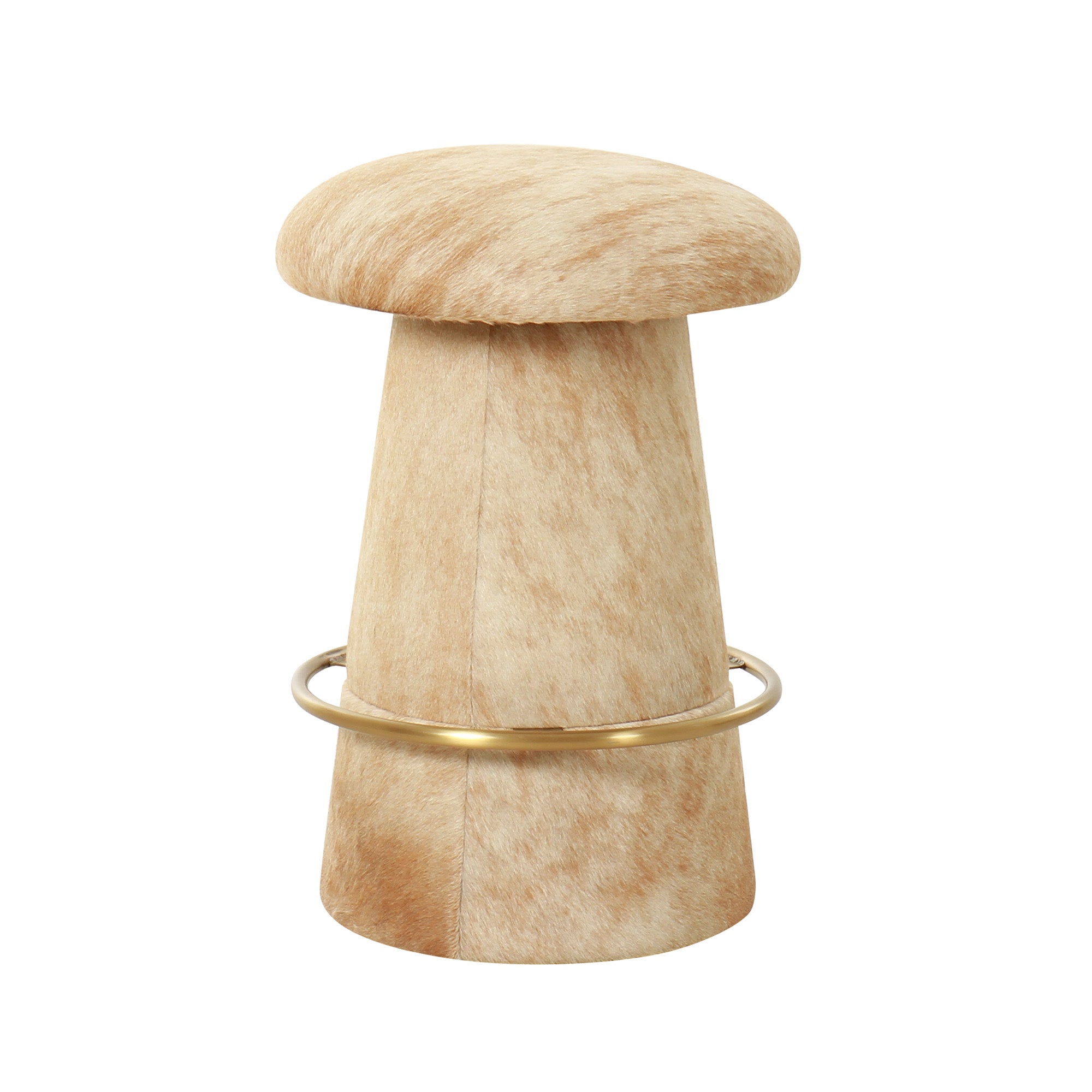 Our Mushroom Counter Stool is ready to energize and elevate your kitchen entertaining. Featuring a simple round seat that spins 360 degrees and contrasting straight lines that make up the base. Beige and ivory leather cowhide upholstery adds subtle warmth and rich visual intrigue to the overall design, while a luxurious circular brass footstool is the perfect perch to keep your feet comfortable.