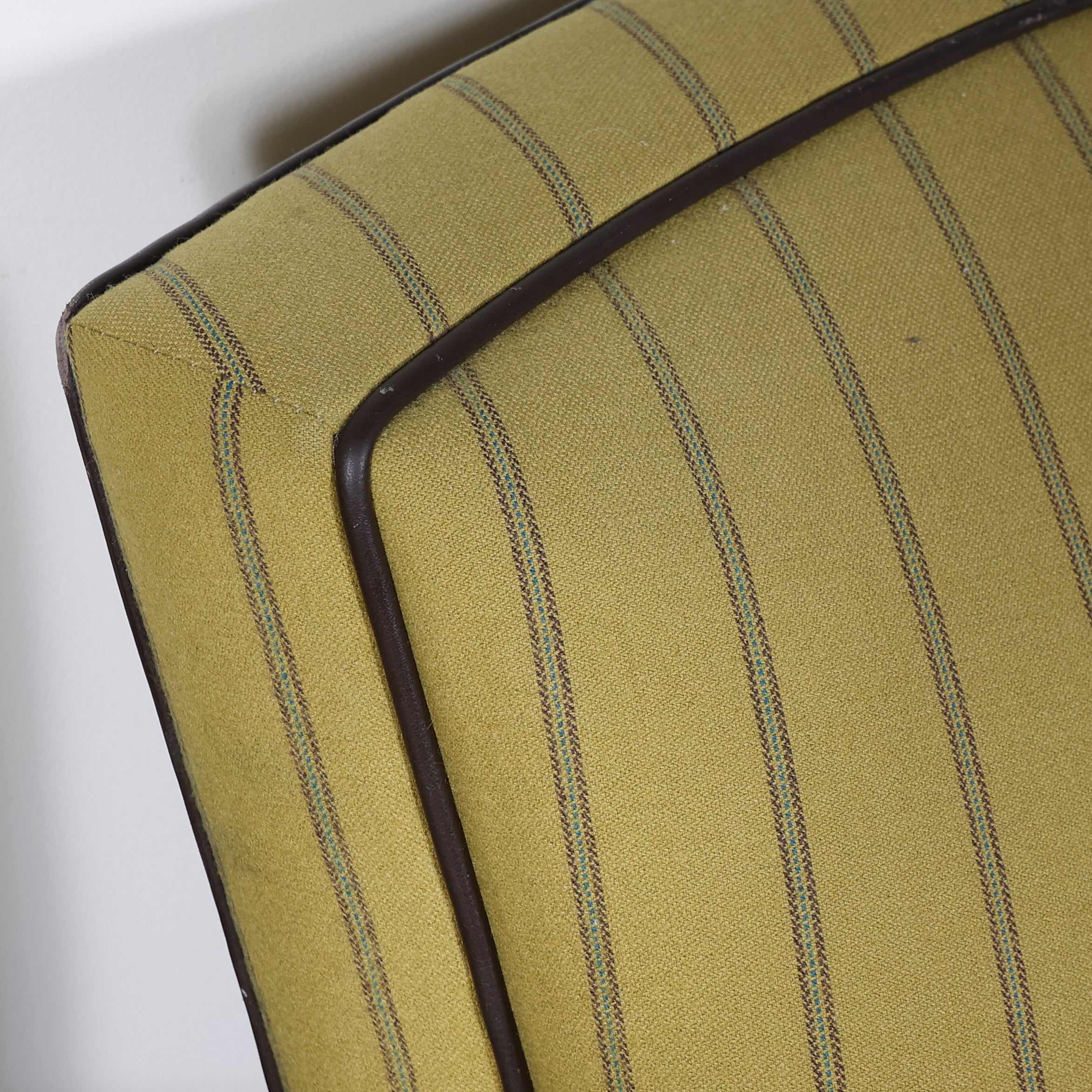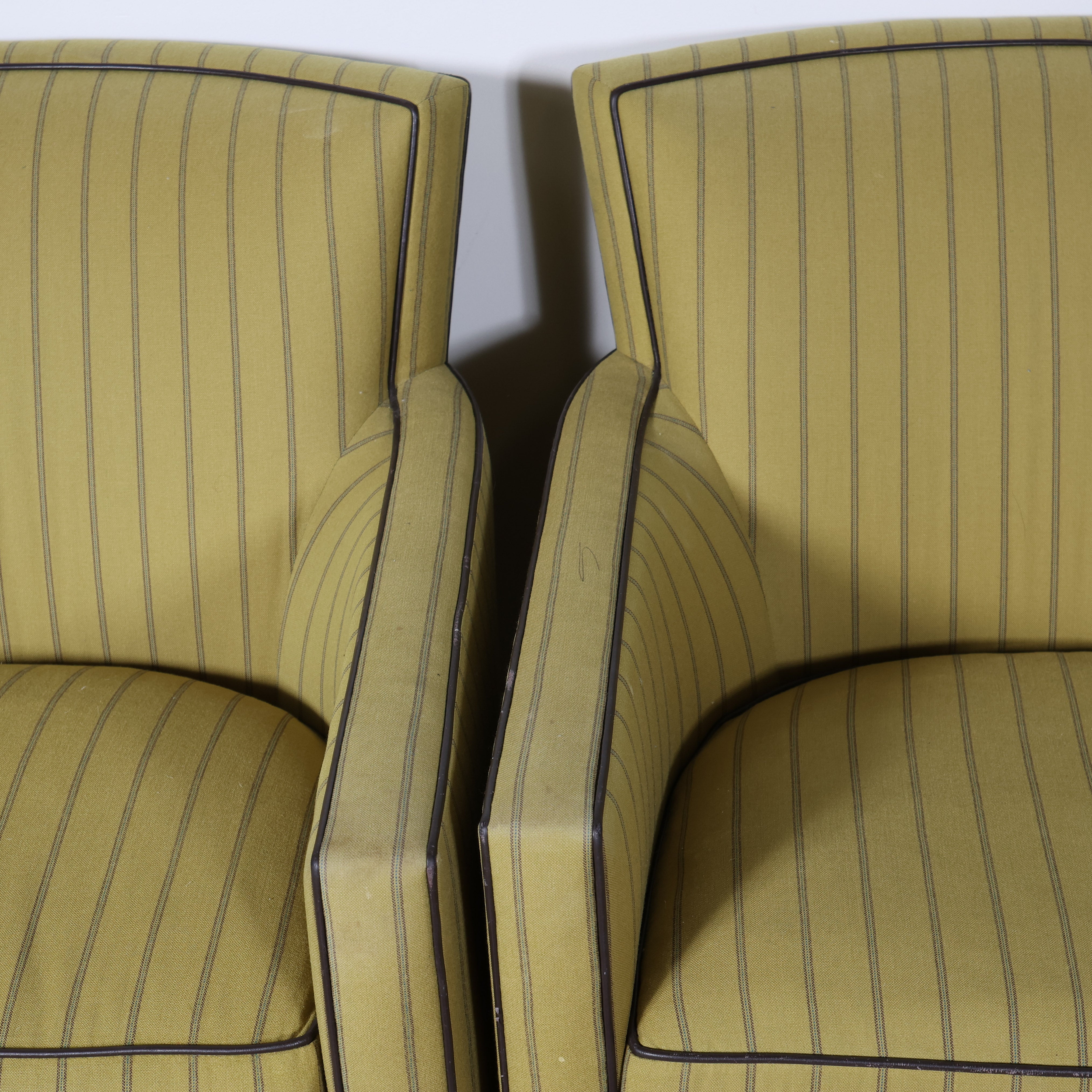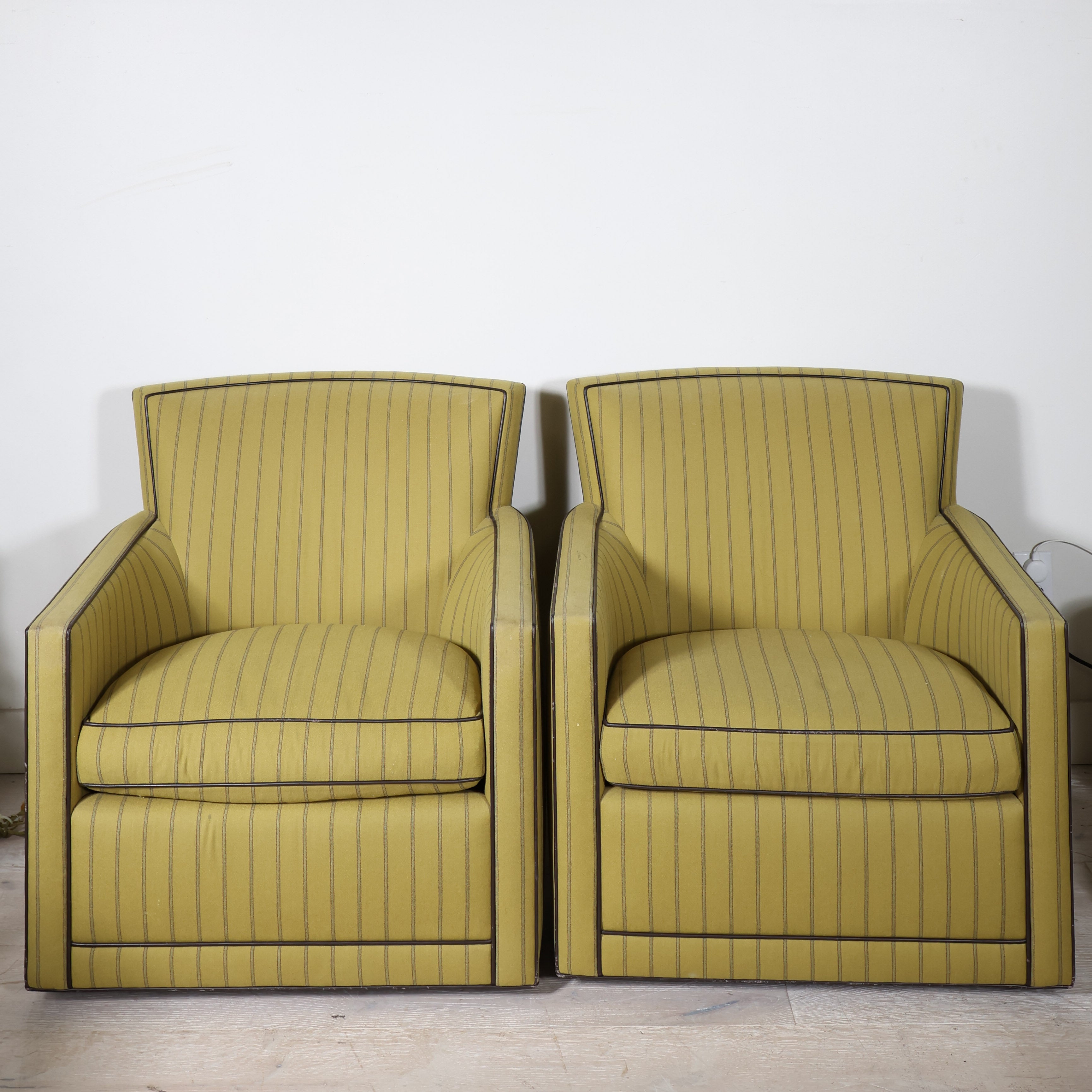 This pair of swivel chairs by A. Rudin features olive-toned striped upholstery accented with leather piping that crisply outlines the arms, cushions, and base. The clean, slightly angled arms and tight back give them a tailored, modern look, while the deep seat cushions keep them comfortable and inviting.