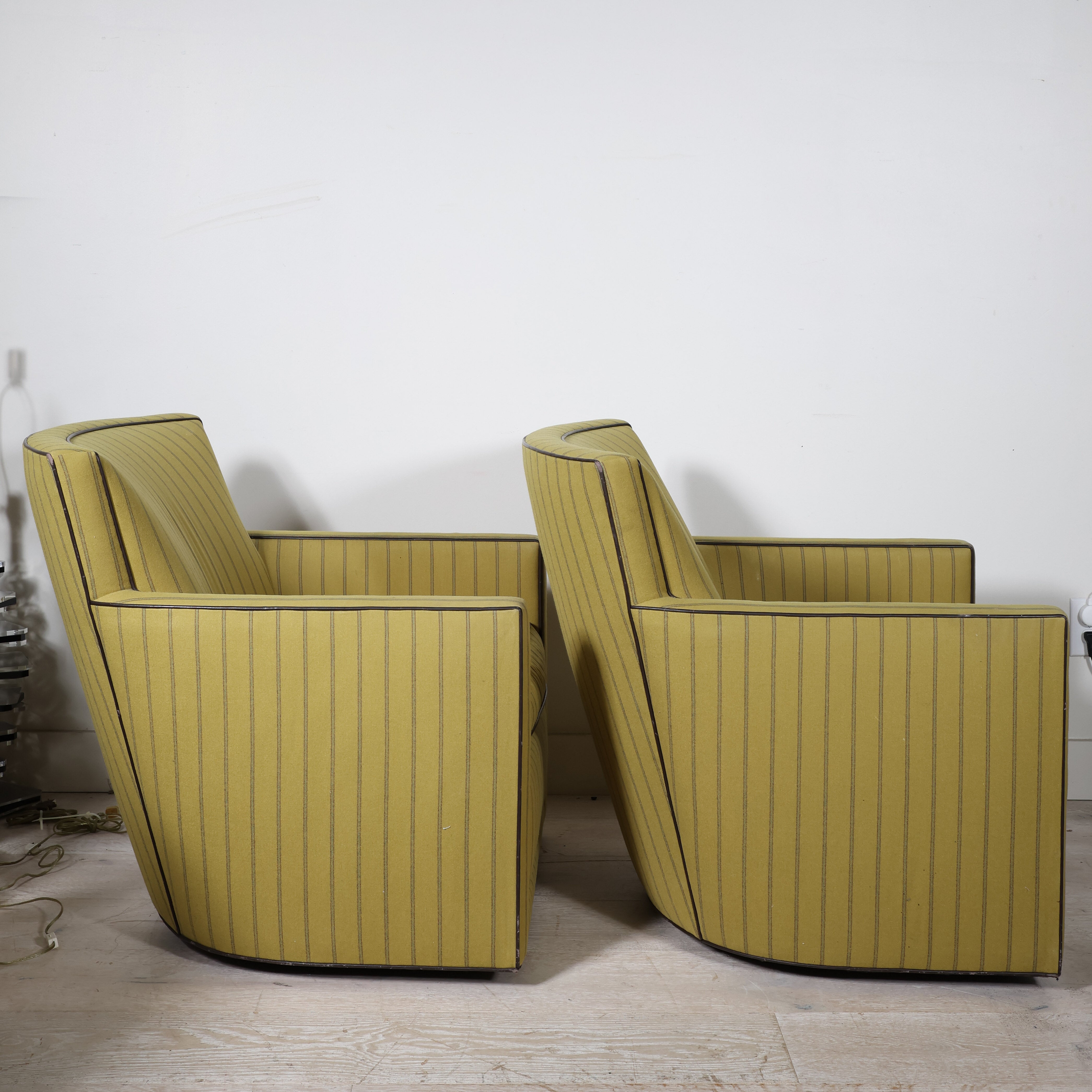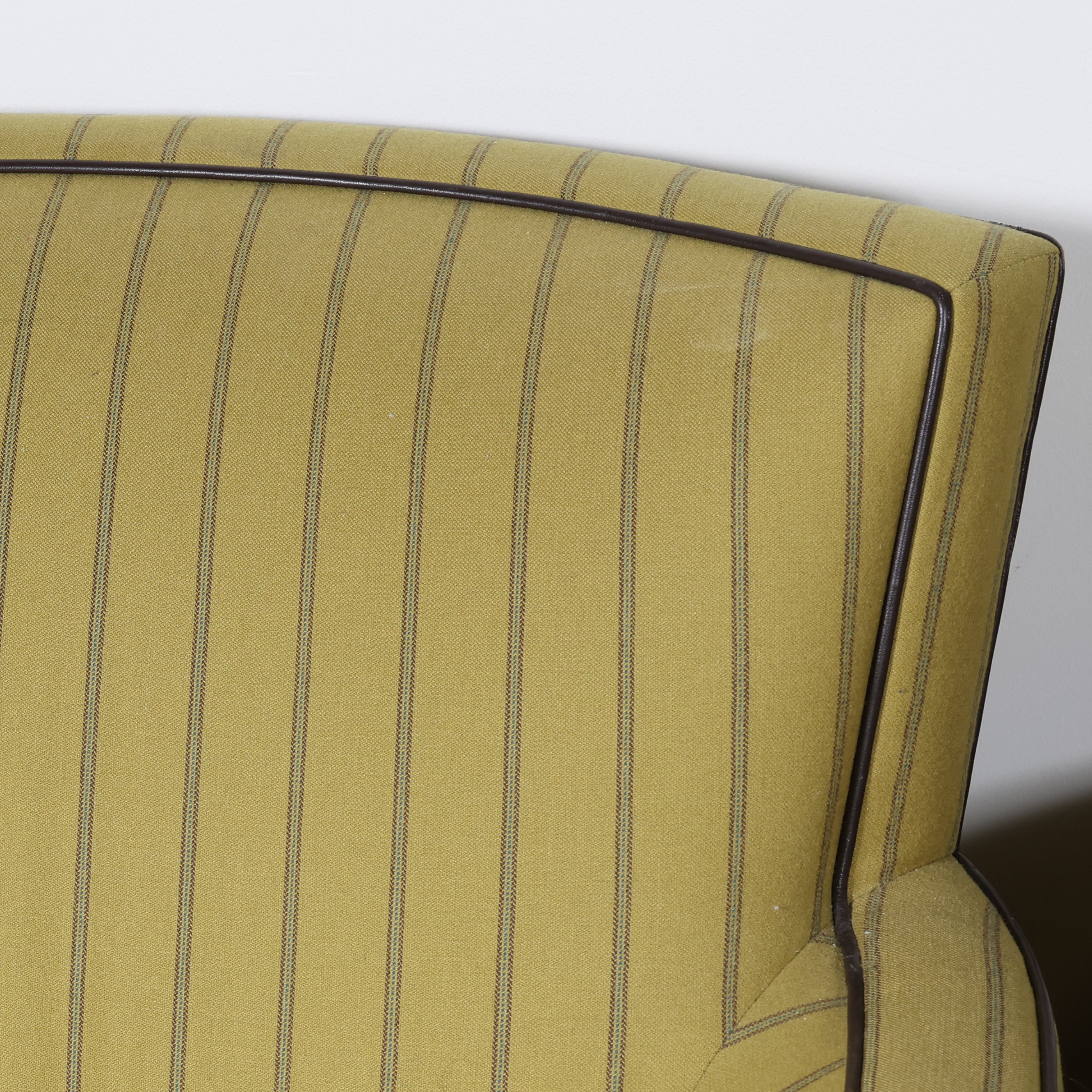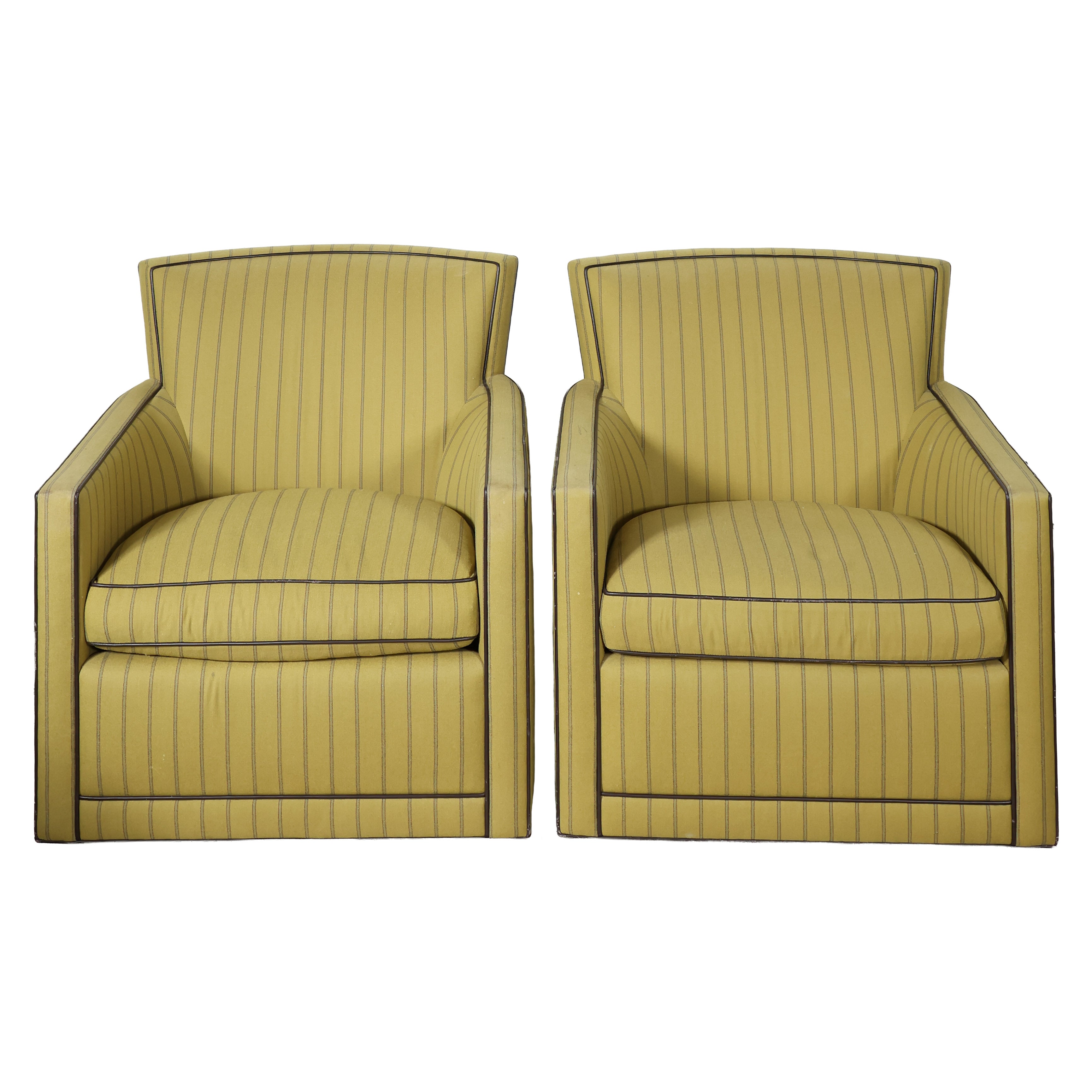 This pair of swivel chairs by A. Rudin features olive-toned striped upholstery accented with leather piping that crisply outlines the arms, cushions, and base. The clean, slightly angled arms and tight back give them a tailored, modern look, while the deep seat cushions keep them comfortable and inviting.